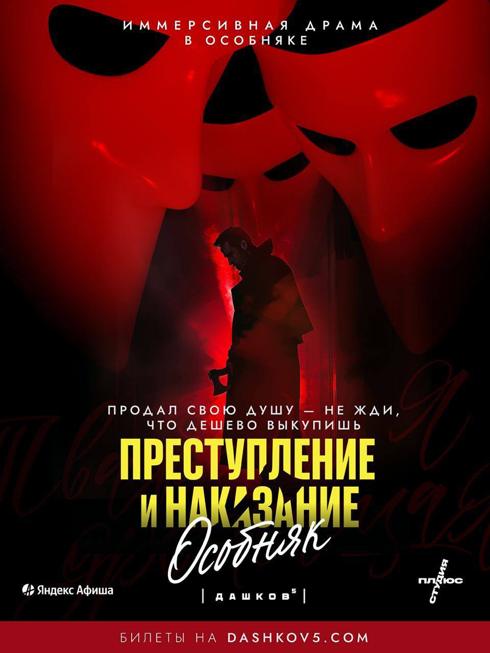 В ноябре в особняке “Дашков, 5” пройдут завершающие премьерные показы иммерсивной драмы “Преступление и наказание” по мотивам одноименного произведения Ф.М. Достоевского. Последние шоу можно будет посетить 10 ноября.