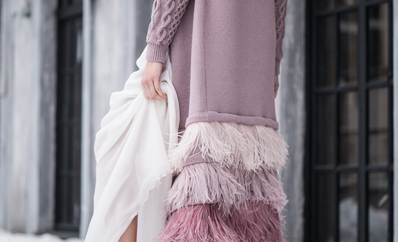 Кардиганы со страусиными перьями из Бразилии, кажется, венец вашего творчества. Сочетание шерсти и перьев очень экзотическое. Чем можно дополнить образ с таким кардиганов?
