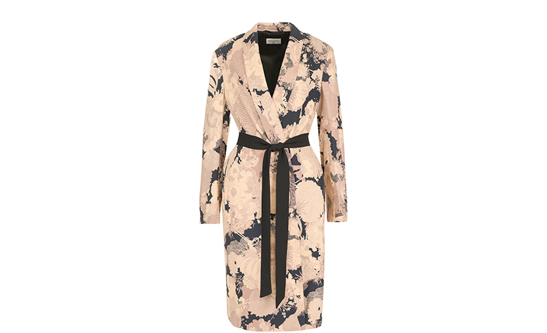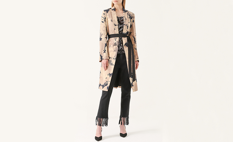 Легкое пальто, сшитое из вискозы и украшенное элегантным поясом.