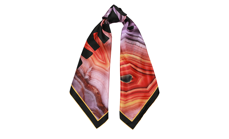 Создавая платок-каре, Рикардо Таши решил разместить посередине логотип и надпись «Paris”, отсылая таким образом к истории бренда. Первый показ коллекции Юбера де Живанши состоялся в 1953 году в Париже. Струящийся фактурный шелк и принт в виде разноцветных срезов минералов составили основу этого аксессуара.