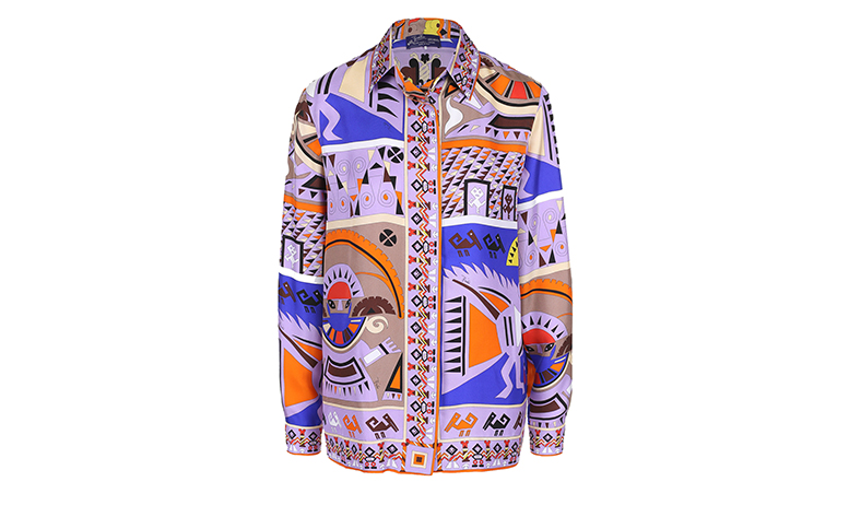 Незаурядный орнамент шелковой блузы прямого кроя в сочетании лиловых, оранжевых, синих цветов непременно выделит вас из толпы и обратит на вас внимание