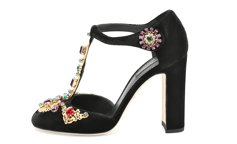 Модельеры всеми известного бренда Доминико Дольче и Стефано Габбана представили туфли Vally из коллекции весна-лето 2017, украшенные позолоченной филигранью и разноцветными кристаллами. Сшиты из прочного черного велюра, с ремешком с кнопкой, декорированной цветком из кристаллов, фасон на высоком устойчивом каблуке.
