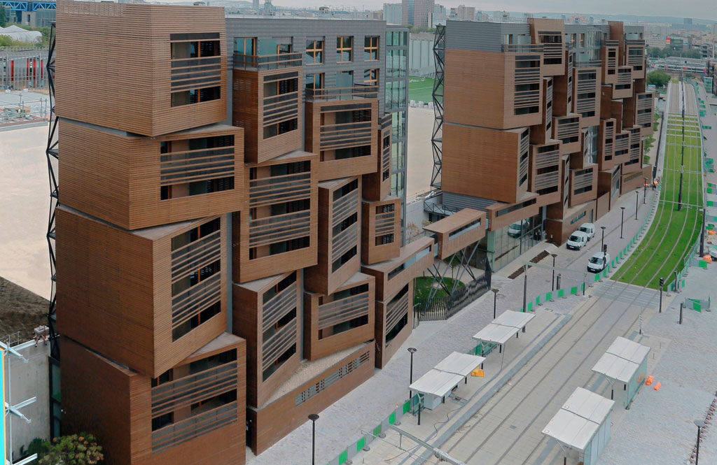 Недавно в Париже был сдан строительный объект под названием Basket Apartments, он представляет новое студенческое общежитие, спроектированное архитекторами компании OFIS Arhitekti. Здание расположено в 19 округе рядом с парком и под его строительство был отведен довольно сложный участок земли. Так, ширина конструкции составляет 11 метров, в то время как по длине она вытянута на 200 метров. Жилой комплекс разделен на два блока, соединенных между собой узким мостом, под которым разбит небольшой сад.