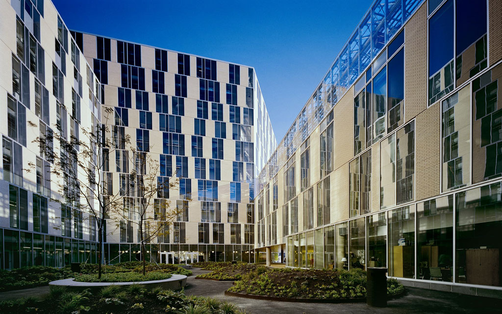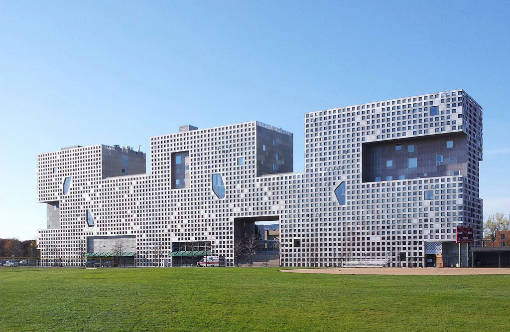 Здание буквально испещрено окнами и оттого напоминает пористую губку или улей, перенаселенный людьми. Впрочем, впечатление переполненности здания обитателями обманчиво: на самом деле на одну студенческую комнату здесь приходится не менее девяти, а то и двенадцать окошек! Снаружи окна выкрашены в яркие цвета. Дополнительная инсоляция и вентиляция обеспечены с помощью пущенных сквозь здание извилистых «пещер»: благодаря им то тут, то там над головами студентов возникают стеклянные кратеры, сквозь которые видно небо.