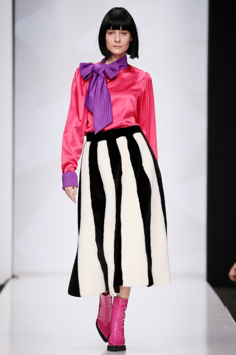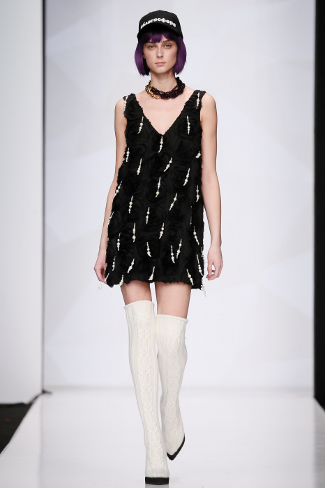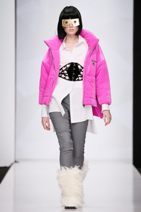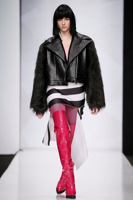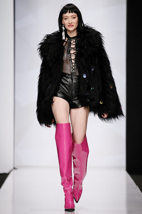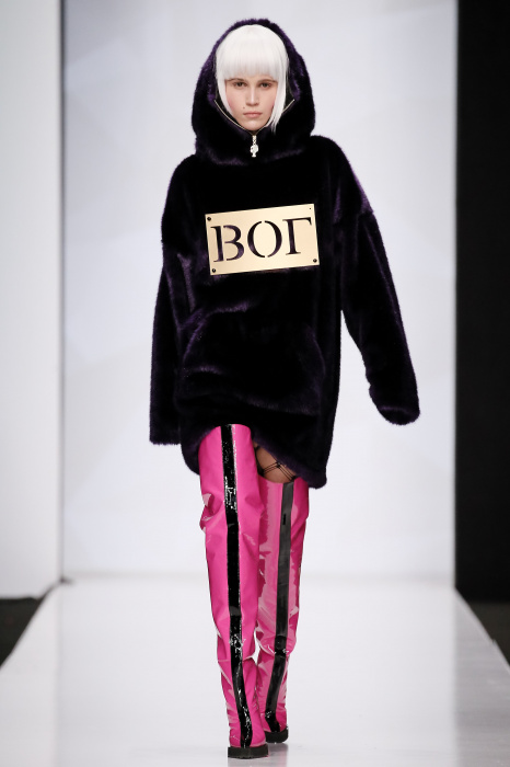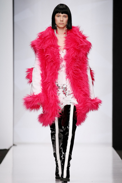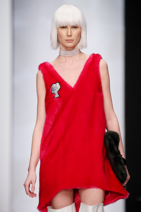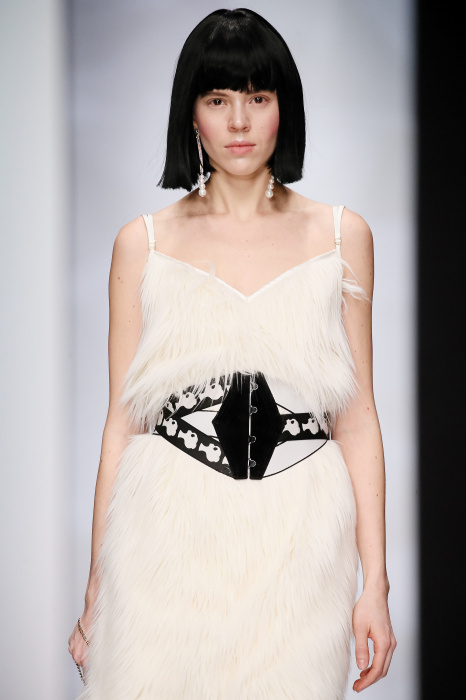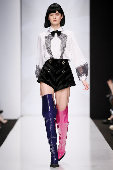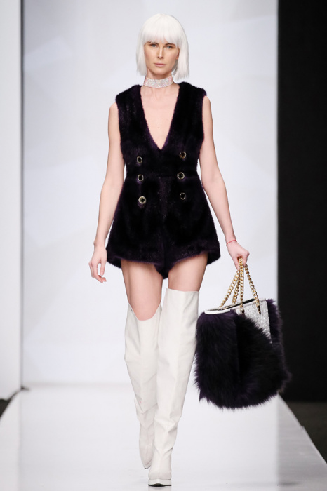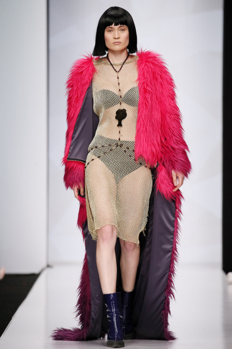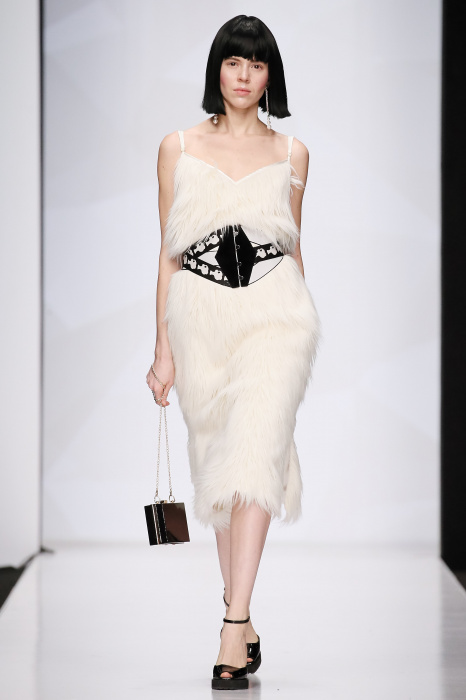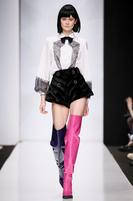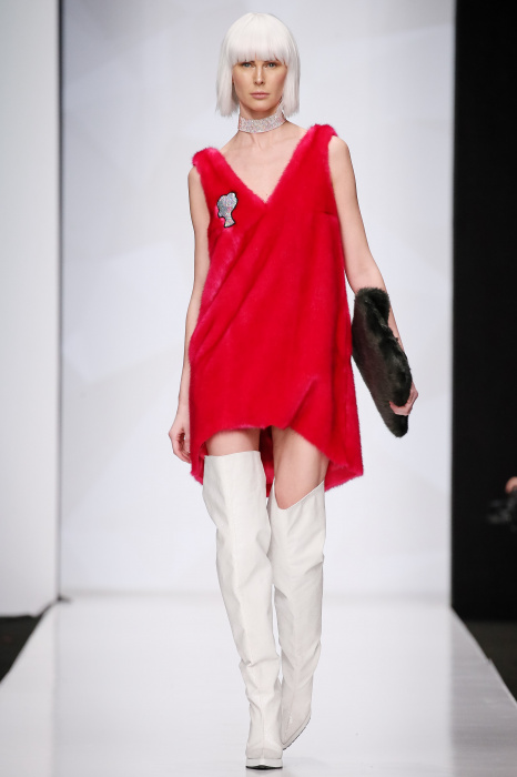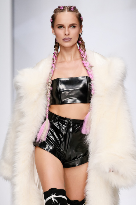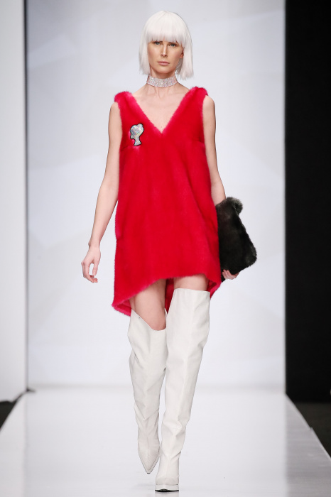 Вся коллекция дизайнера Bella Potemkina выполнена из модакрилового волокна Kanecaron, из которого создается высококачественный экомех. Цветовая палитра – яркая и многообразная. Это и фуксия, и пурпурный в сочетании с черно-белым монохромом – героиня бренда смелая, дерзкая, готовая к экспериментам. Все образы демонстрируют нарочитую небрежность, легкость, сексуальность и лоск. Короткие шорты, боди, ботфорты, лаковая кожа, пайетки и двубортные платья – никаких предрассудков, только смелое воплощение.