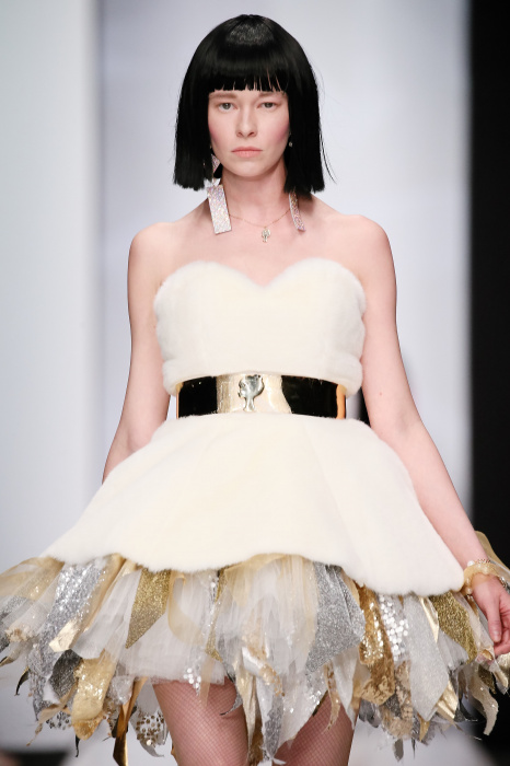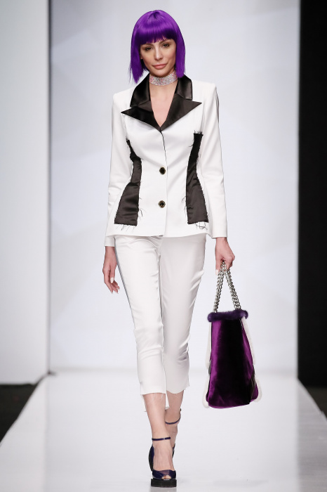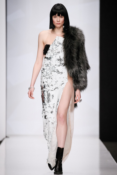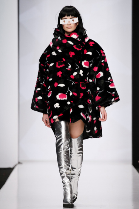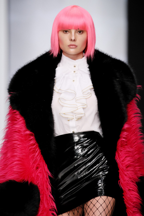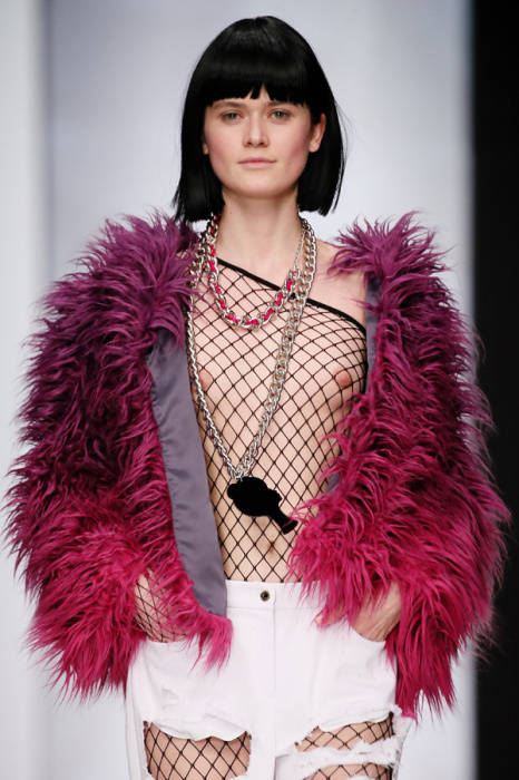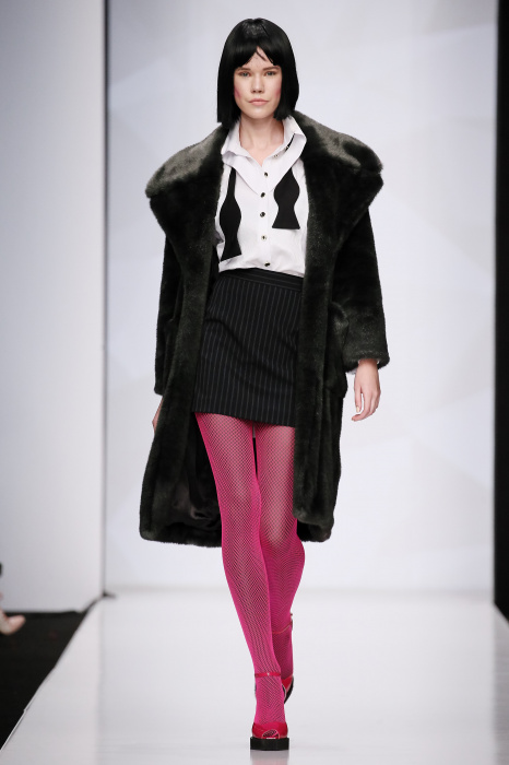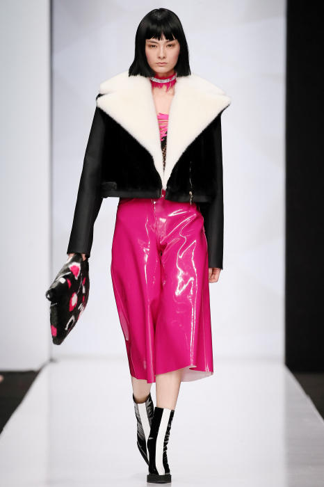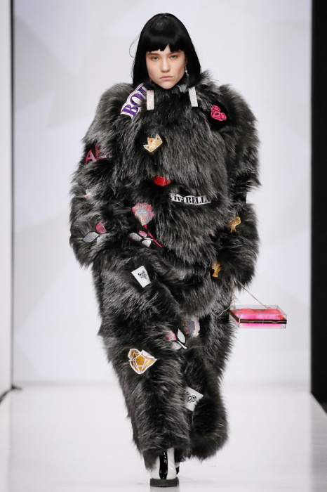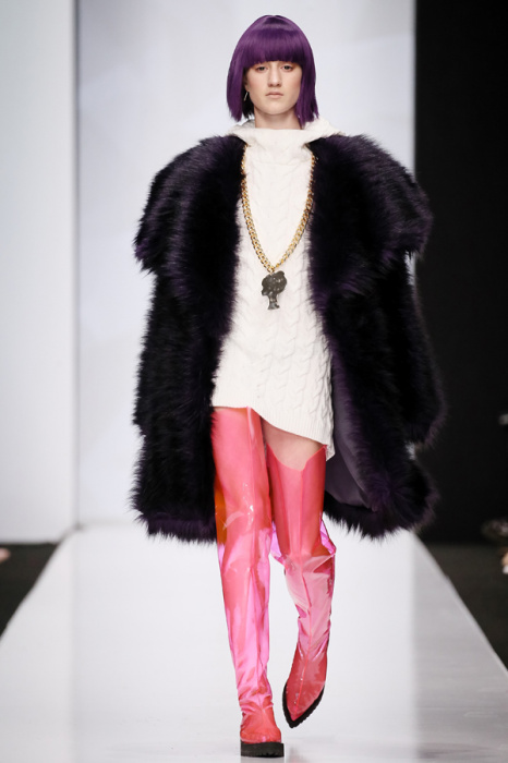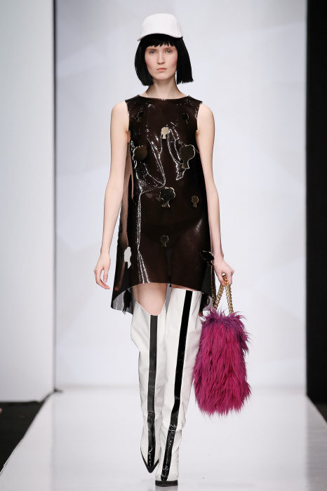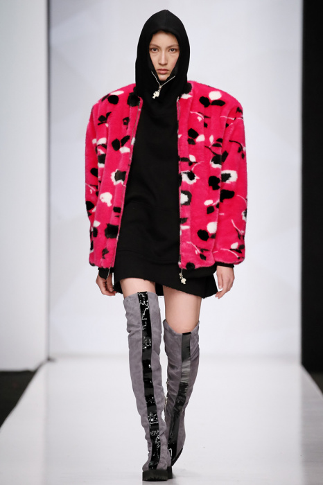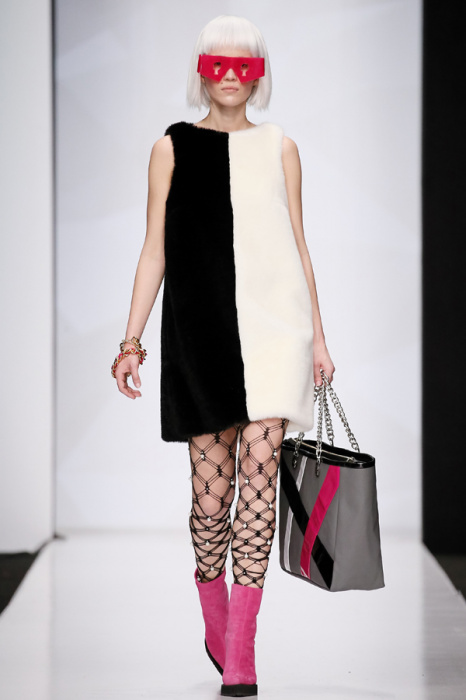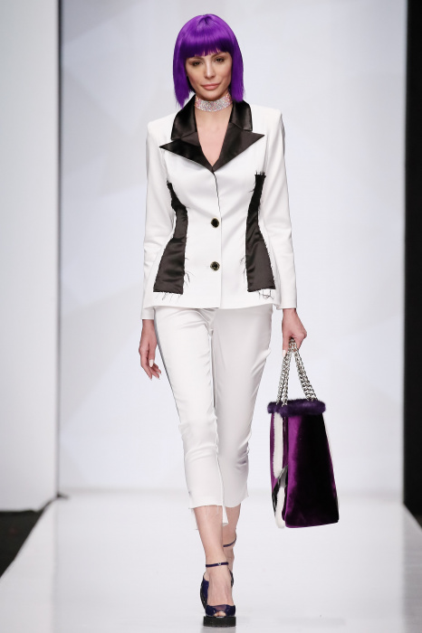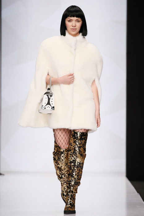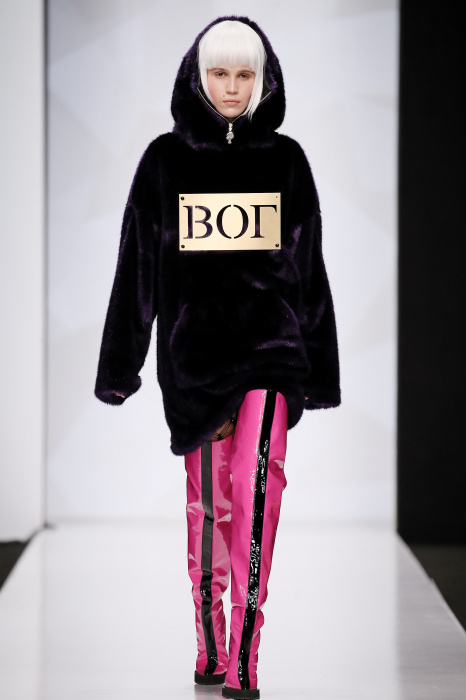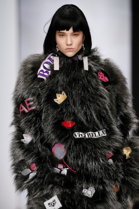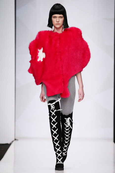 Вся коллекция дизайнера Bella Potemkina выполнена из модакрилового волокна Kanecaron, из которого создается высококачественный экомех. Цветовая палитра – яркая и многообразная. Это и фуксия, и пурпурный в сочетании с черно-белым монохромом – героиня бренда смелая, дерзкая, готовая к экспериментам. Все образы демонстрируют нарочитую небрежность, легкость, сексуальность и лоск. Короткие шорты, боди, ботфорты, лаковая кожа, пайетки и двубортные платья – никаких предрассудков, только смелое воплощение.