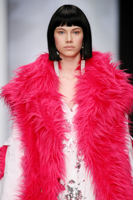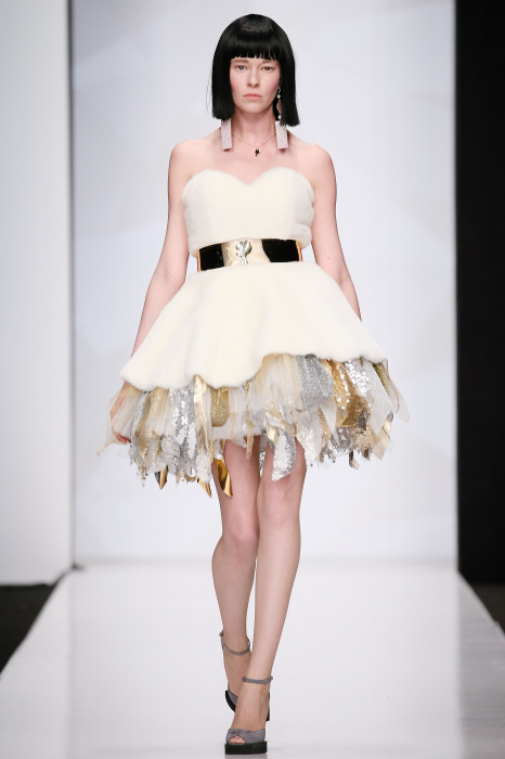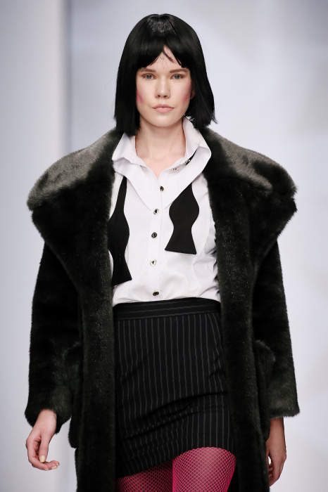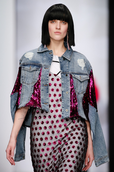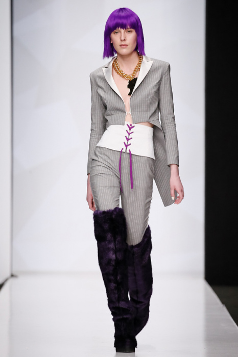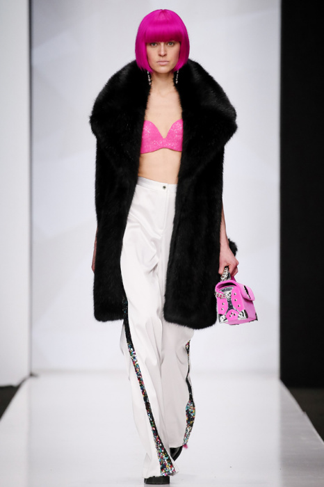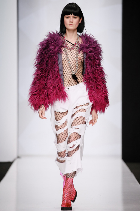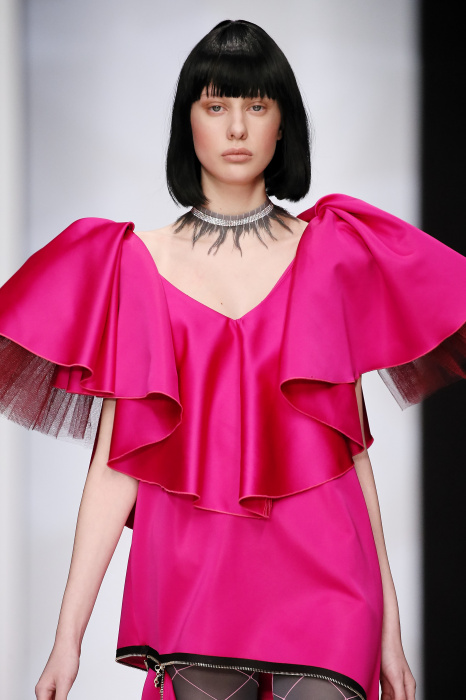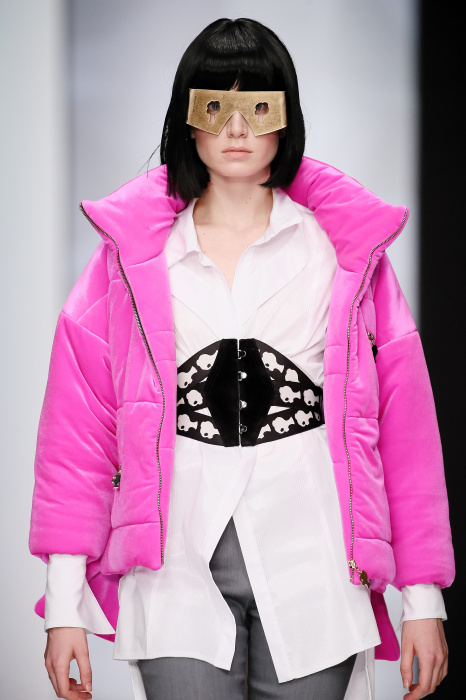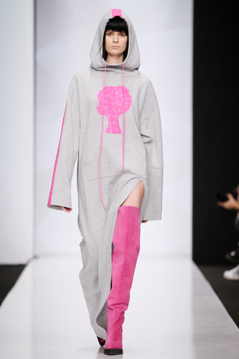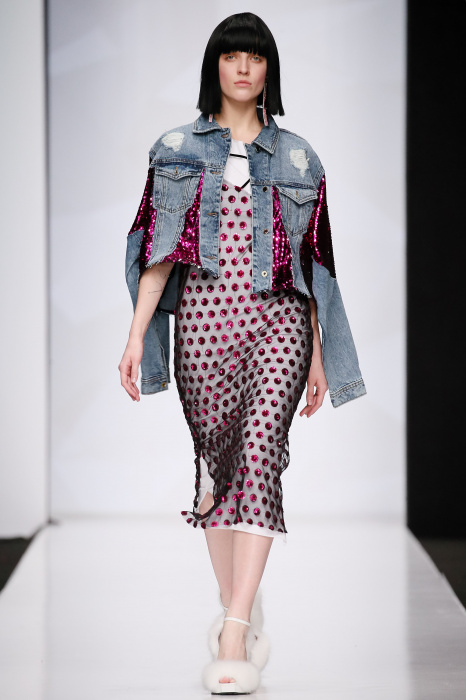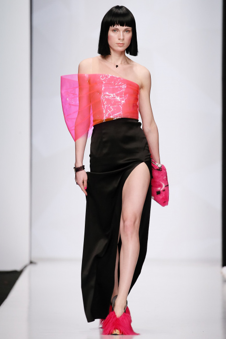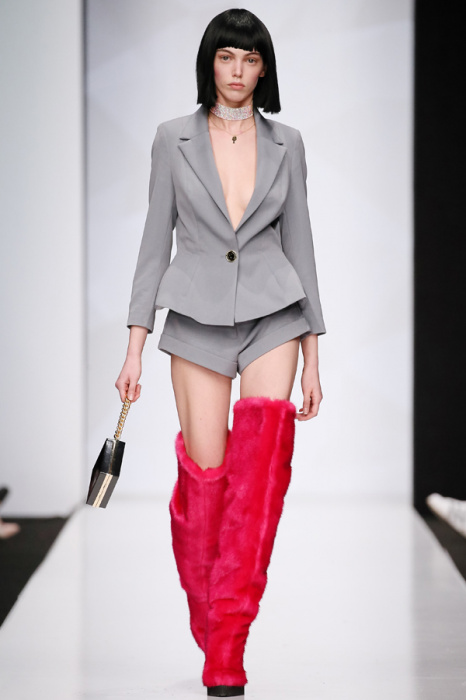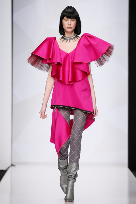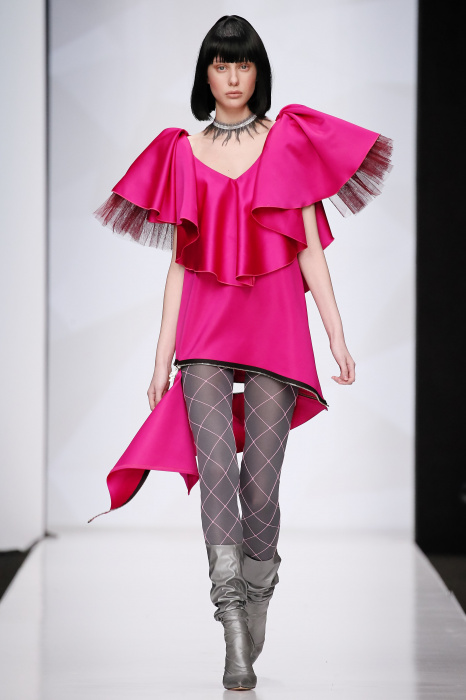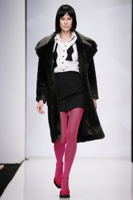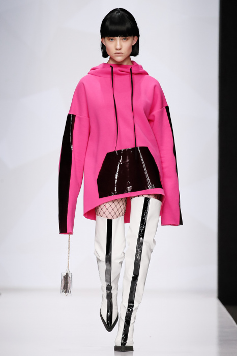 Вся коллекция дизайнера Bella Potemkina выполнена из модакрилового волокна Kanecaron, из которого создается высококачественный экомех. Цветовая палитра – яркая и многообразная. Это и фуксия, и пурпурный в сочетании с черно-белым монохромом – героиня бренда смелая, дерзкая, готовая к экспериментам. Все образы демонстрируют нарочитую небрежность, легкость, сексуальность и лоск. Короткие шорты, боди, ботфорты, лаковая кожа, пайетки и двубортные платья – никаких предрассудков, только смелое воплощение.