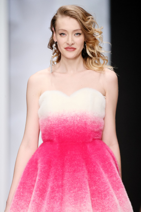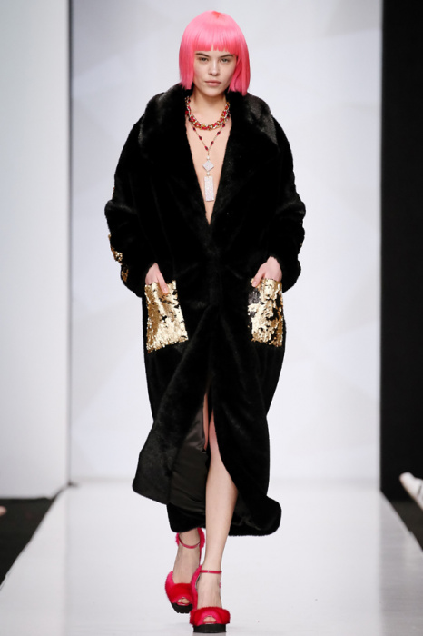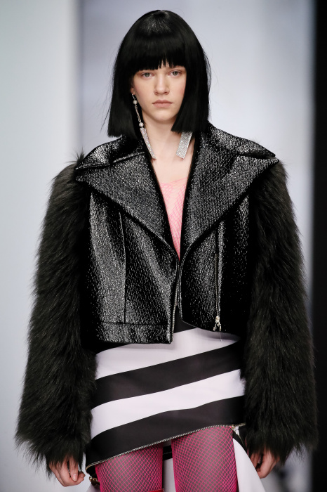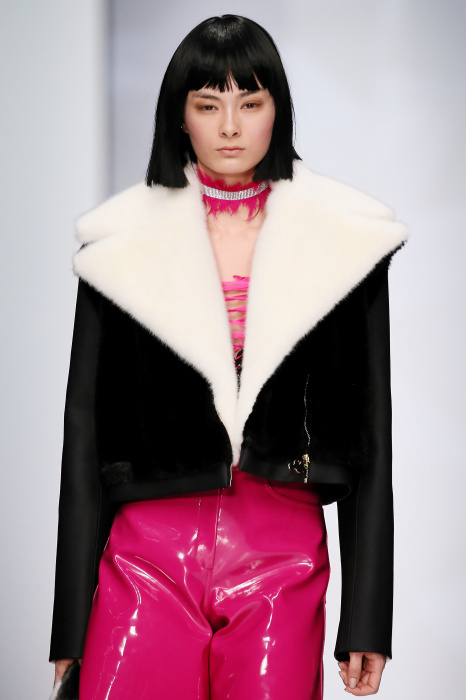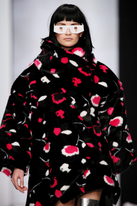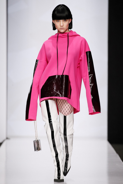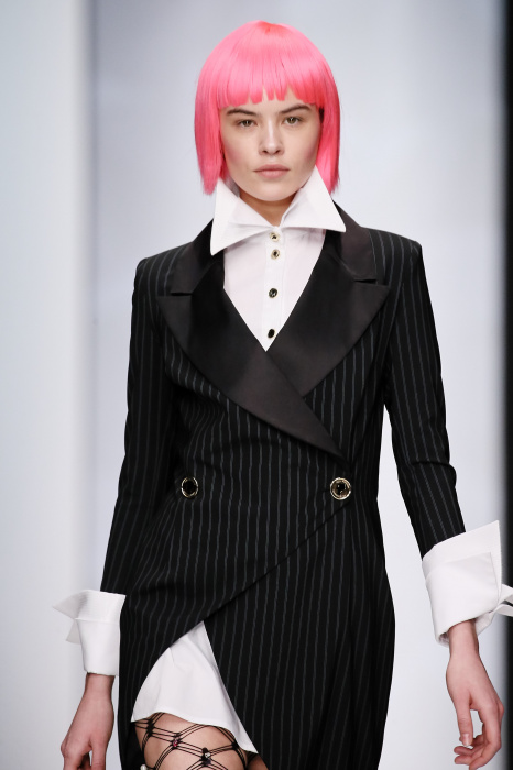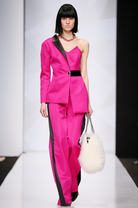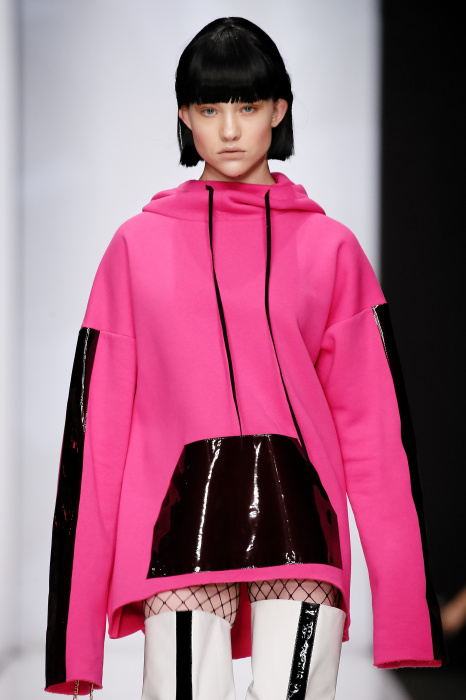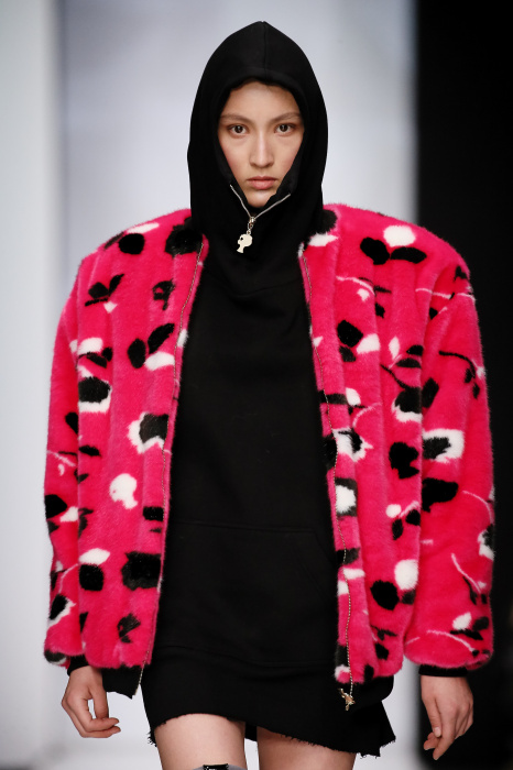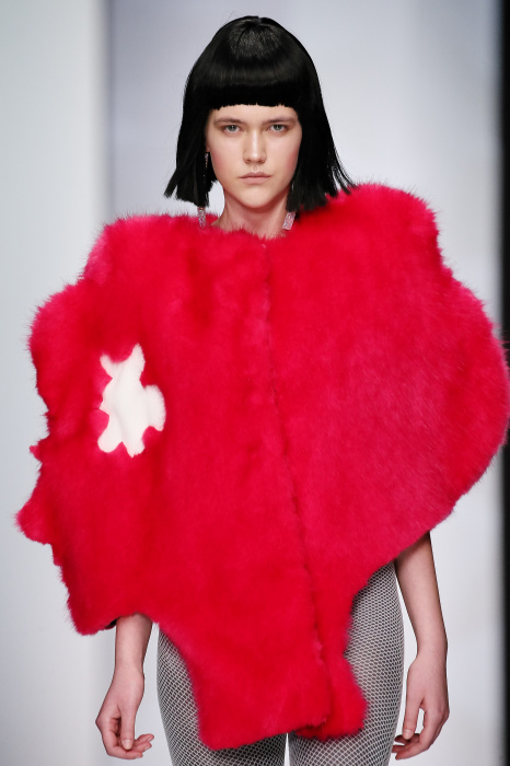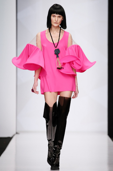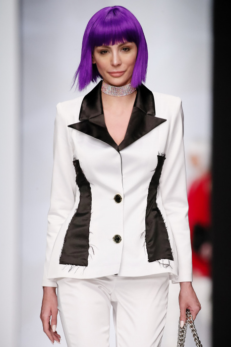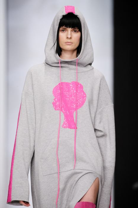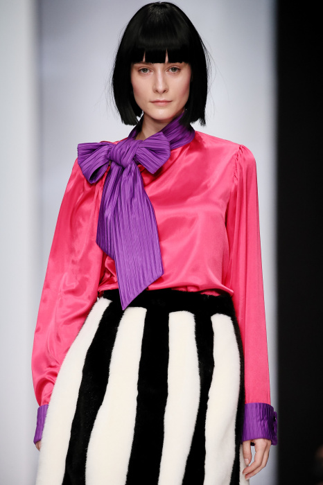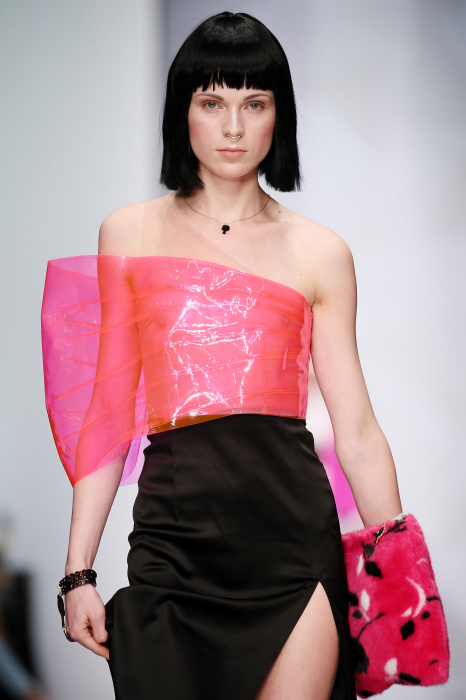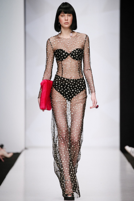 Вся коллекция дизайнера Bella Potemkina выполнена из модакрилового волокна Kanecaron, из которого создается высококачественный экомех. Цветовая палитра – яркая и многообразная. Это и фуксия, и пурпурный в сочетании с черно-белым монохромом – героиня бренда смелая, дерзкая, готовая к экспериментам. Все образы демонстрируют нарочитую небрежность, легкость, сексуальность и лоск. Короткие шорты, боди, ботфорты, лаковая кожа, пайетки и двубортные платья – никаких предрассудков, только смелое воплощение.