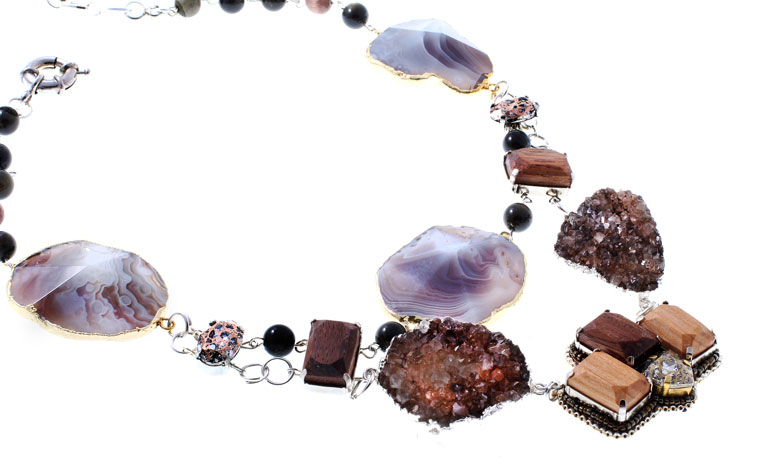 До недавнего времени это были по большей степени вечерние украшения, крупные колье с натуральными камнями, драгоценными и полудрагоценными, такими как агаты, рубины, яшма, цитрины и многие другие, жемчугом, компонентами Сваровски - крупные серьги, браслеты, создаваемые для торжеств и светских выходов, но я решила расширить эту нишу, во-первых, освоить новые технологии производства, во-вторых сделать украшения более современными, более понятными покупателю, их проще сочетать и носить, к тому же я начала использовать больше материалов: дерево, металл, . В наше время вечной нехватки времени и ресурсов, когда каналы информации перегружены, сложно остановить и достучаться до нового покупателя, долго и красочно рассказывая ему об уникальности и ценности, многочасовом ручном труде, эксклюзивных материалах, особых ювелирных техниках и тд, особенно это относится к крупным городам, поговорка «Лучшее – враг хорошего» для меня актуальна. Важна универсальность и доступность, емкость и лаконичность, чтобы было интересно, просто и непросто одновременно. Моя прошлая коллекция частично состоит из таких украшений – одно и тоже колье можно надеть, например, с платьем на вечер, и с майкой или рубашкой в рамках повседневного формата, или есть в коллекции крупные объемные серьги, они станут идеальным спутником и на свидание, и в клуб, и в офис, при этом сами созданы самодостаточным украшением, требующим в качестве дополнения лишь однотонное черное платье. Я и сама с удовольствием их ношу.