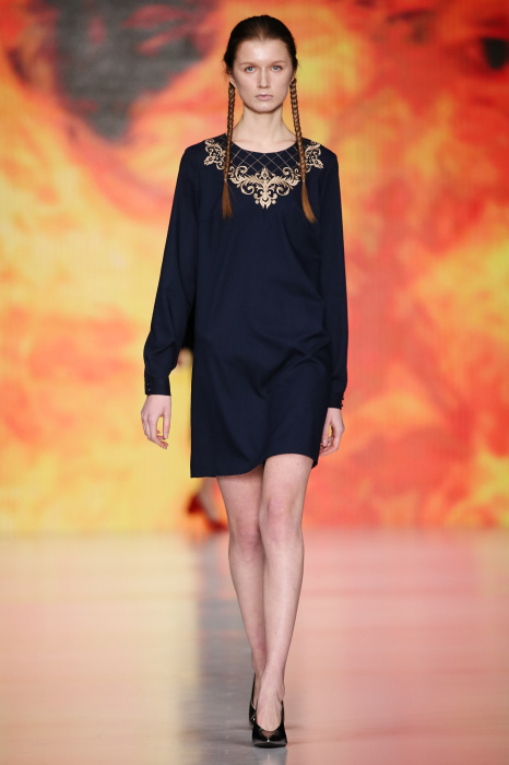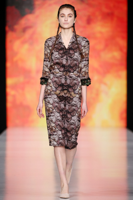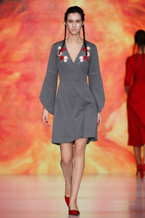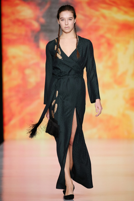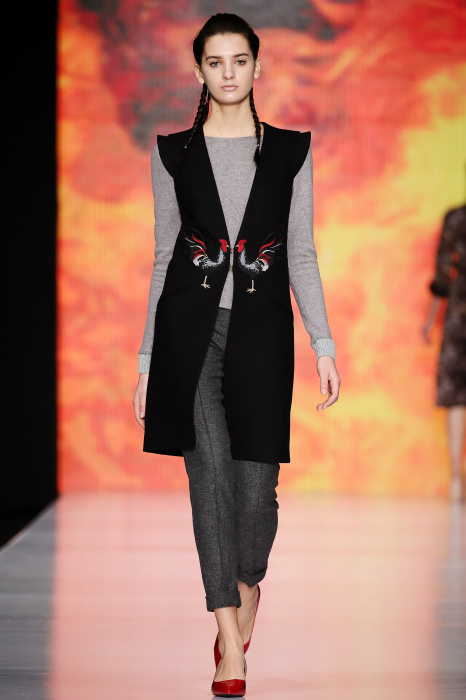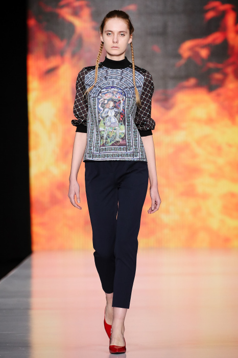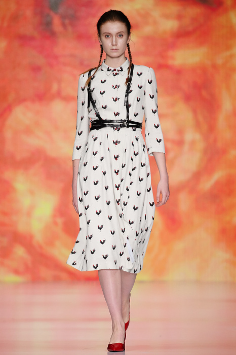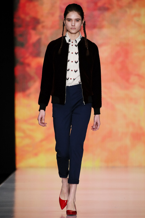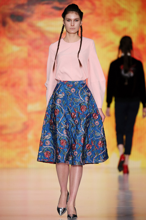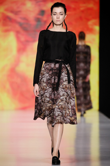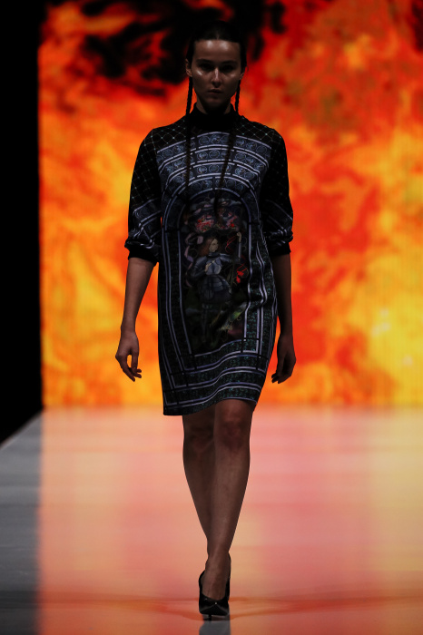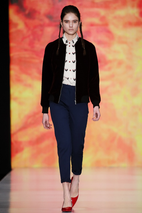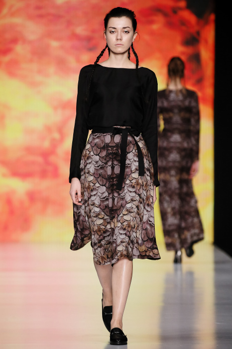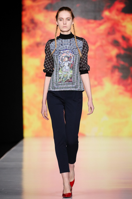 Ksenia Knyazeva вдохновилась многогранностью женщины. Героиней коллекции стала Жанна Д'Арк, соединяющая хрупкость и воинственность, открытость и тайну. Сочетание воплотилось в минималистичных приталенных платьях, свитшотах и пальто-халатах, украшенных отделкой из перьев и вышивкой в форме петуха.