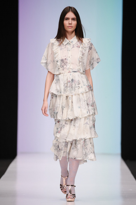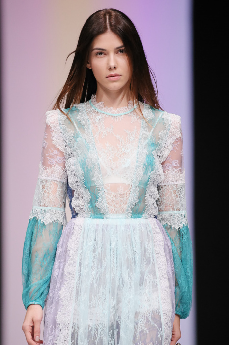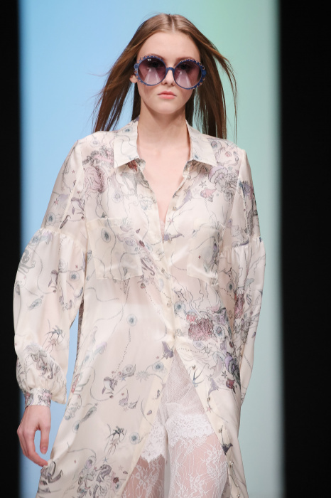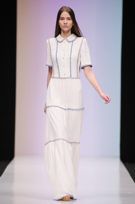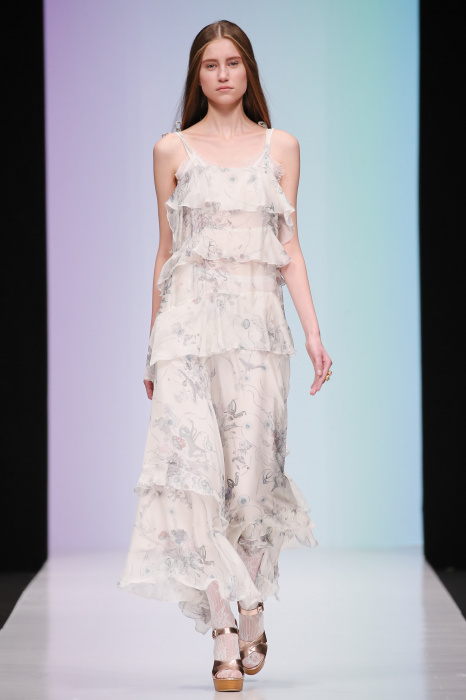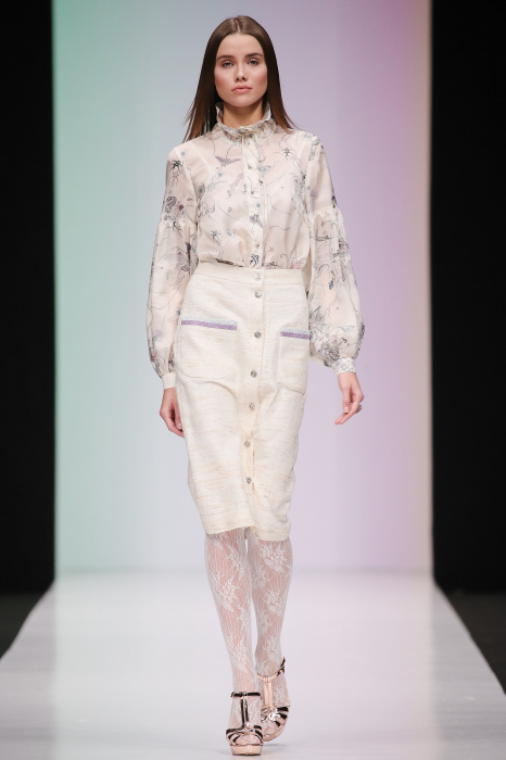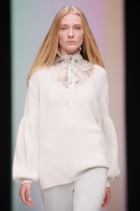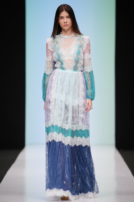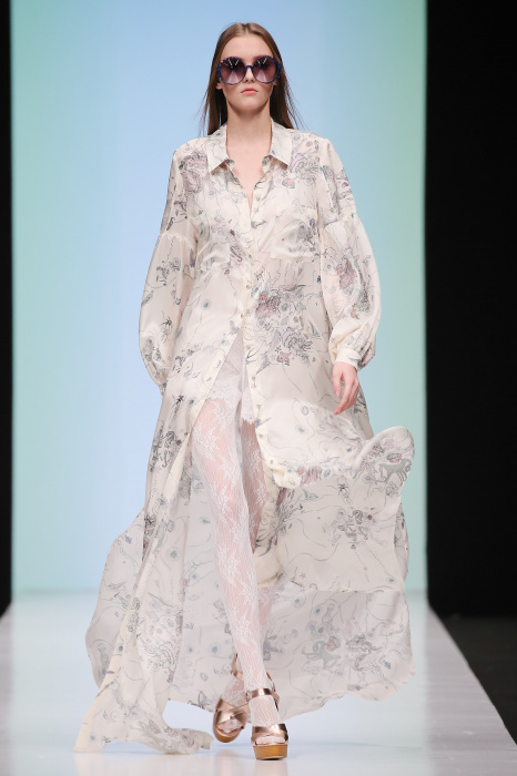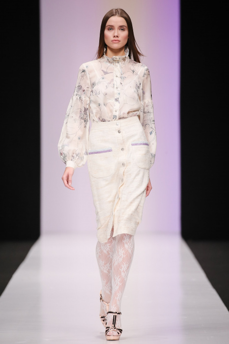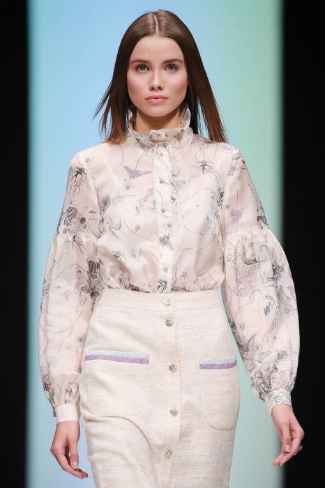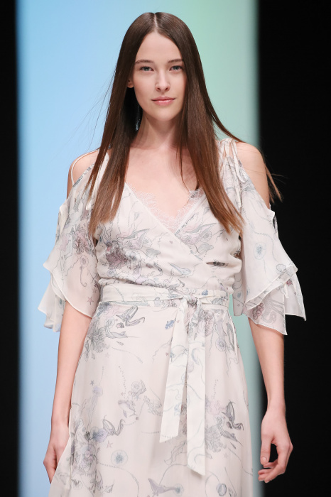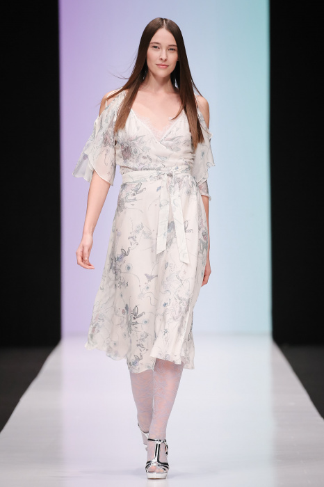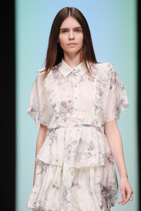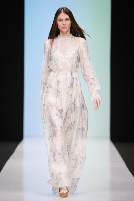 Женственная коллекция LAROOM дизайнера Евгении Легкодымовой предназначена для ценящих уточненную сексуальность. Легкие, светлые, летящие полупрозрачные ткани, на которых распускаются нежные, будто прорисованные тонкой кистью цветы и зыбкая морская пена. Блузы с прозрачными расклешенными рукавами, сочетания небесной бирюзы с цикломеновым, разноярусно сконструированные платья макси длины – на подиуме господствовала гармония и стильная красота. Выбор тканей продуман до мелочей: здесь и гипюр, и шелковый лен, и джинса.