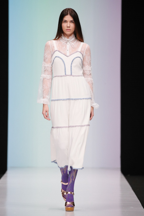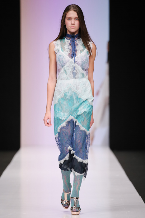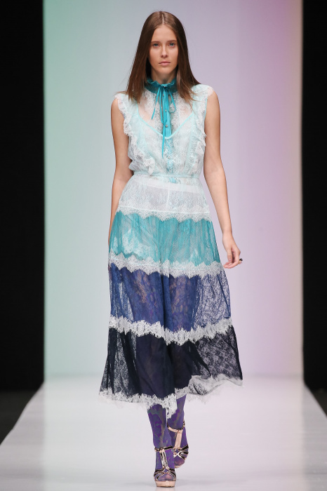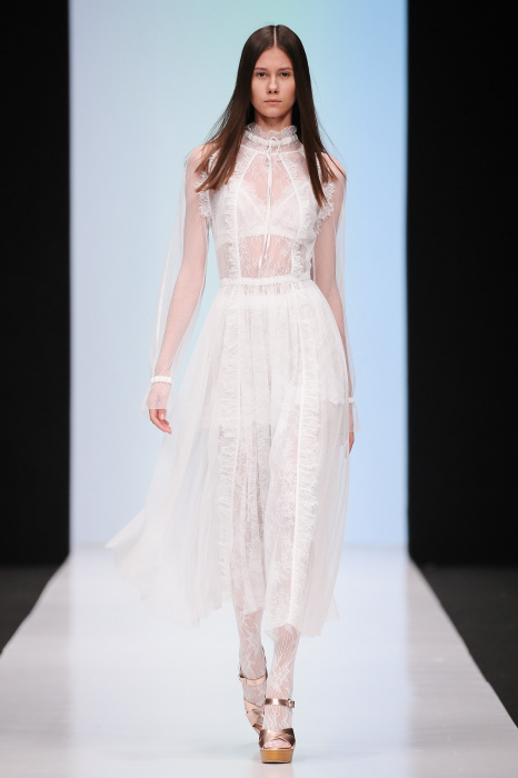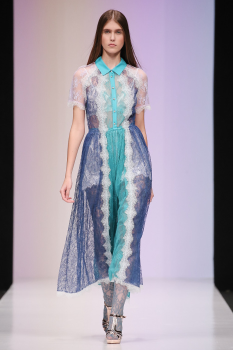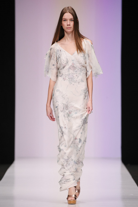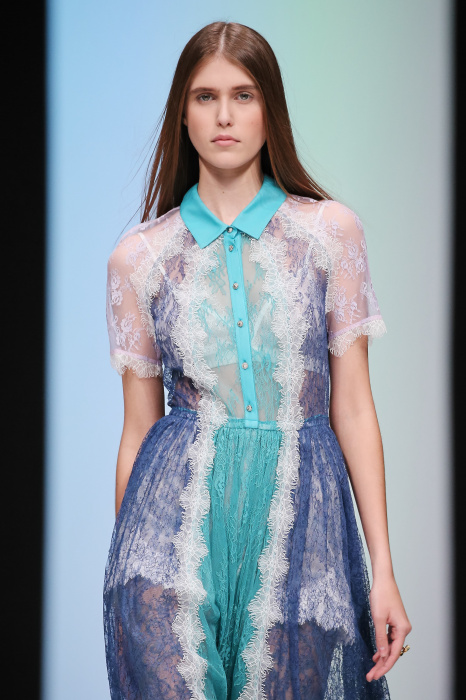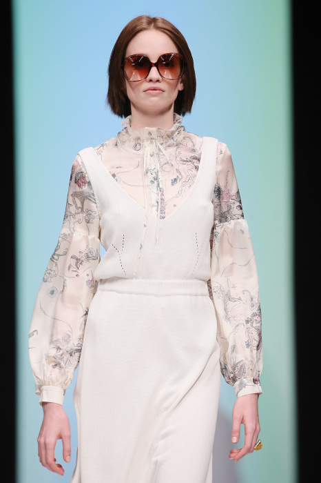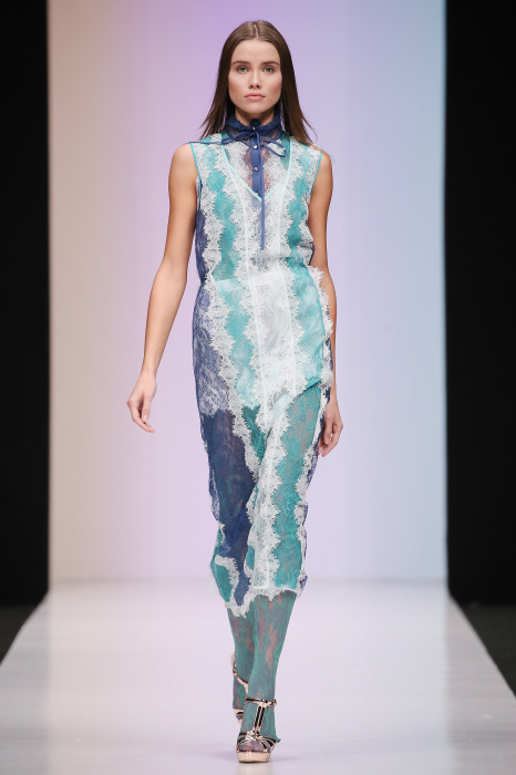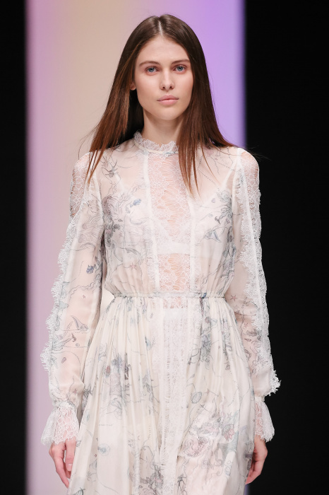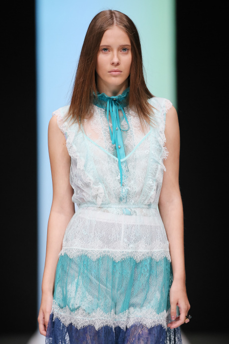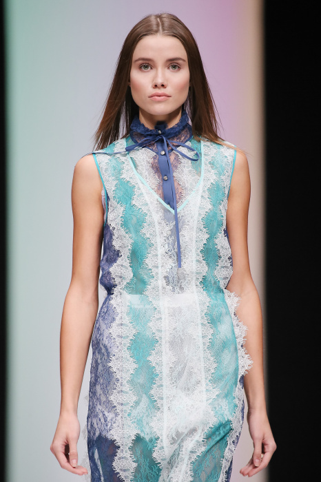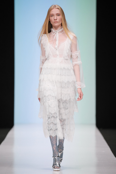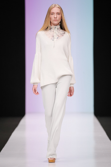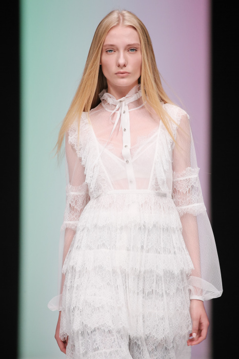 Женственная коллекция LAROOM дизайнера Евгении Легкодымовой предназначена для ценящих уточненную сексуальность. Легкие, светлые, летящие полупрозрачные ткани, на которых распускаются нежные, будто прорисованные тонкой кистью цветы и зыбкая морская пена. Блузы с прозрачными расклешенными рукавами, сочетания небесной бирюзы с цикломеновым, разноярусно сконструированные платья макси длины – на подиуме господствовала гармония и стильная красота. Выбор тканей продуман до мелочей: здесь и гипюр, и шелковый лен, и джинса.