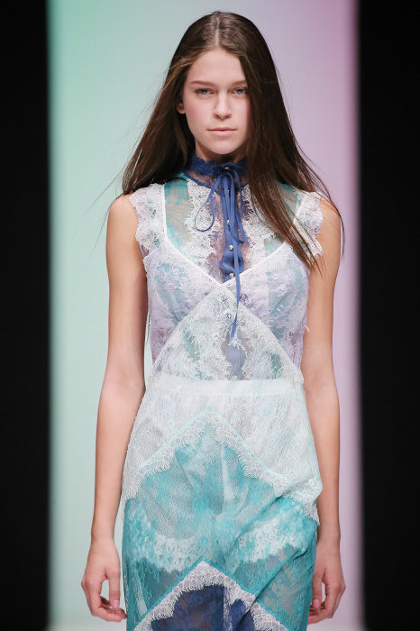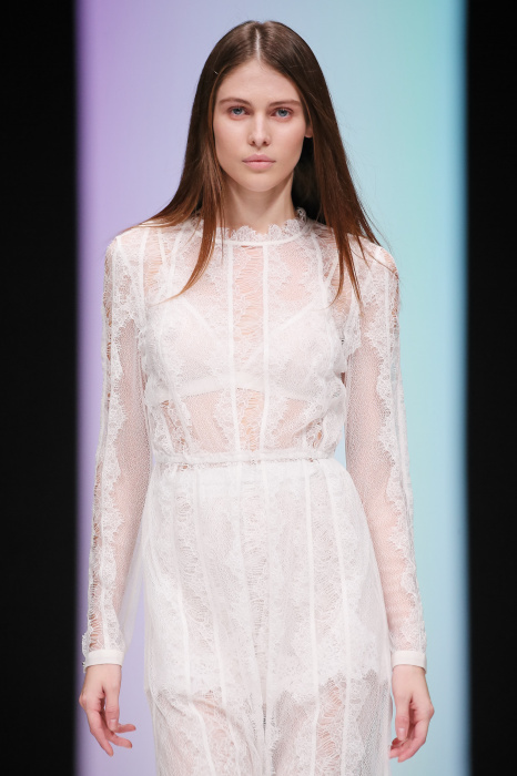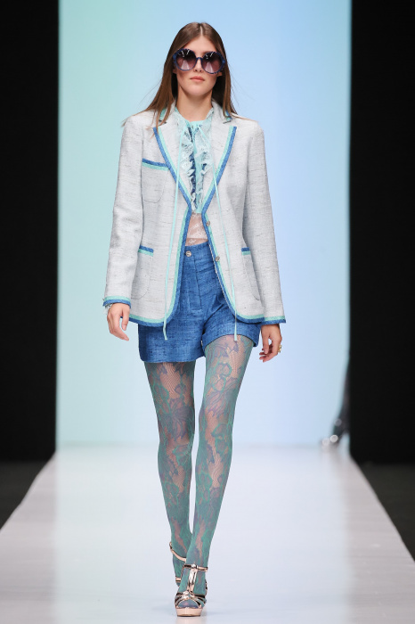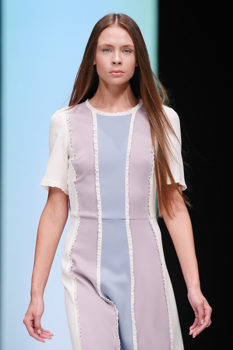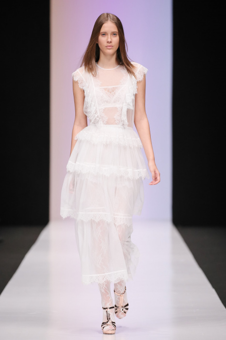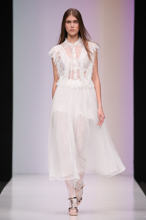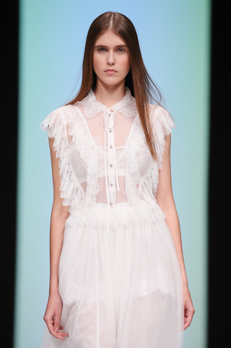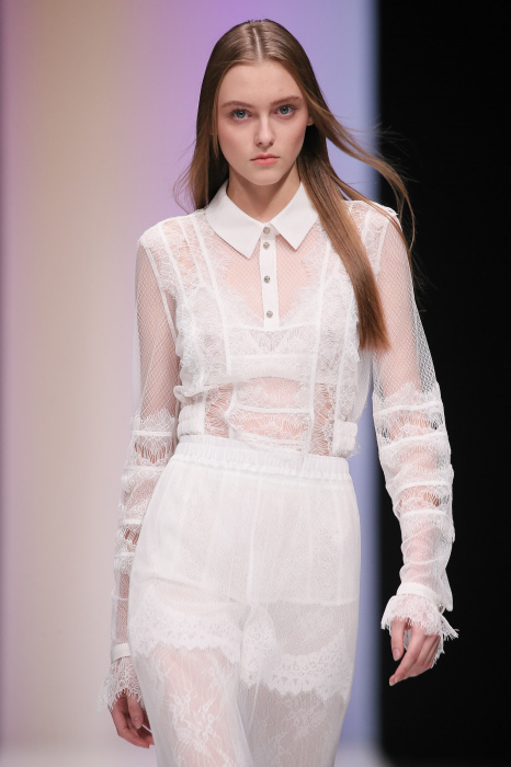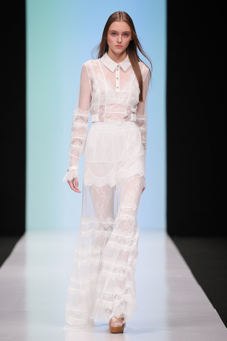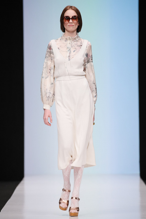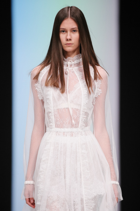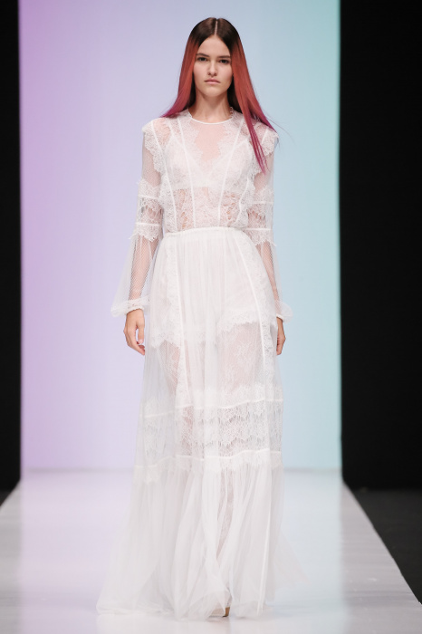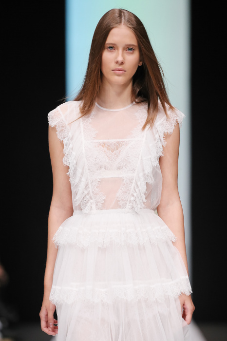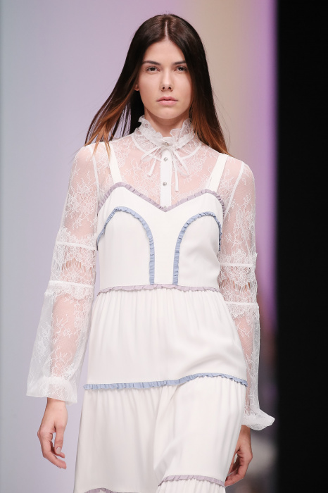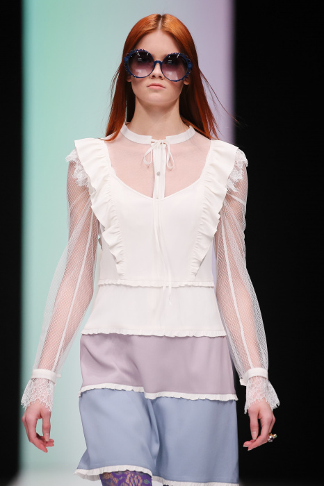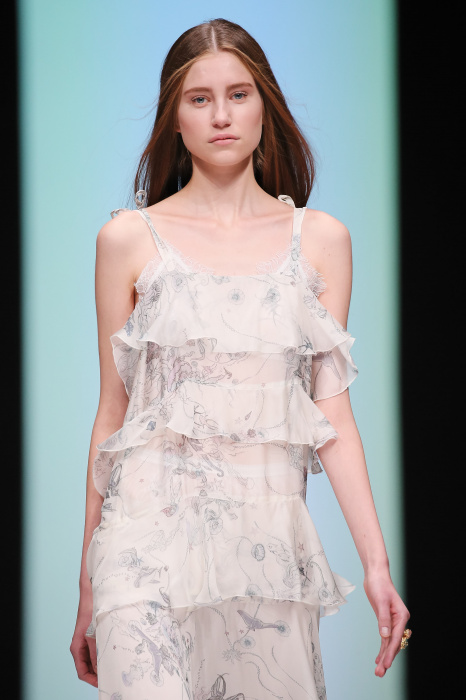Женственная коллекция LAROOM дизайнера Евгении Легкодымовой предназначена для ценящих уточненную сексуальность. Легкие, светлые, летящие полупрозрачные ткани, на которых распускаются нежные, будто прорисованные тонкой кистью цветы и зыбкая морская пена. Блузы с прозрачными расклешенными рукавами, сочетания небесной бирюзы с цикломеновым, разноярусно сконструированные платья макси длины – на подиуме господствовала гармония и стильная красота. Выбор тканей продуман до мелочей: здесь и гипюр, и шелковый лен, и джинса.