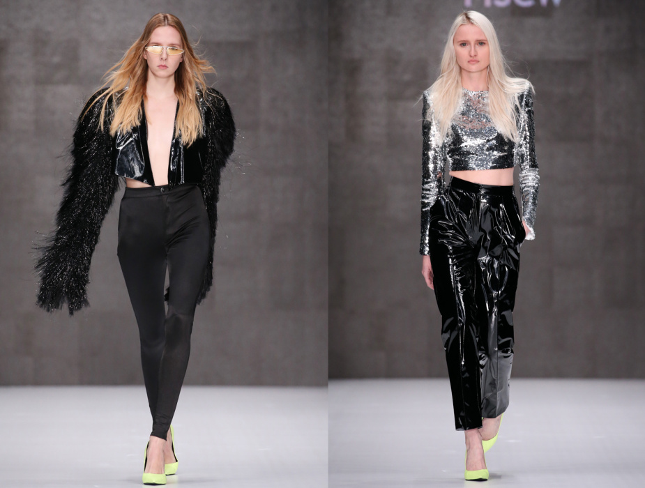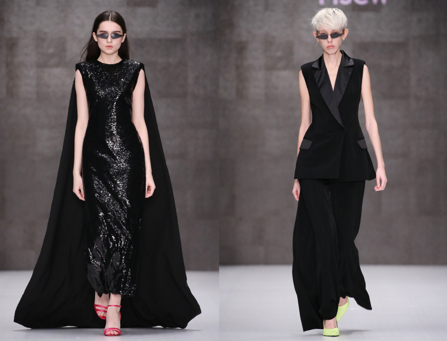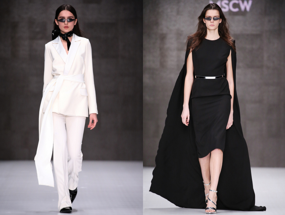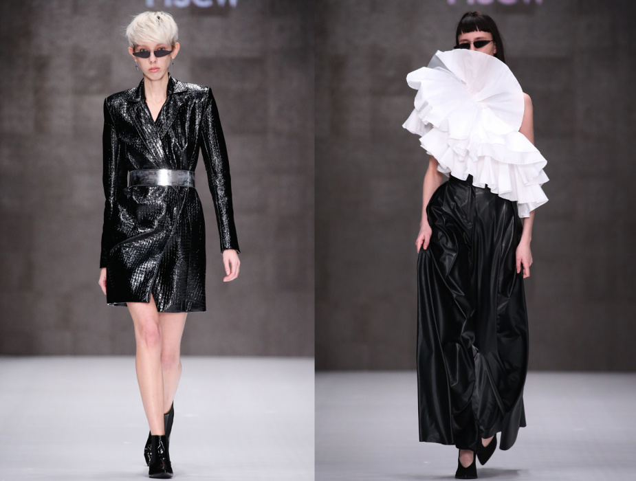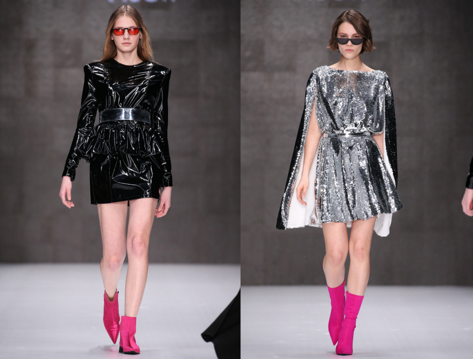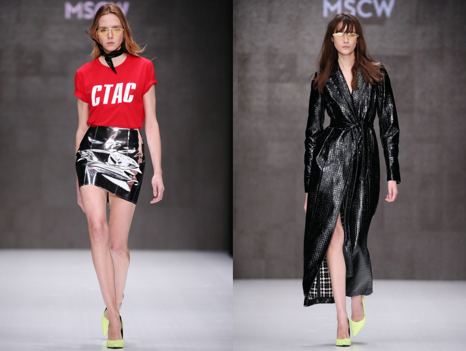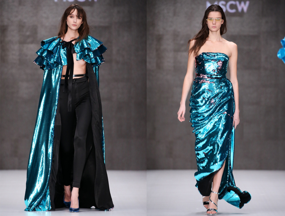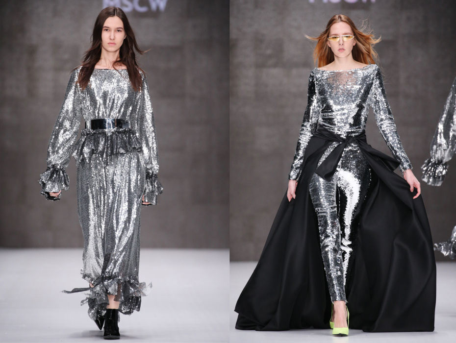 Коллекция бренда ARUT MSCW — один сплошной праздник, где дизайнер призывает всех блестеть как настоящий диско-шар в ночном клубе. Показ начался с выхода модели в короткой виниловой юбке серебристого оттенка и майке с яркой надписью «Стас». В коллекции определенно чувствуется бунтарский дух рок-н-ролла и призыв к свободе. Тема 70-х и диско затрагивается особо остро: доминирующий серебристый цвет, золотые металлические поясы, комбинезоны в пайетках — все это отчетливо напоминает ушедшую эпоху. Блестящей оказалась не только одежда моделей, но и обувь, целиком усыпанная пайетками. Дизайнер не боится комбинировать сложные цвета и оттенки, например, лазурные платья в блестках сочетаются с туфлями салатового цвета, а цвет фуксия — с оттенком золота. Также в коллекции присутствуют широкие воланы, классический белоснежный костюм и длинные плащи, имитирующие кожу питона.