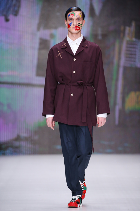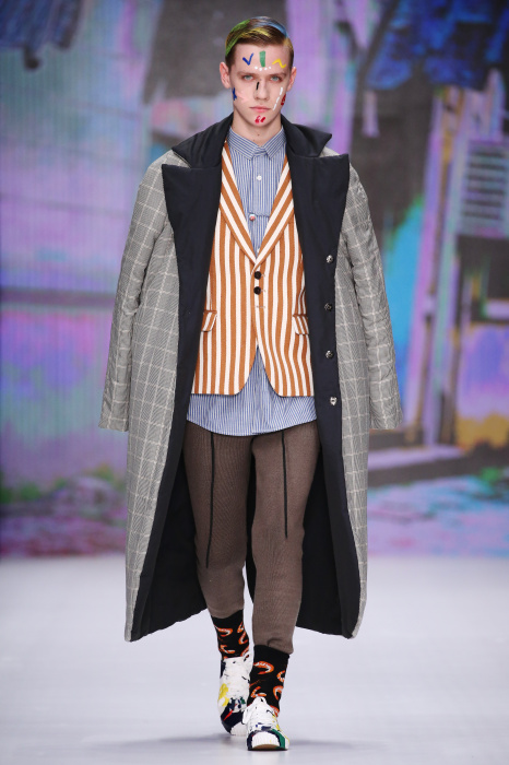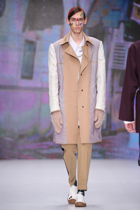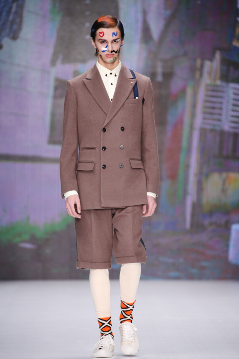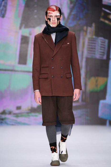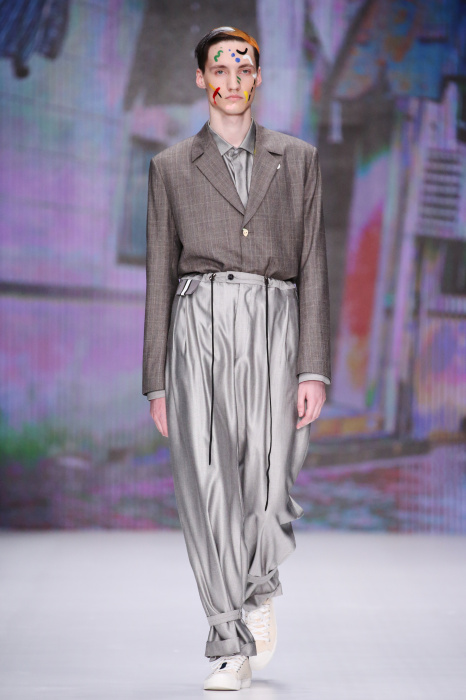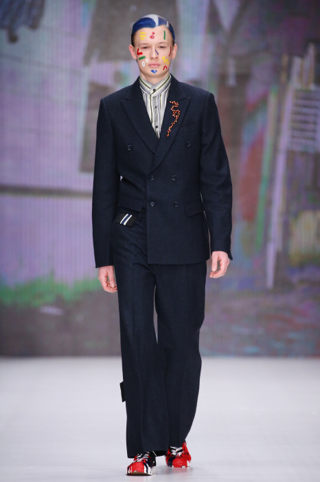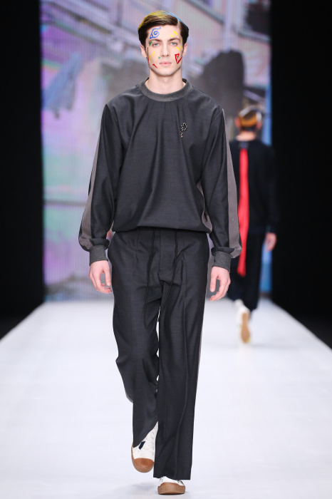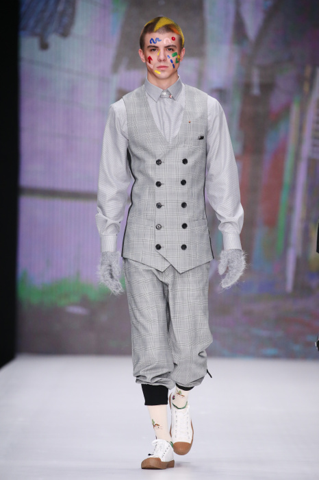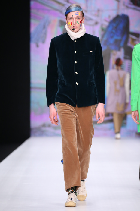 Показ бренда Artem Shumov в своей новой коллекции ломает стереотипы относительно классики. Модели-мужчины выходят на подиум в пиджаках, заправленных в спортивные брюки, в сочетании с разрисованными лицами и разноцветными волосами. Другое дизайнерское решение — несколько слоев верхней одежды. Спортивные укороченные брюки украшают генеральские лампасы, а аксессуаром в образе выступают меховые перчатки. Не обошлось без ярких акцентов: многоцветные платки, дутые пальто и белые кеды с красочным принтом. Главными цветами в коллекции стали: серый, темно-синий, коричневый, салатовый и даже пастельные тона. Из материалов дизайнер использовал также бархат и внес некий фан в строгие пиджаки, украсив их пуговицами всевозможных цветов.