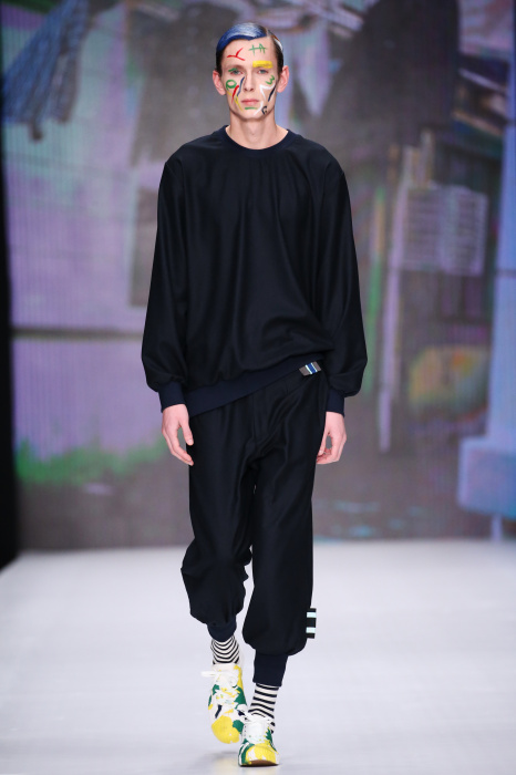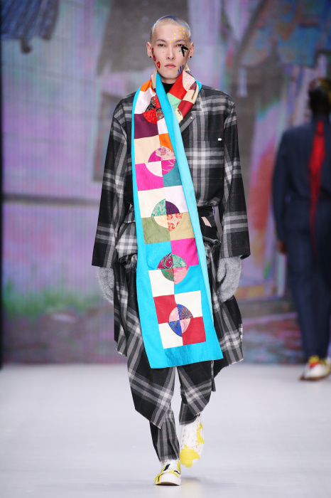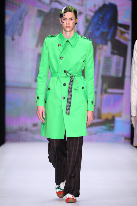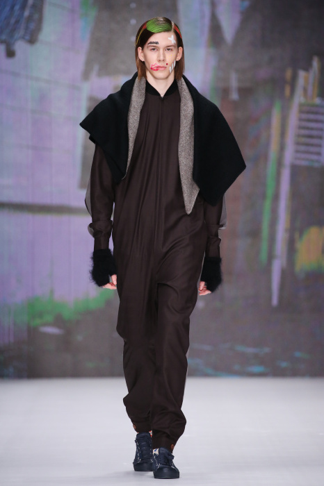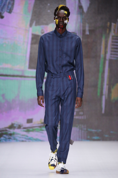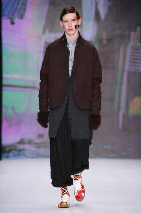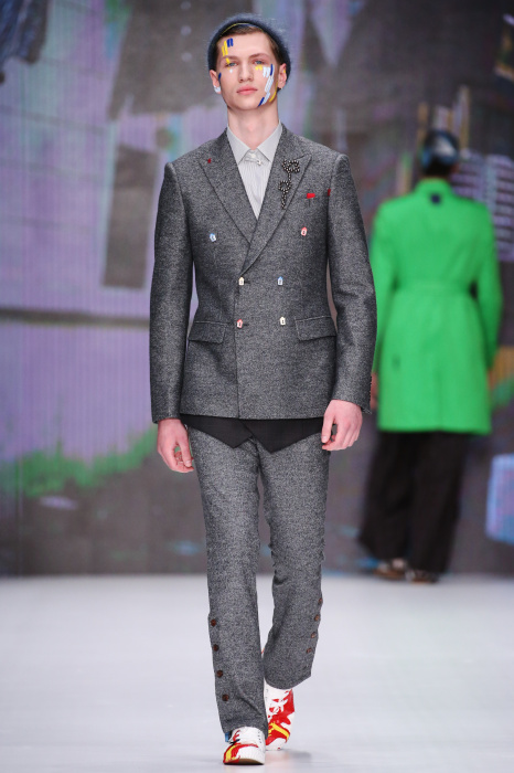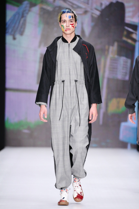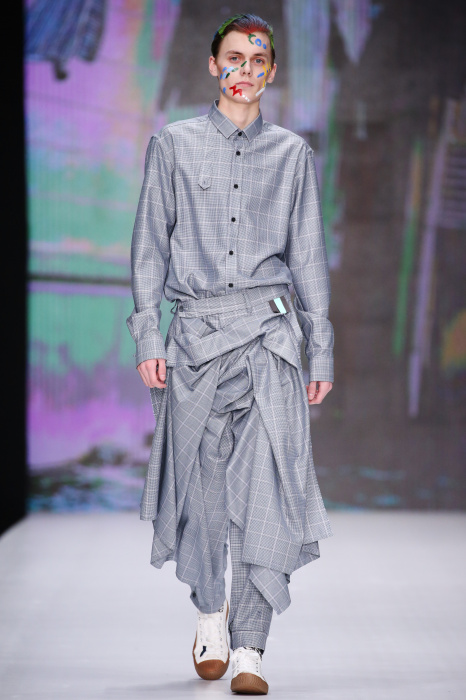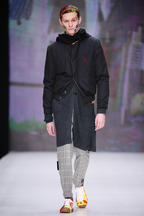 Показ бренда Artem Shumov в своей новой коллекции ломает стереотипы относительно классики. Модели-мужчины выходят на подиум в пиджаках, заправленных в спортивные брюки, в сочетании с разрисованными лицами и разноцветными волосами. Другое дизайнерское решение — несколько слоев верхней одежды. Спортивные укороченные брюки украшают генеральские лампасы, а аксессуаром в образе выступают меховые перчатки. Не обошлось без ярких акцентов: многоцветные платки, дутые пальто и белые кеды с красочным принтом. Главными цветами в коллекции стали: серый, темно-синий, коричневый, салатовый и даже пастельные тона. Из материалов дизайнер использовал также бархат и внес некий фан в строгие пиджаки, украсив их пуговицами всевозможных цветов.