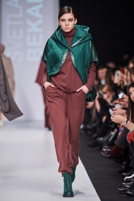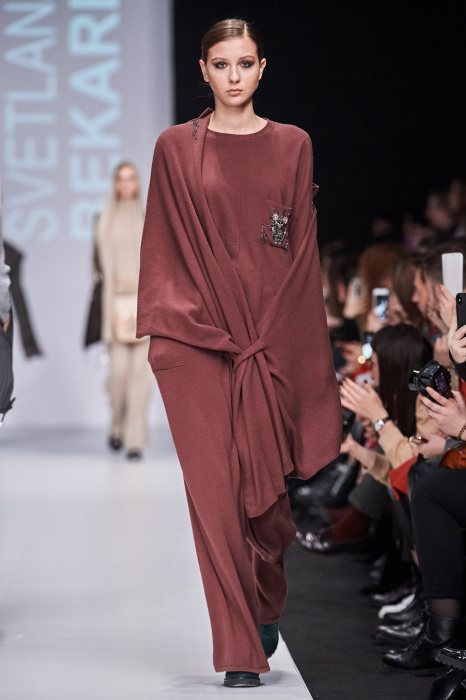 Светлана Бекарева представила коллекцию «Королевский кашемир». Основная тема — спорт-шик, где идеально сочетаются красота, комфорт и функциональность. Любая вещь — брюки, джемпер или платье — абсолютно универсальна и может лечь в основу идеального образа для непринужденного отдыха. В новой коллекции Бекарева традиционно добавляет вышивку стеклом, что делает бренд узнаваемым. Цветовая палитра: многогранный серый, нежный розовый, синий, теплый опалово-бежевый.