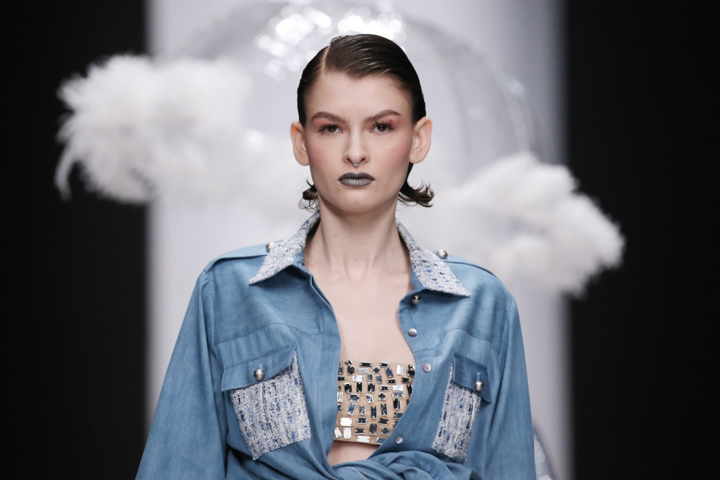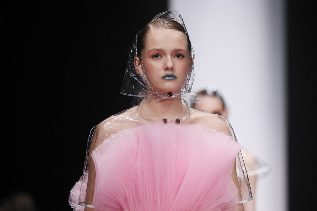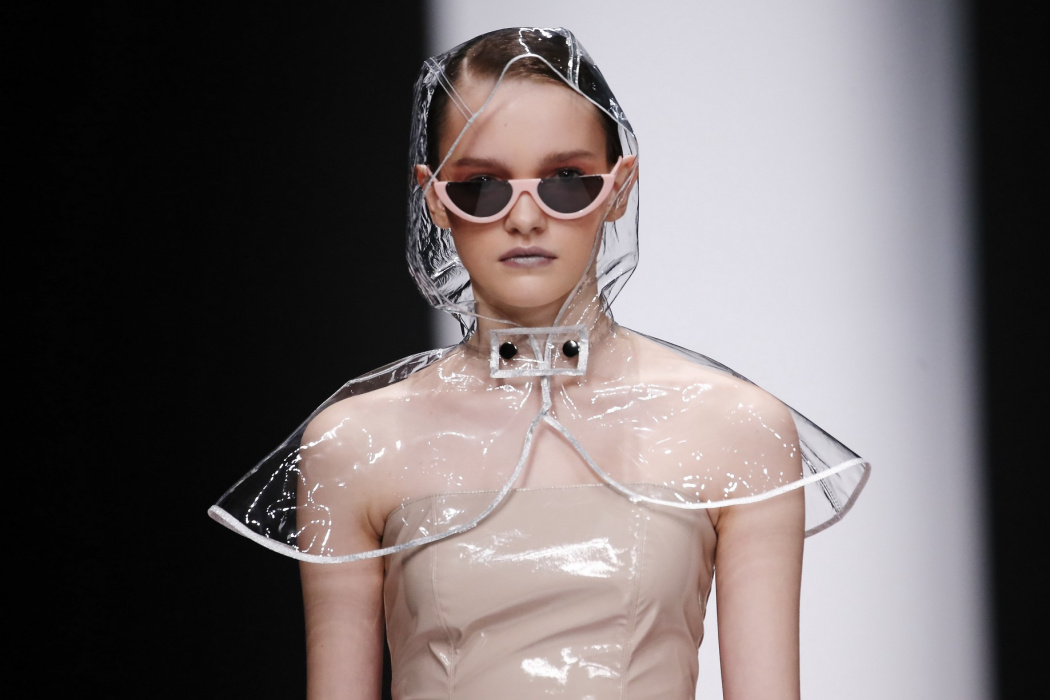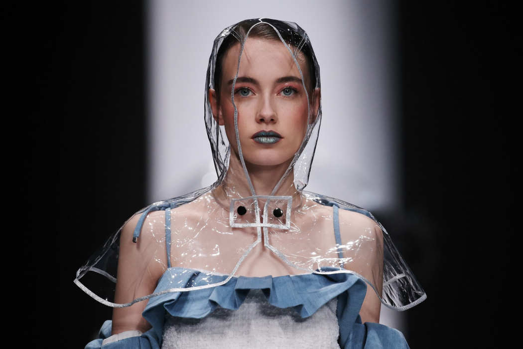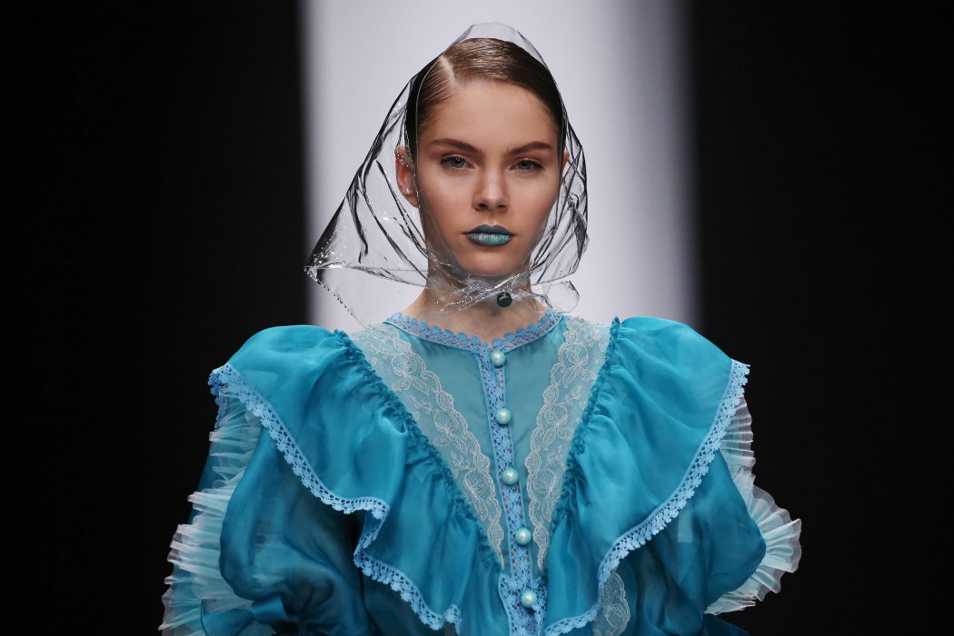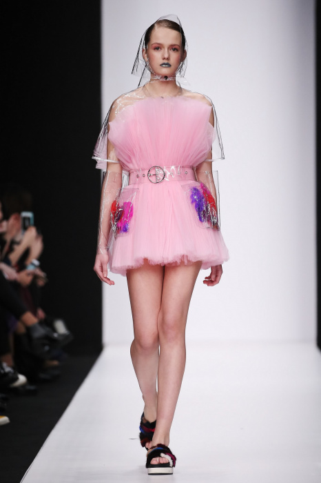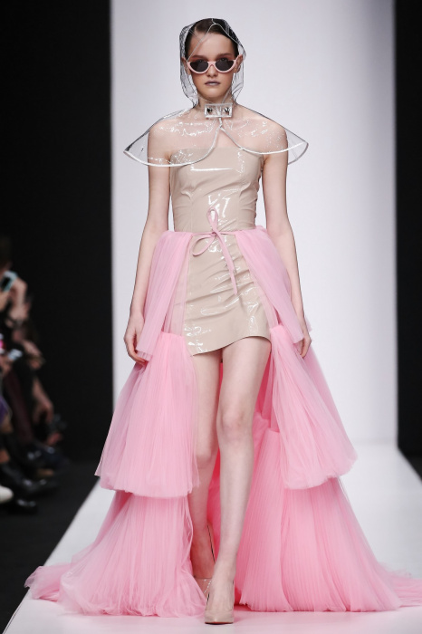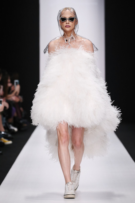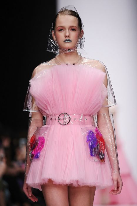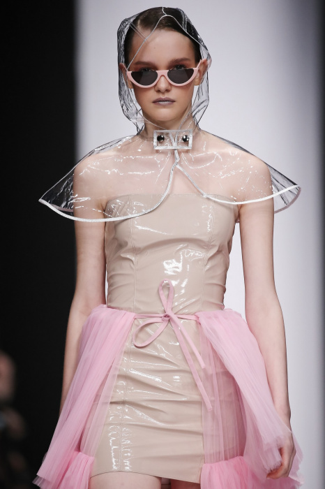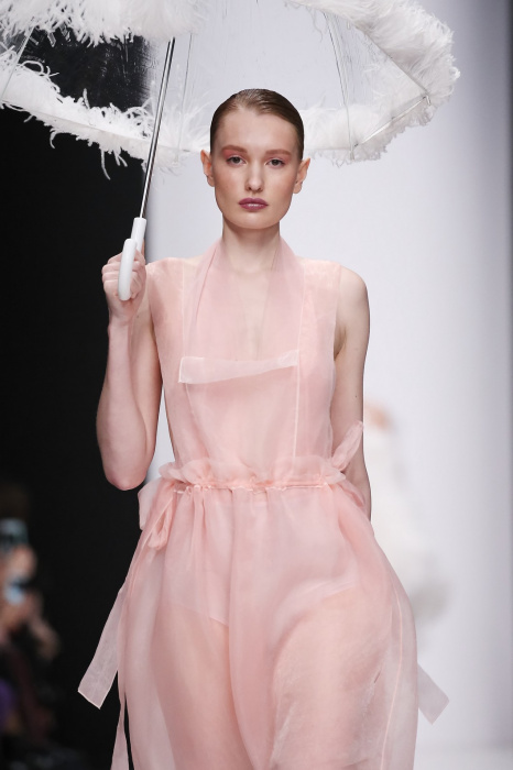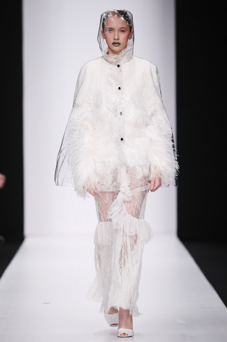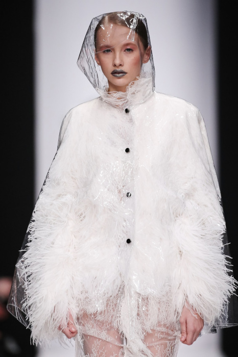 На новую коллекцию дизайнера Галу Борзову вдохновила тема дождя и скоротечность современного мира. Мир ускоряется и меняется, а вместе с ним и представление о моде. Ткани становятся более технологичными, стираются возраст и понятие сезонности. Теперь перья уместны даже под дождем и Борзова их искусно и уместно использует. В дефиле участвуют возрастные и андрогинные модели — мода для всех. Натуральные ткани дизайнер сочетает с актуальным уже который сезон пластиком. При этом соблюдены все законы женственности: корсеты, пояса, открытые плечи.