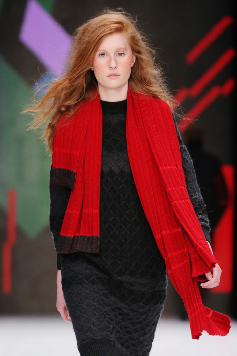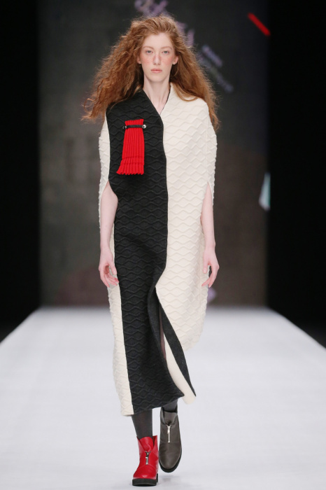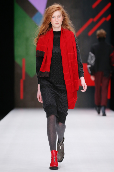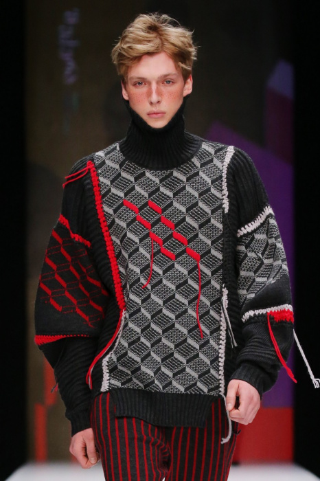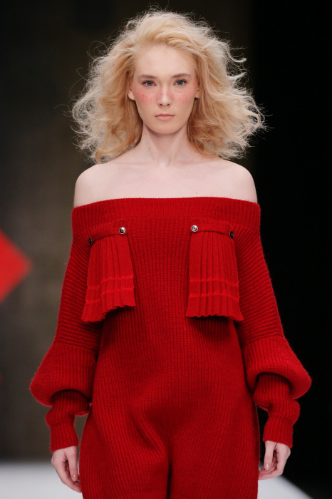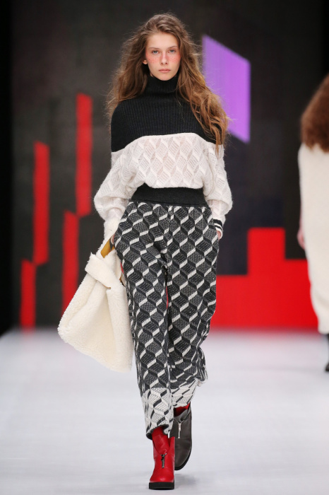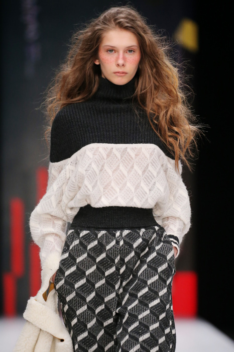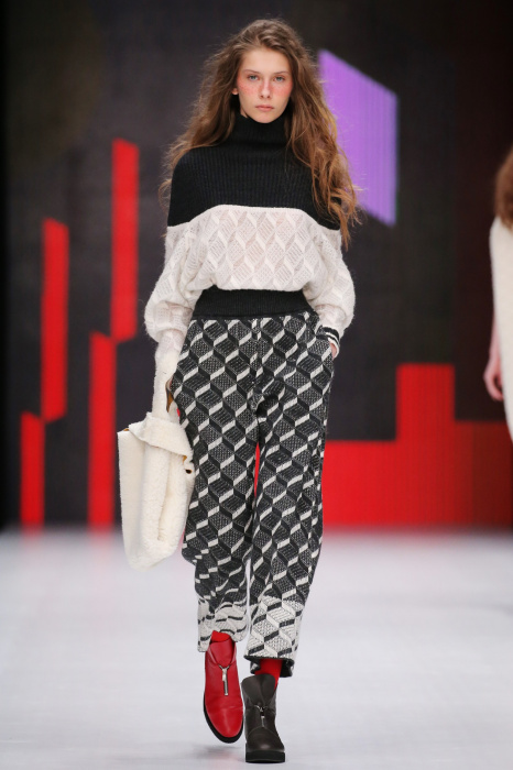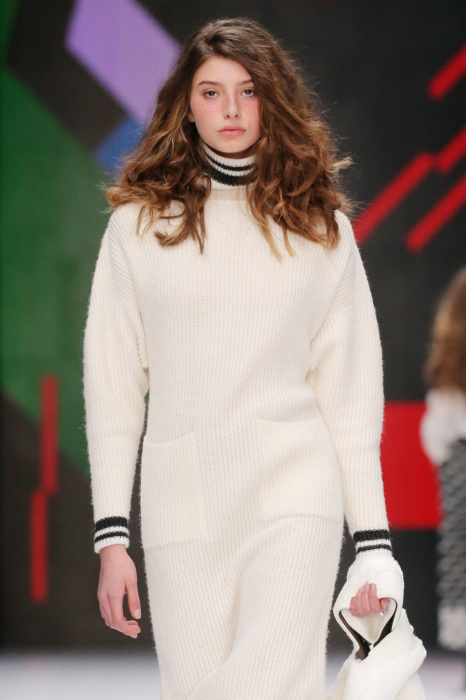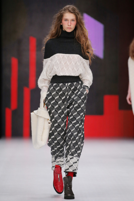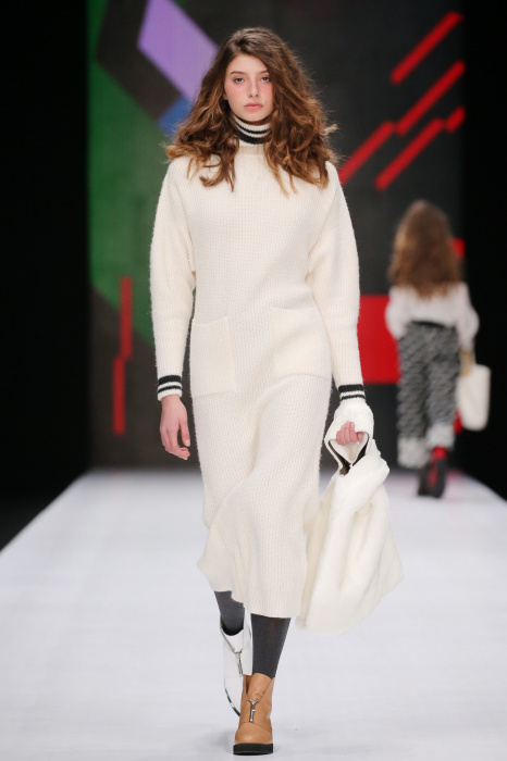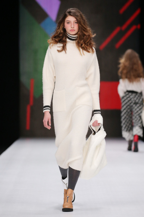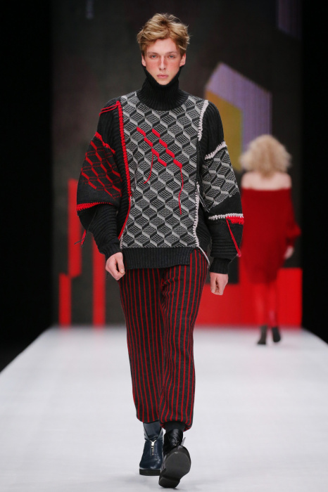 Коллекция сезона осень-зима 2018-2019 бренда KSENIASERAYA. Вдохновение нового зимнего сезона — искусство грузинских художников-примитивистов, картины Нико Пиросмани. Образы мужчин и женщин — грубые и трогательные одновременно, увеличенные объемы и крупные детали, одежда без утонченности и изысков в отделке. Рисунки жаккардовых полотен — линии, клетка и полосы. Силуэты коллекции — прямые, усложненные конструкциями рукавов и сочетанием объемных вязаных фактур. Свитера-мозаики, составленные из кусков разных рисунков, соединенные между собой вручную нарочито грубым стежком. Платья с высоким горлом, спортивные куртки-бомберы и жаккардовые брюки. Цветовая гамма: контрастная для одежды и обуви. Антрацит, винный красный, белый, светло-серый, цикламен, светло-персиковый, светло-желтый.