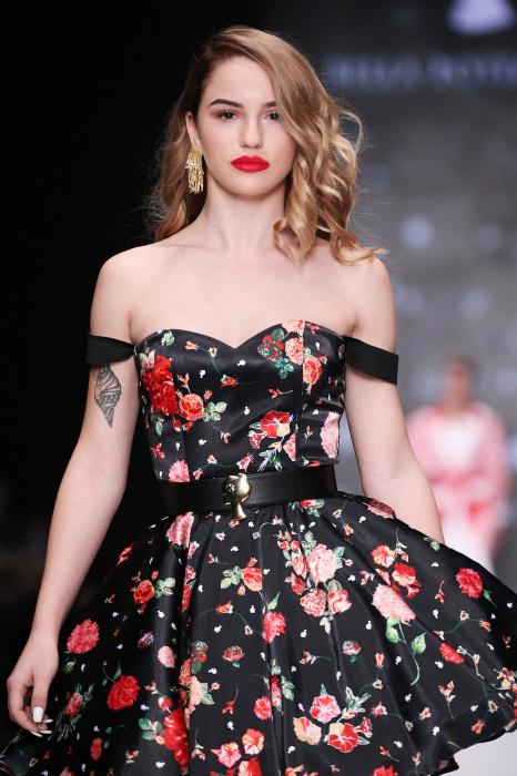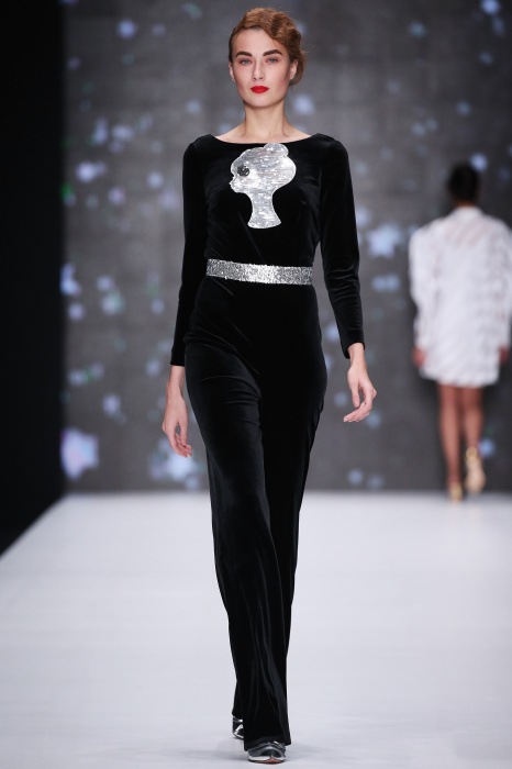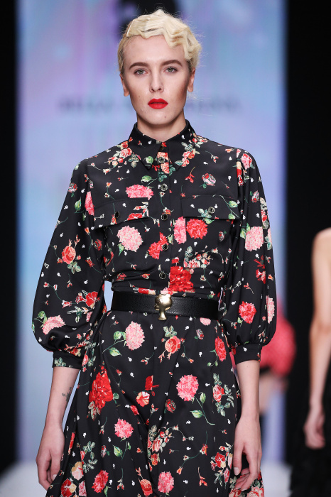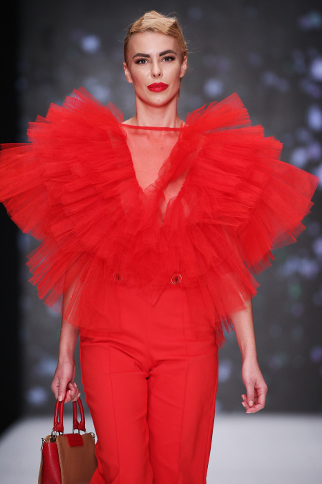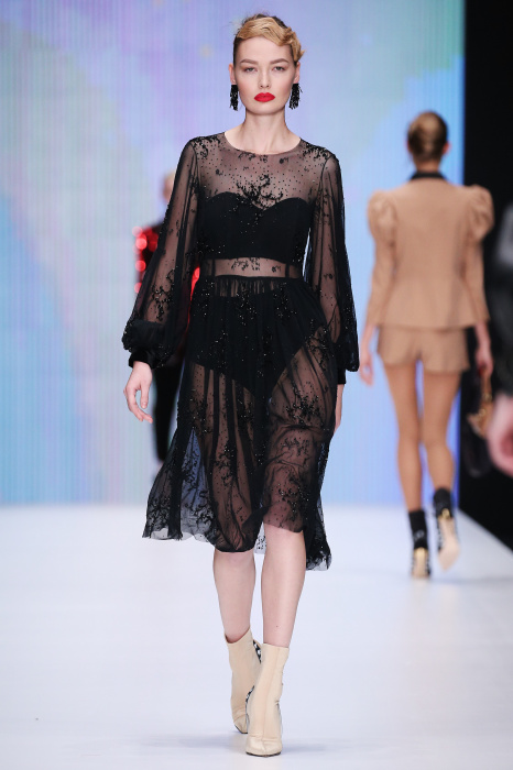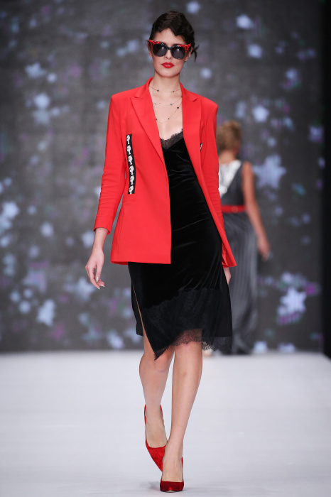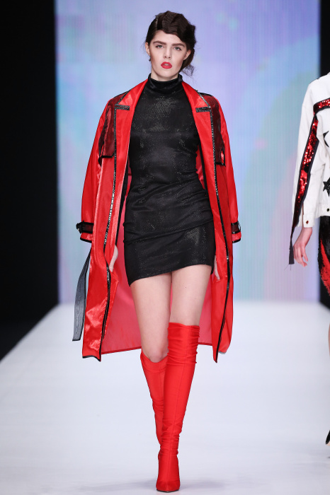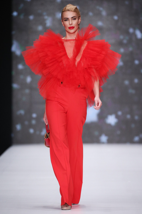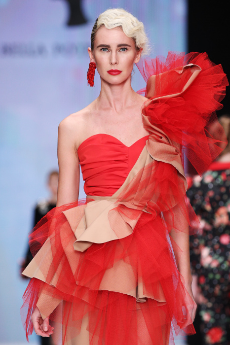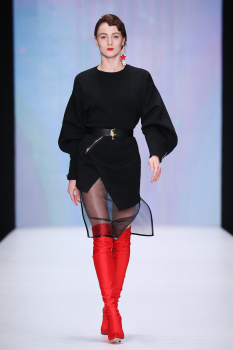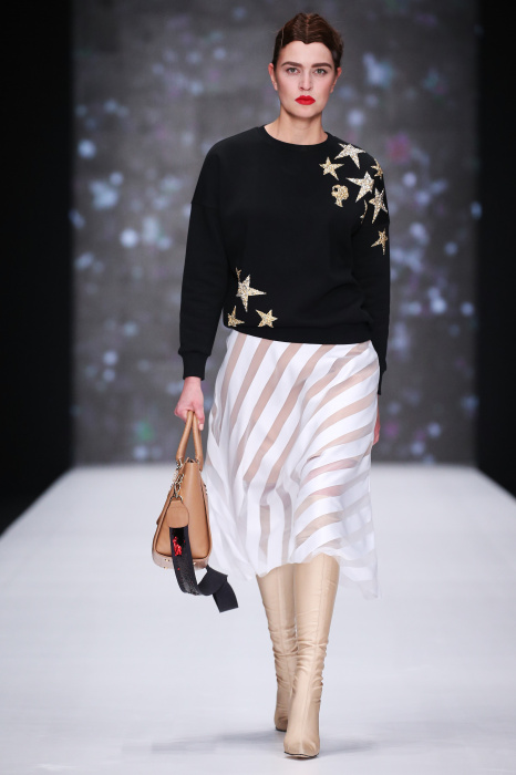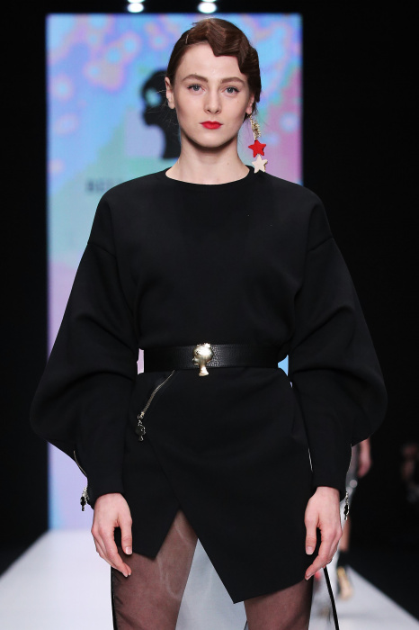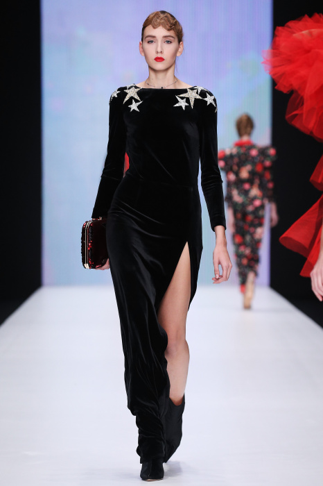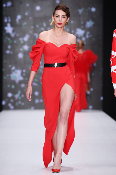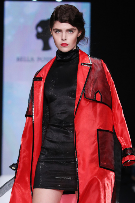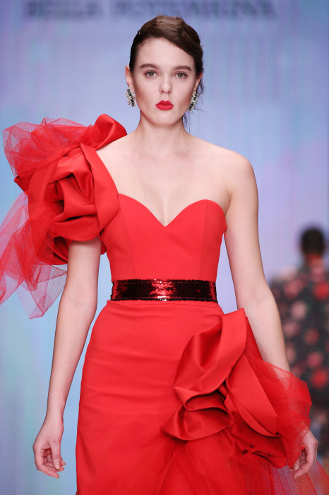 Главной звездой показа на MBFW RUSSIA бренда Беллы Потемкиной стала Ольга Бузова. Телеведущая и певица открыла шоу своим новым хитом «Ты не попал в хит-парад моих мыслей». Весь показ также проходил под микс песен Бузовой, а завершился живым исполнением главного хита – «Под звуки поцелуев». В коллекции представлены: бархат, звездные и цветочные принты, укороченные сапоги-чулки и ярко-красный цвет. Красный пояс, карманы, воротник, сапоги идеально оттеняют пальто верблюжьего цвета. Декоративный элемент большинства луков – сетка – проявляется на подоле платьев или в качестве объемной аппликаций на плечах. Стоит отметить принт с розами на черном фоне, ставший еще одной константой коллекции. В платье из этой ткани вышла не только одна из самых популярных блогеров России Марьяна Рыжкова, но и сама дизайнер Белла Потемкина.