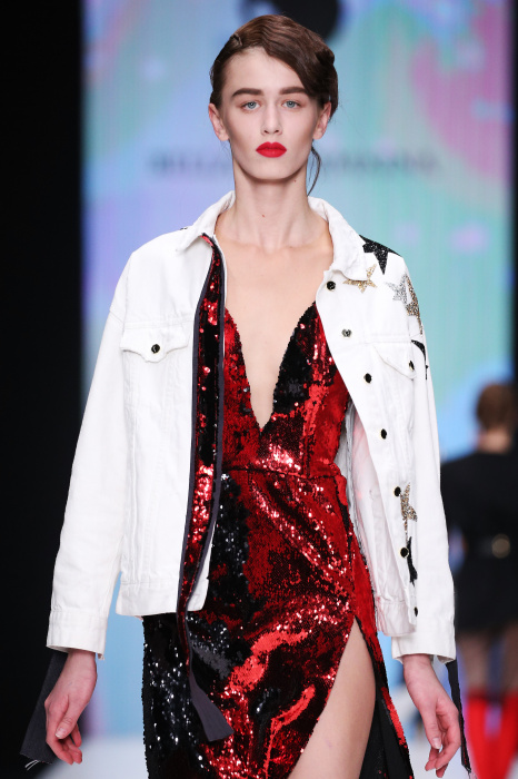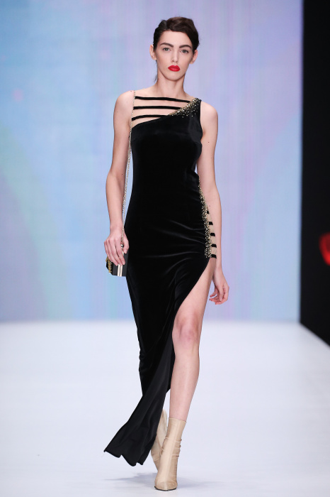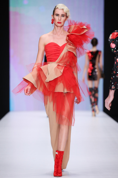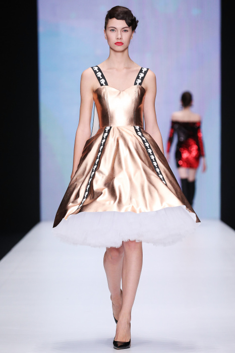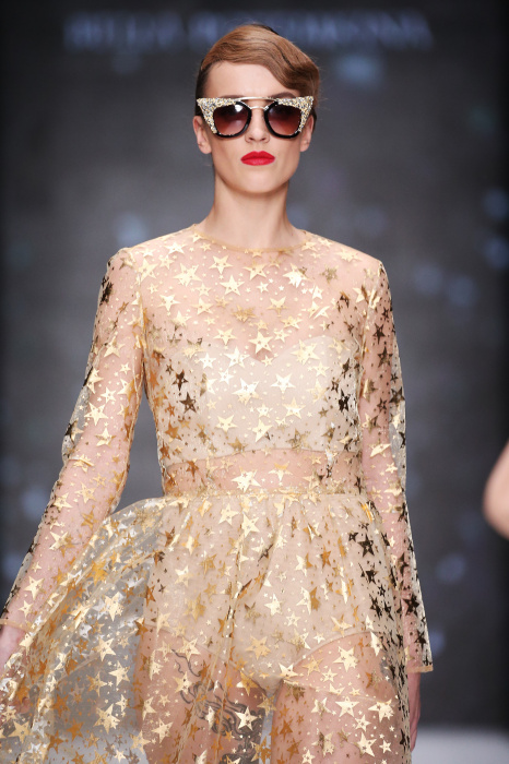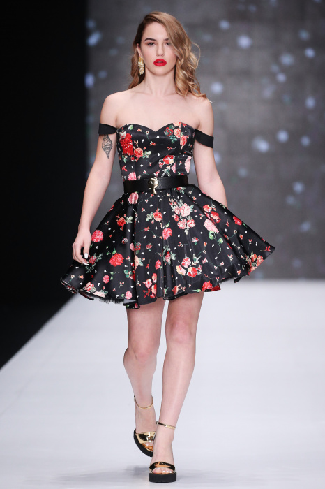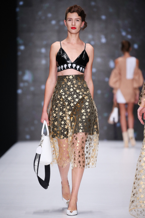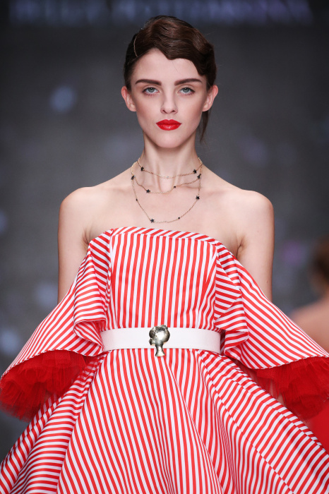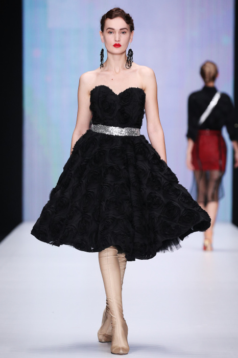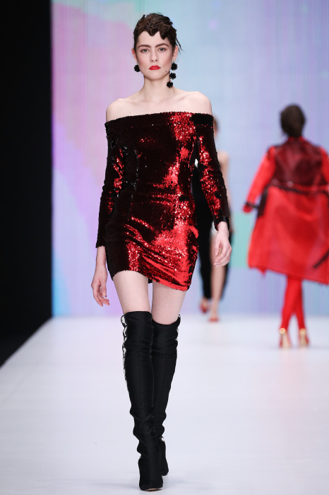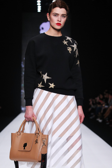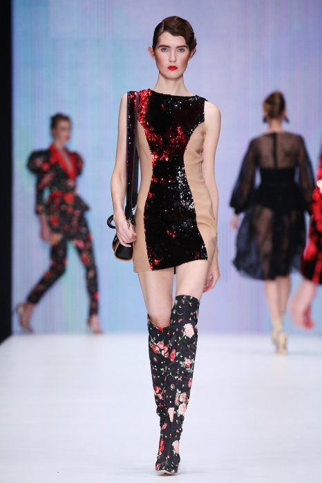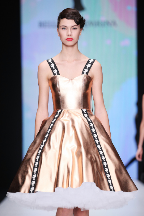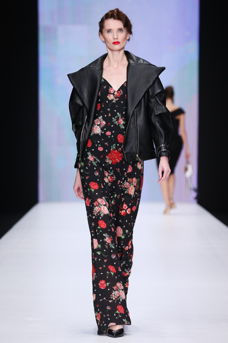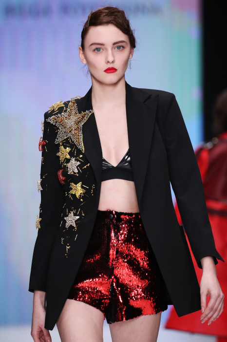 Главной звездой показа на MBFW RUSSIA бренда Беллы Потемкиной стала Ольга Бузова. Телеведущая и певица открыла шоу своим новым хитом «Ты не попал в хит-парад моих мыслей». Весь показ также проходил под микс песен Бузовой, а завершился живым исполнением главного хита – «Под звуки поцелуев». В коллекции представлены: бархат, звездные и цветочные принты, укороченные сапоги-чулки и ярко-красный цвет. Красный пояс, карманы, воротник, сапоги идеально оттеняют пальто верблюжьего цвета. Декоративный элемент большинства луков – сетка – проявляется на подоле платьев или в качестве объемной аппликаций на плечах. Стоит отметить принт с розами на черном фоне, ставший еще одной константой коллекции. В платье из этой ткани вышла не только одна из самых популярных блогеров России Марьяна Рыжкова, но и сама дизайнер Белла Потемкина.