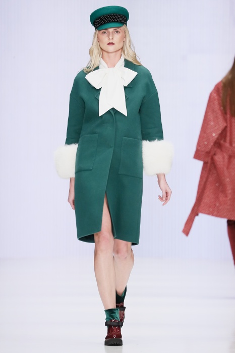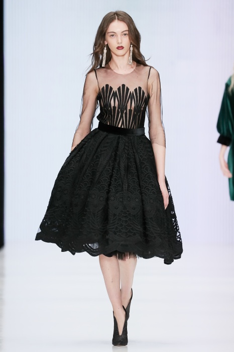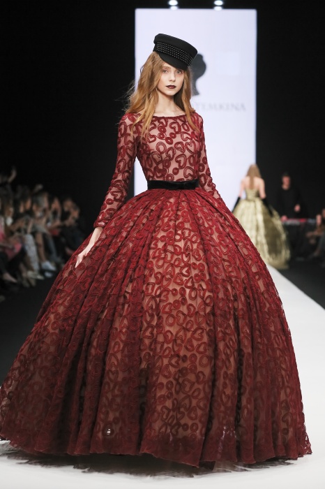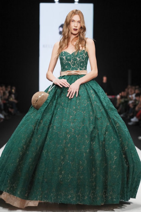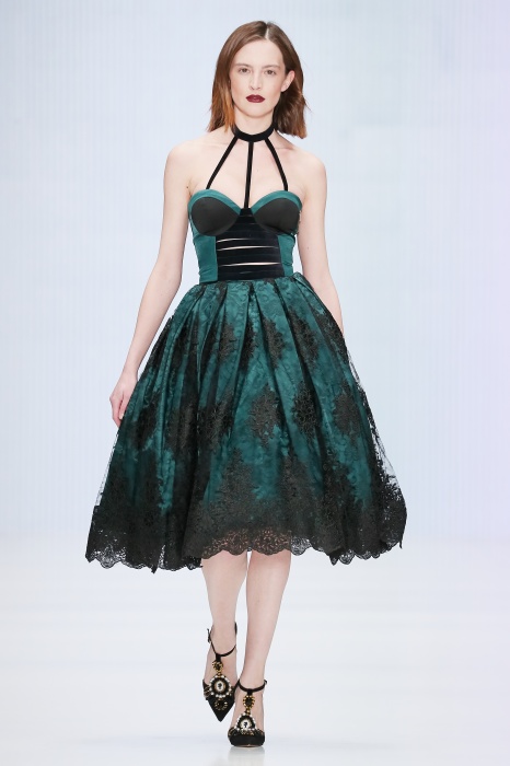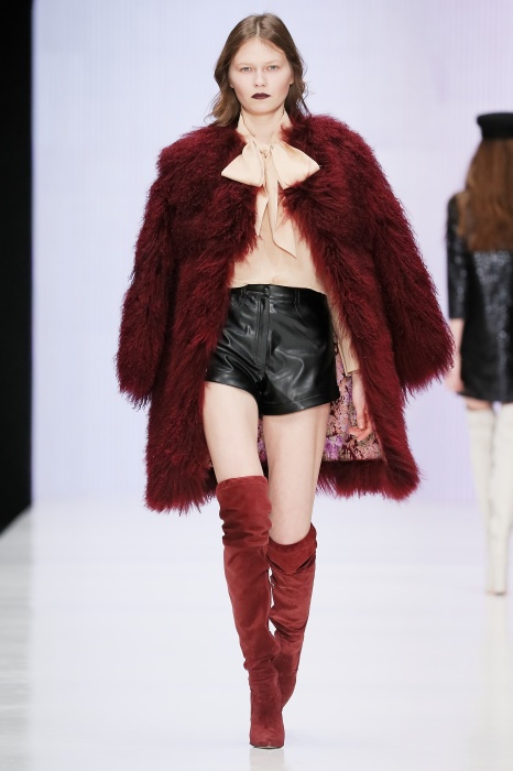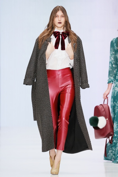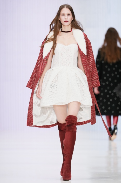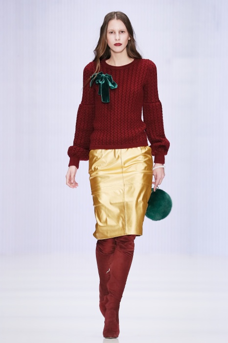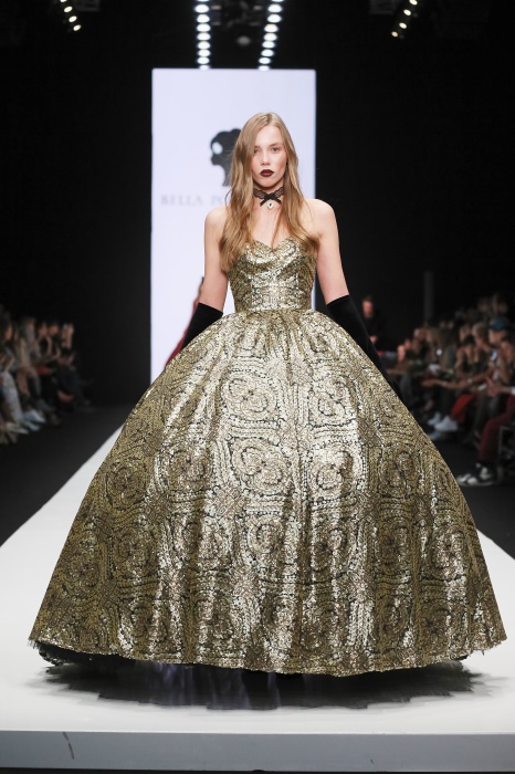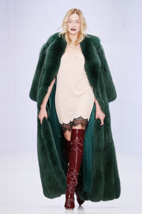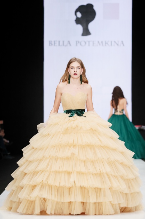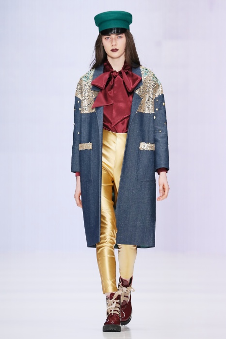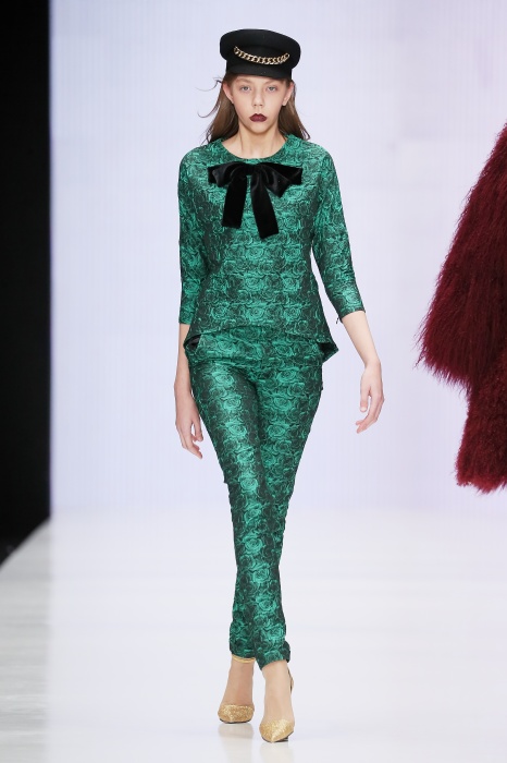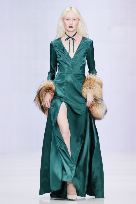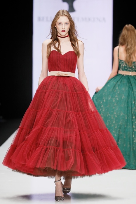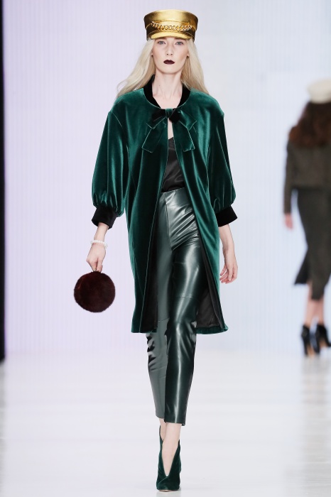 BELLA POTEMKINA вновь продолжает тему России, на этот раз акцент сделан на шик и роскошь царских традиций. К палитре традиционных для бренда цветов добавились благородные и богемные изумрудный и бургунди. Концепция ретро и изысканной винтажности нарочито подчеркнута, благодаря использованию золота в отделке и в деталях. Дизайнер использует много меха и изысканное кружево, обрамлкнное тончайшей тканью вечерних нарядов. Кожаные брюки с заправленными рубашками и пальто менялись платьями в бельевом стиле и более непосредственными c пышными юбками безупречного кроя. Мужская коллекция – это черные бархатные костюмы-двойки и утонченная классика минимализма.