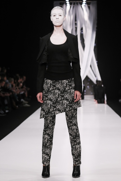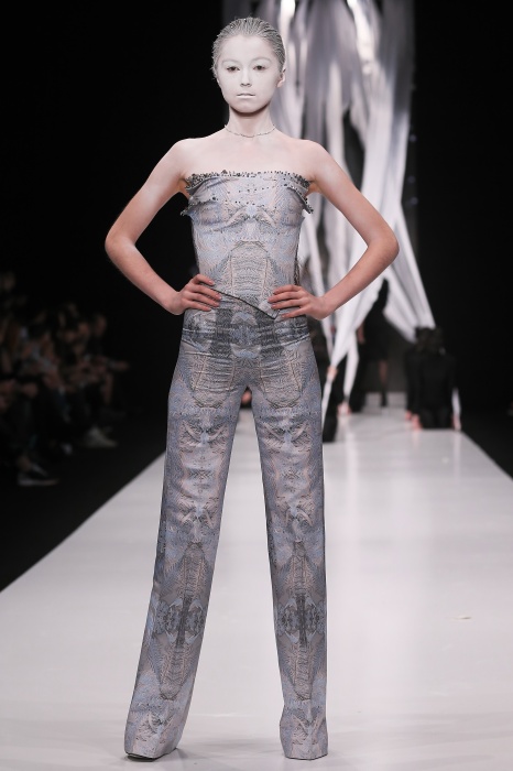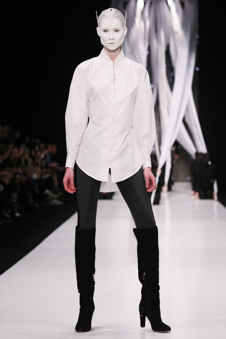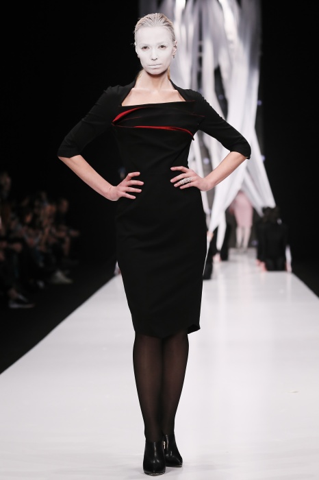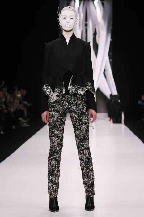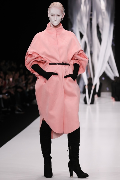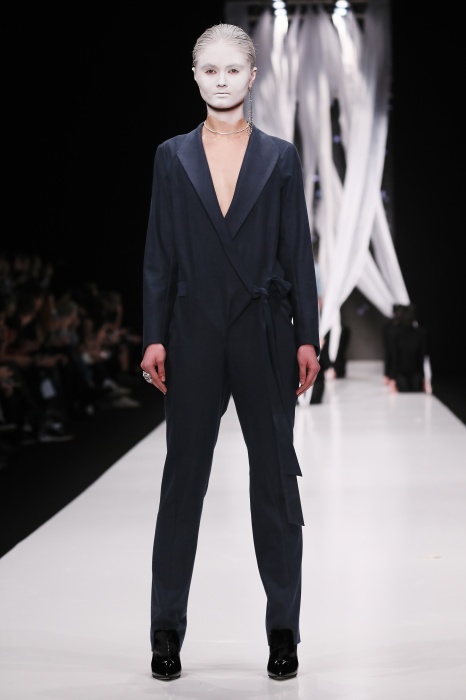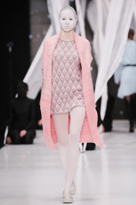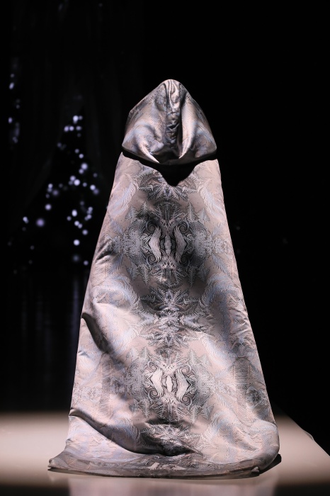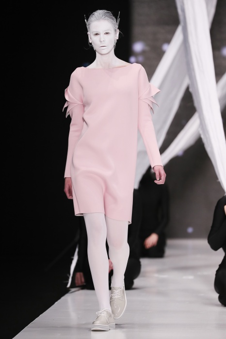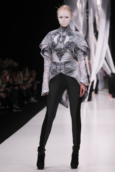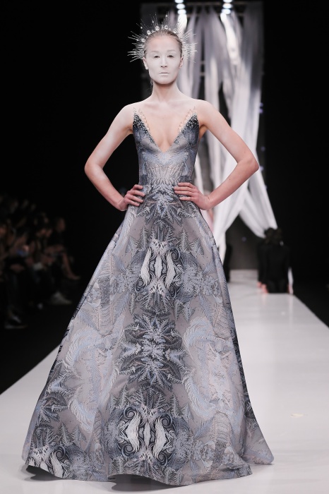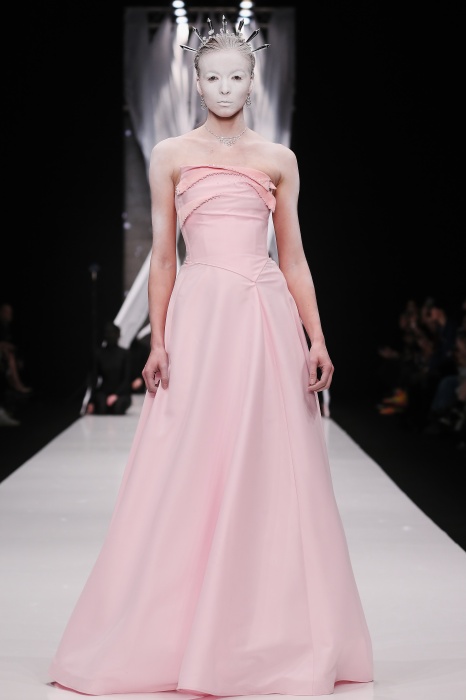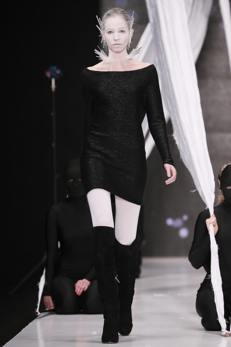В своей новой коллекции Gaudeamus DIMANEU воспел холодную и прекрасную природу родной Сибири, столкнув ее хаотичность и непримиримость со строгостью готики. Границы тепла и холода находят свое отражение в цветовой гамме: одежда цвета замерзшей земли, ночного неба, контрастного светло-розового и лица моделей цвета снежных просторов. Дизайнер верен своему стилю – продолжает трансформировать и вытягивать силуэты, использовать асимметрию, фирменный принт, строгие линии и заключать в корсеты верх знаковых платьев. В этой коллекции Дима использует ожерелья, каффы и диадемы в виде острых кристаллов от художника Алека Раоса. Традиционно показ прошел в форме перформанса.
