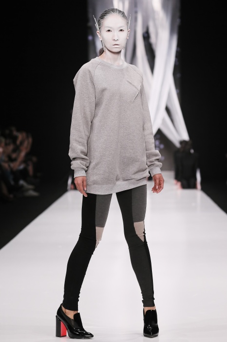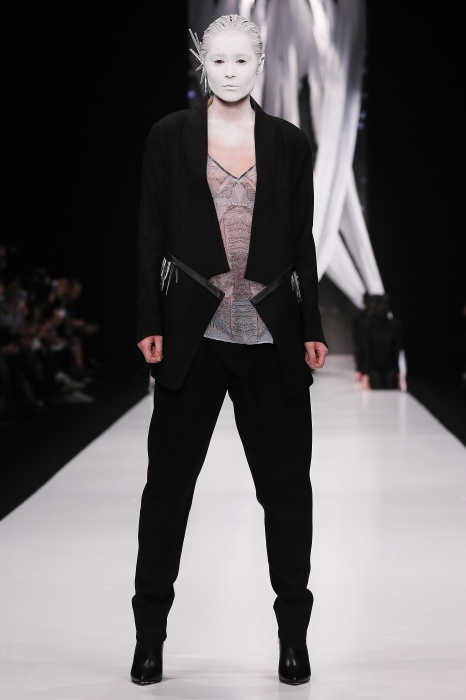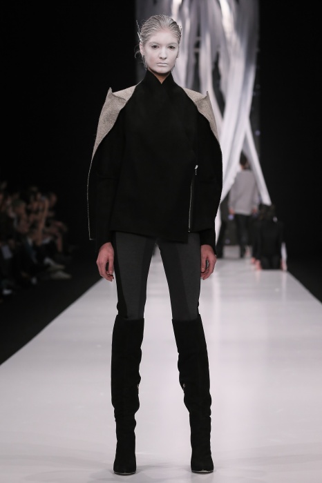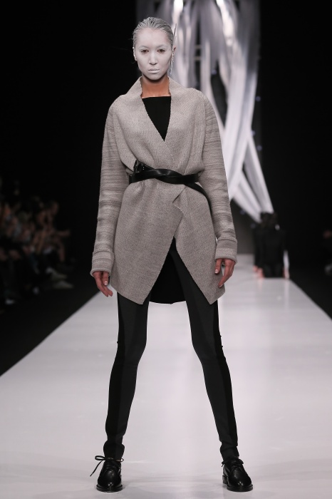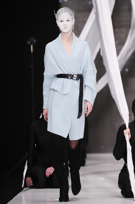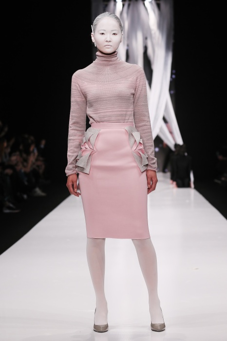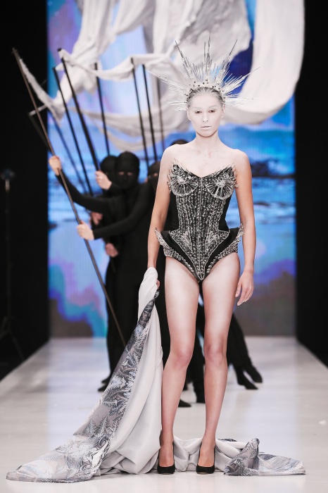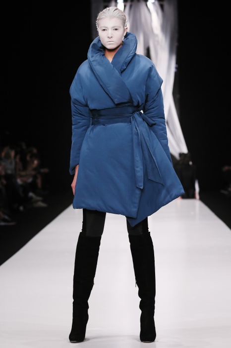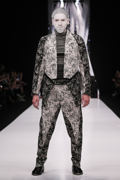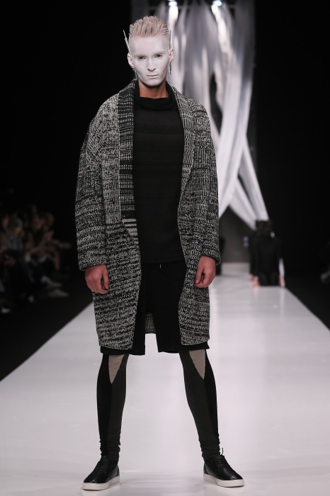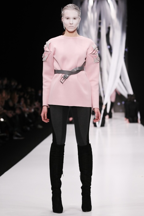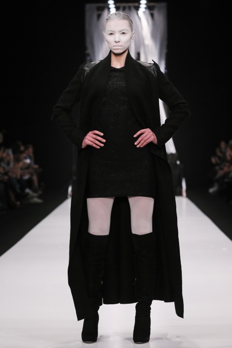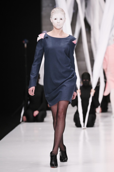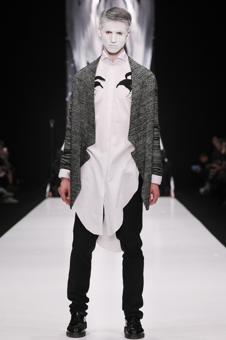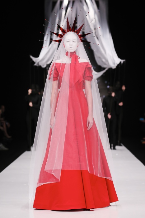 В своей новой коллекции Gaudeamus DIMANEU воспел холодную и прекрасную природу родной Сибири, столкнув ее хаотичность и непримиримость со строгостью готики. Границы тепла и холода находят свое отражение в цветовой гамме: одежда цвета замерзшей земли, ночного неба, контрастного светло-розового и лица моделей цвета снежных просторов. Дизайнер верен своему стилю – продолжает трансформировать и вытягивать силуэты, использовать асимметрию, фирменный принт, строгие линии и заключать в корсеты верх знаковых платьев. В этой коллекции Дима использует ожерелья, каффы и диадемы в виде острых кристаллов от художника Алека Раоса. Традиционно показ прошел в форме перформанса.