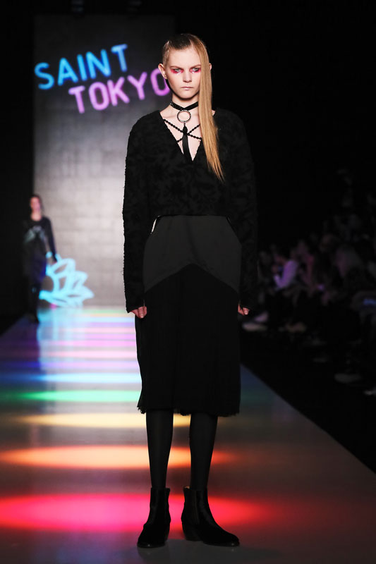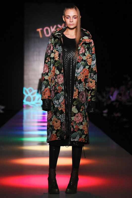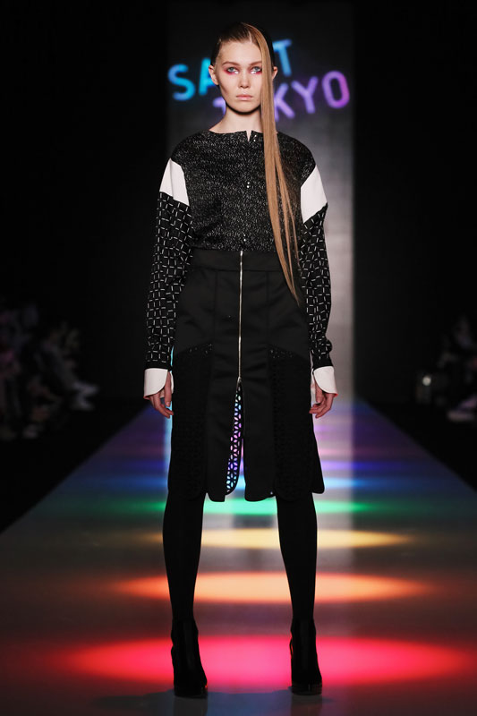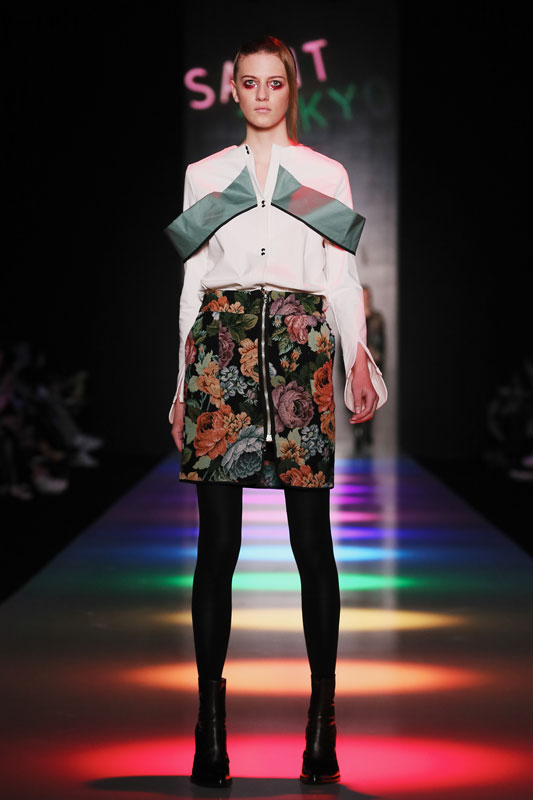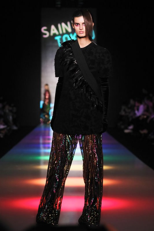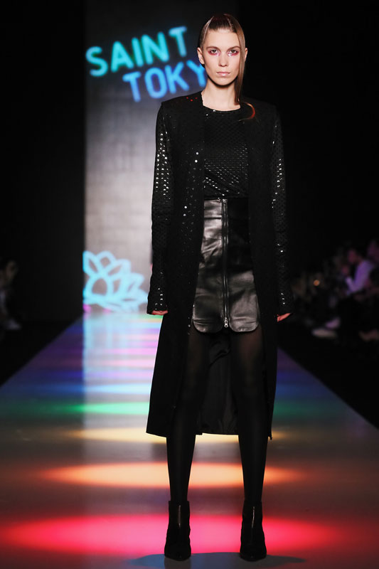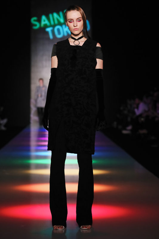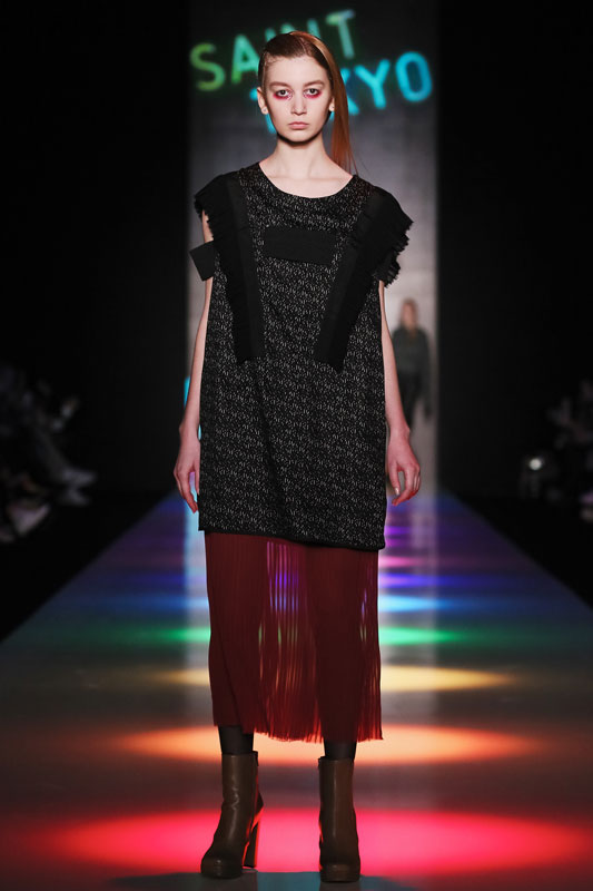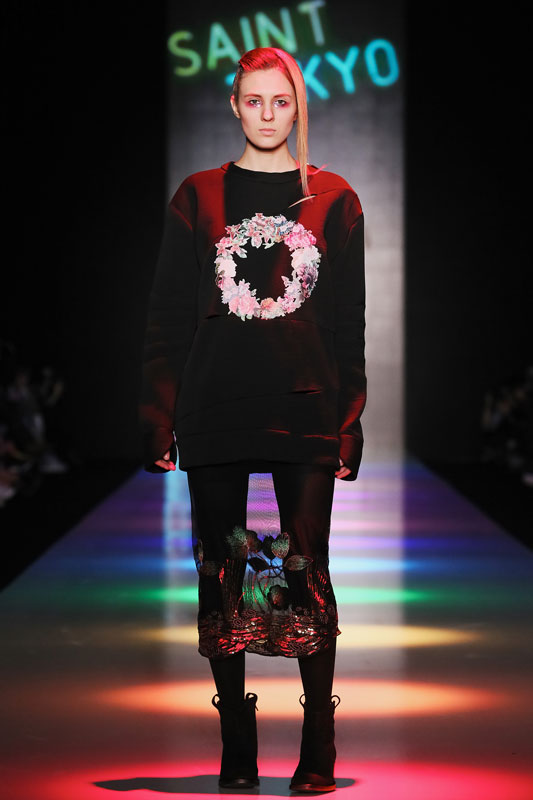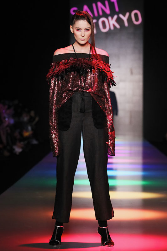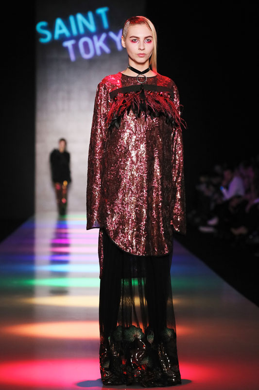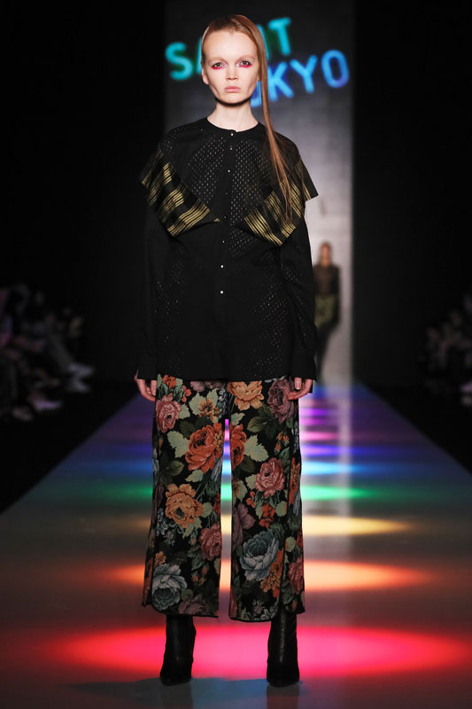 Дизайнер бренда Saint-Tokyo Юрий Питенин представил коллекцию, в которой восточная эстетика сочетается с европейской. Это томный неонуар, расцвеченный гобеленовыми цветами, расположившимися на верхней одежде, платьях и юбках. Уютная шерсть здесь соседствует с пайеточной отделкой цвета розового золота – дизайнер ведет игру не только с фактурами, но и с асимметрией кроя и геометрией линий.