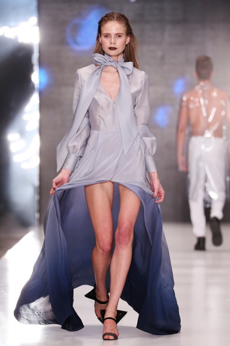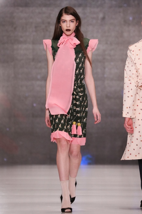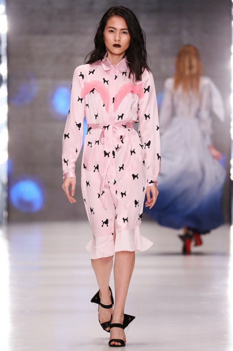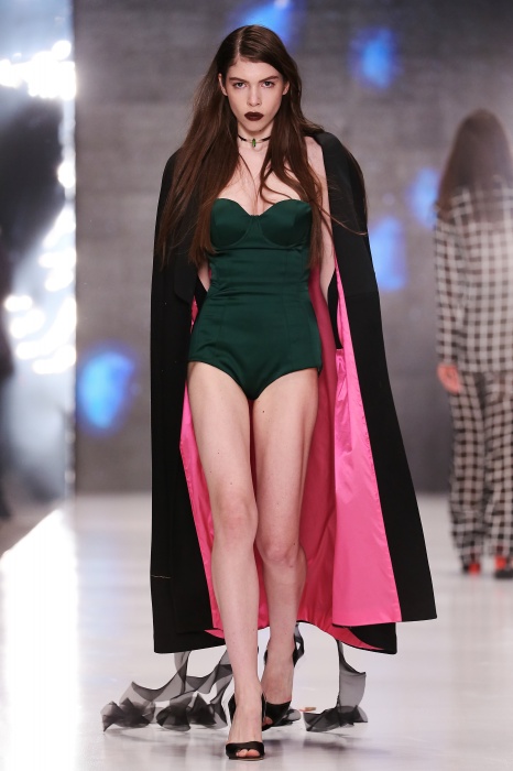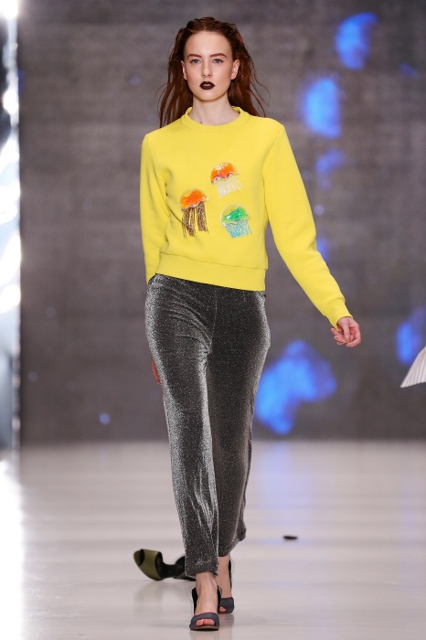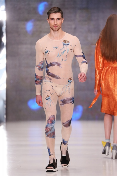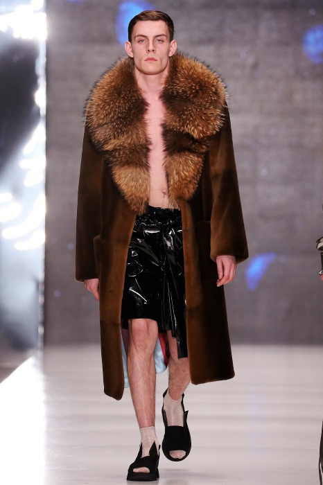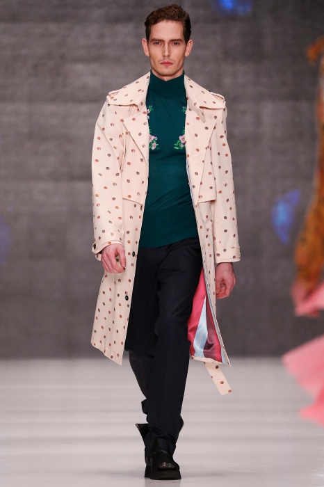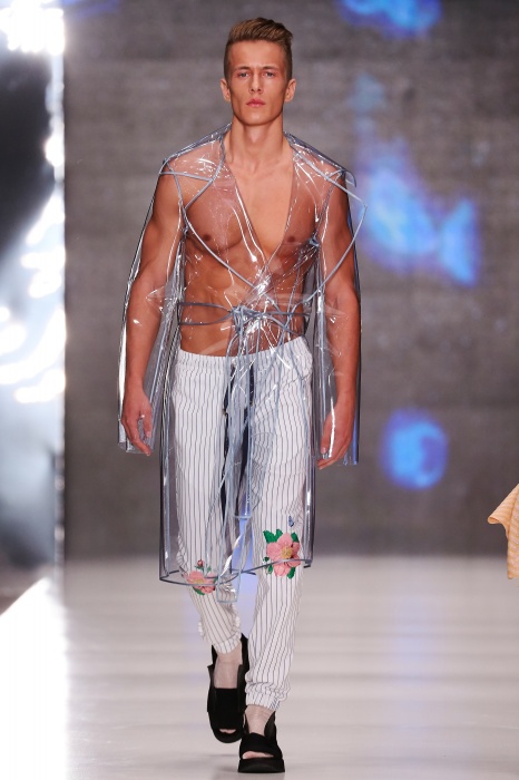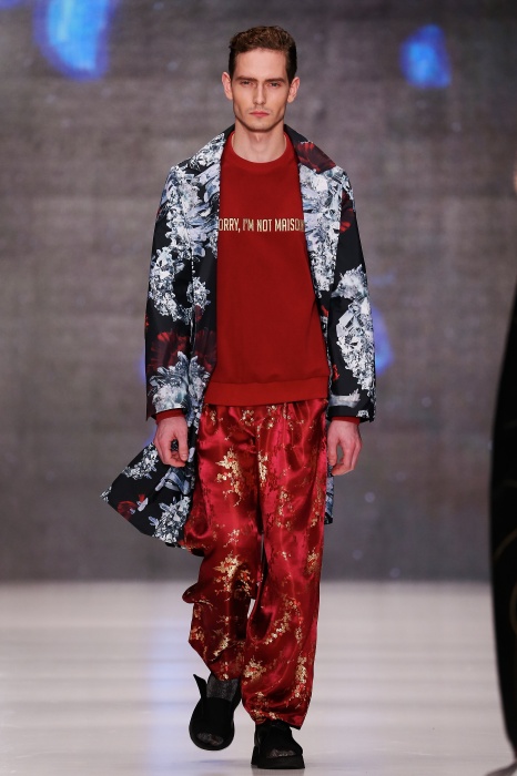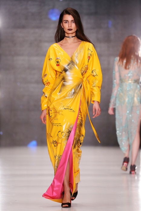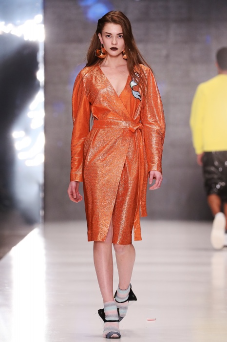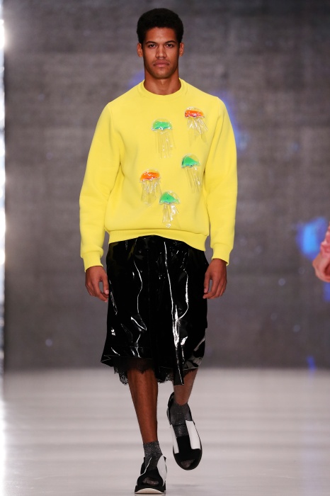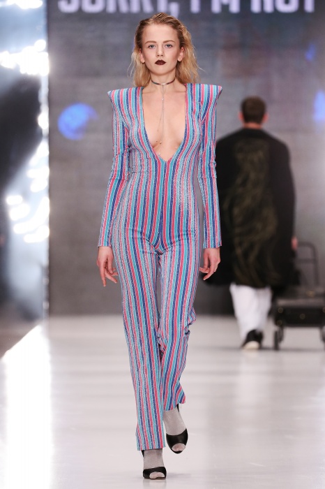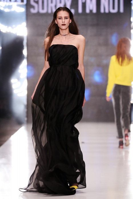 Коллекция дебютантов SORRY, I'M NOT построена вокруг образа девушки-сирены, которая похищает сердца и ни о чем не жалеет. Яркая окраска варьируется от рекламно-желтого до розово-радужного и глянцево-черного. Нежные шелковые платья с рюшами-щупальцами окрашены в градиент, инфантильные бэби-долы контрастируют с черной помадой, мужчины следуют за своей возлюбленной в меховом и капроновом костюме. Каждый образ пронизан иронией и провокацией, сочетания материалов и кричащих цветов придутся по вкусу смелым и бескомпромиссным.