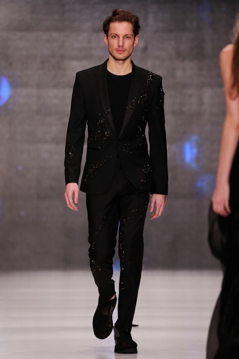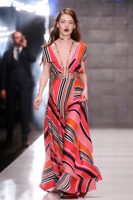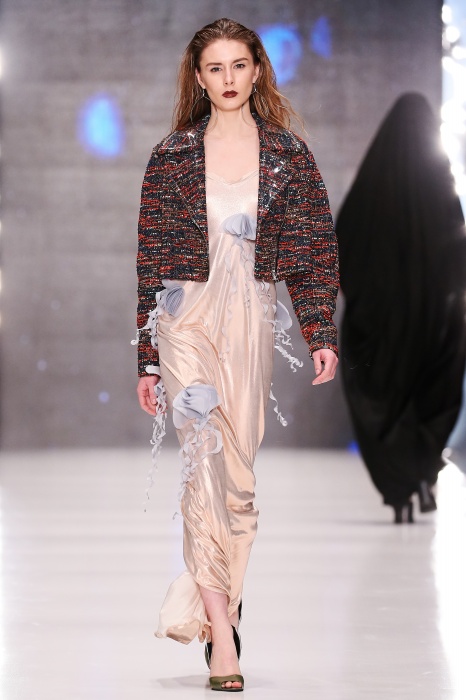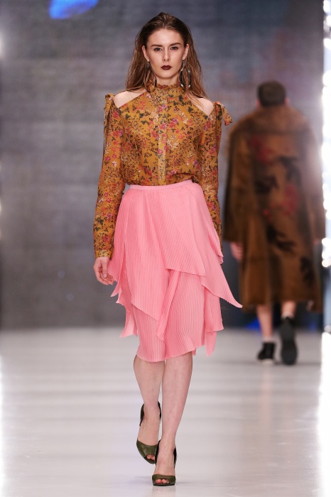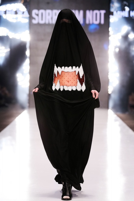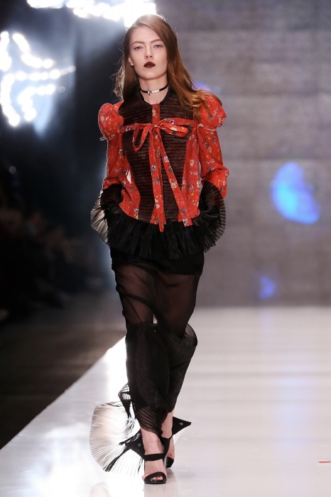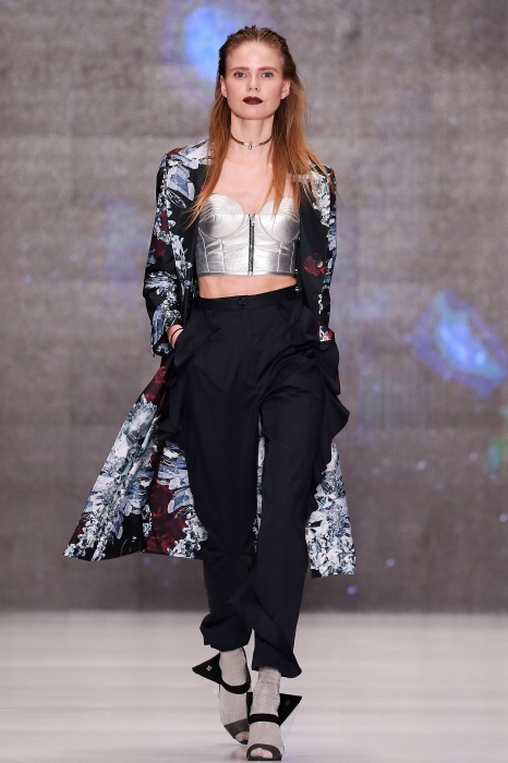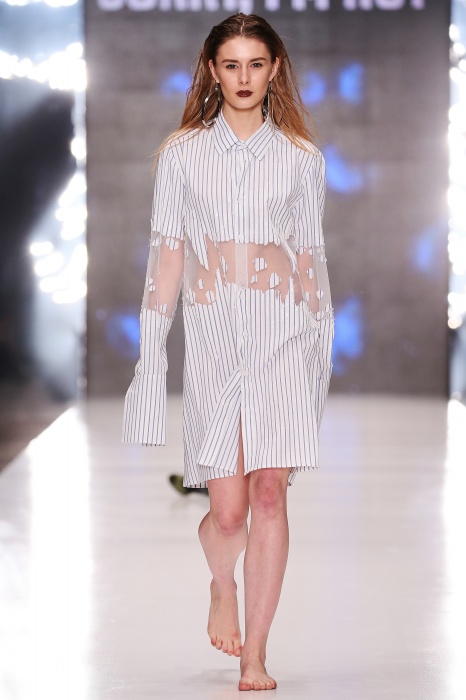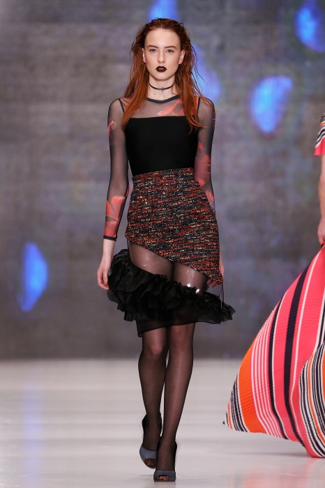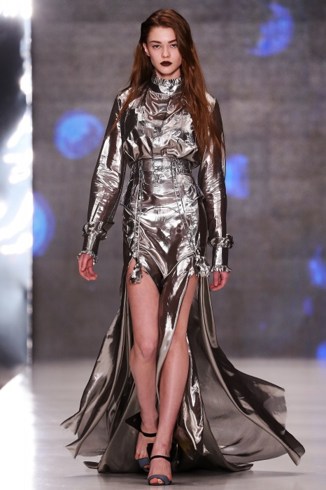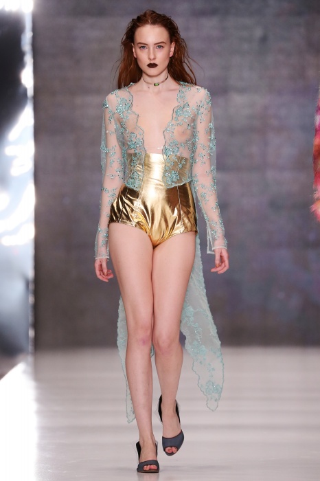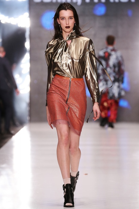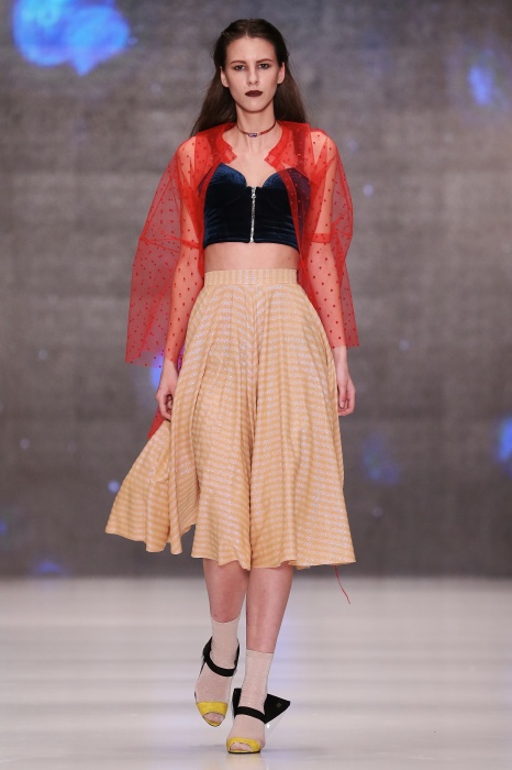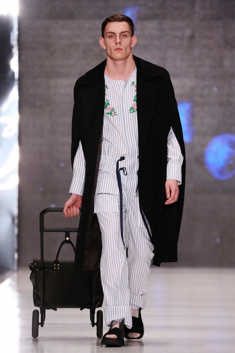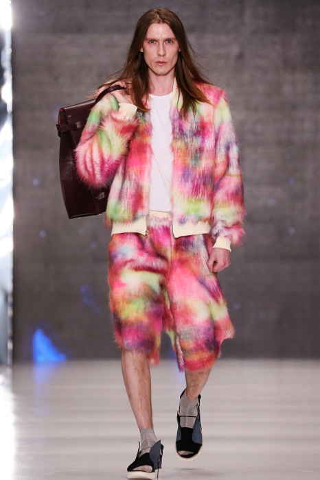 Коллекция дебютантов SORRY, I'M NOT построена вокруг образа девушки-сирены, которая похищает сердца и ни о чем не жалеет. Яркая окраска варьируется от рекламно-желтого до розово-радужного и глянцево-черного. Нежные шелковые платья с рюшами-щупальцами окрашены в градиент, инфантильные бэби-долы контрастируют с черной помадой, мужчины следуют за своей возлюбленной в меховом и капроновом костюме. Каждый образ пронизан иронией и провокацией, сочетания материалов и кричащих цветов придутся по вкусу смелым и бескомпромиссным.