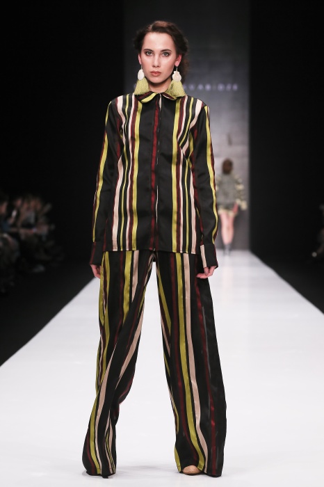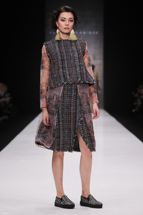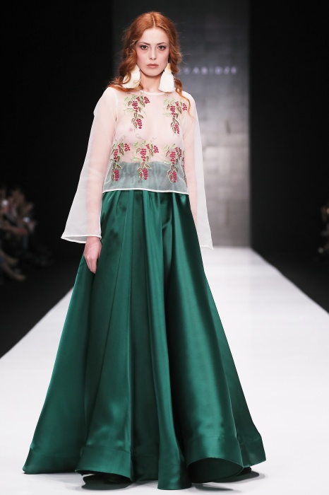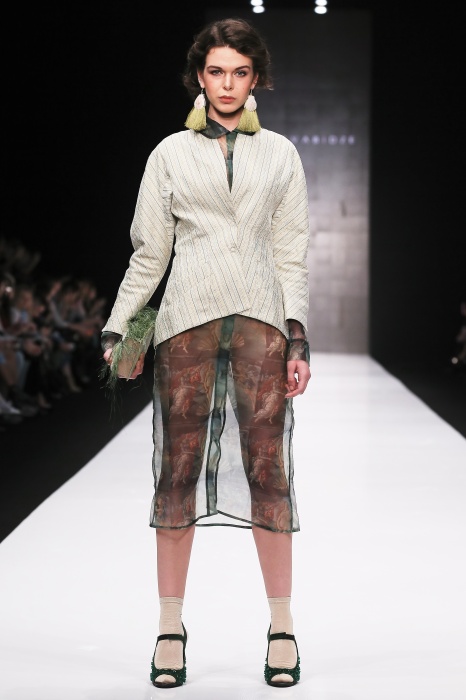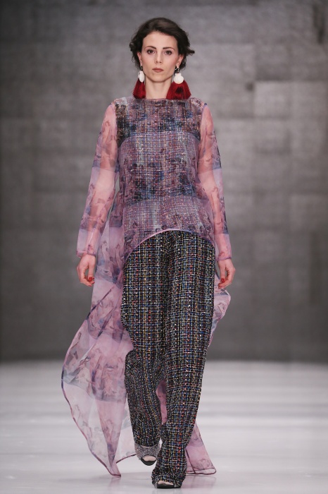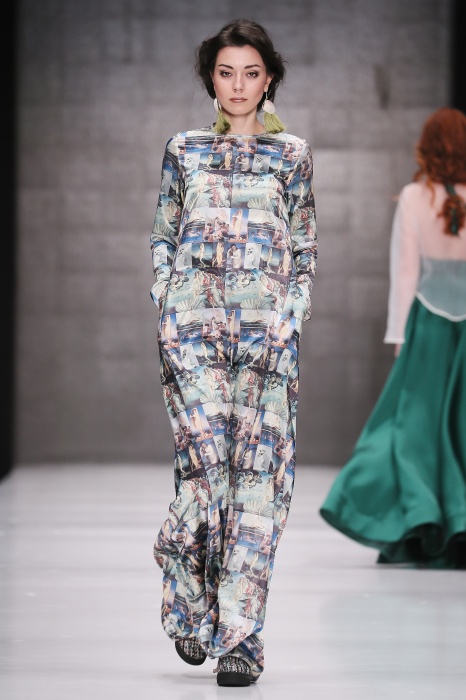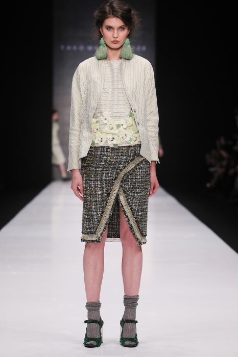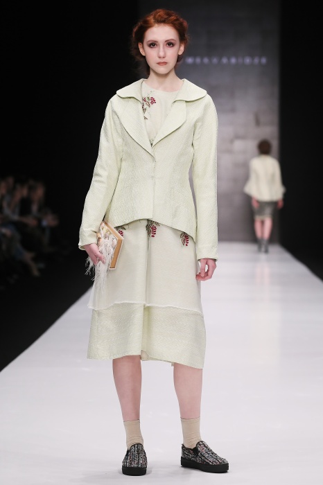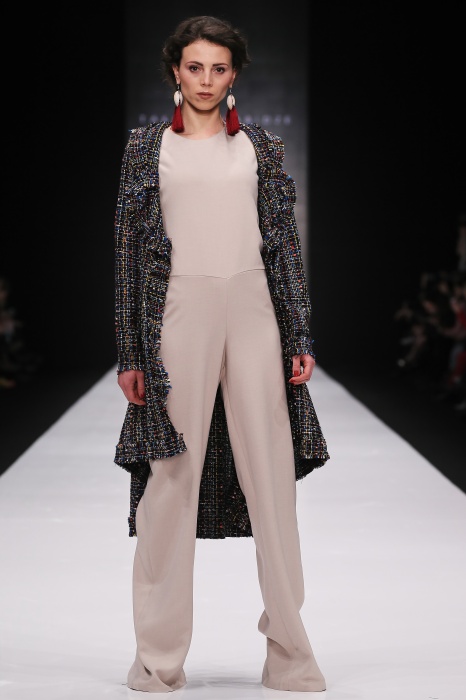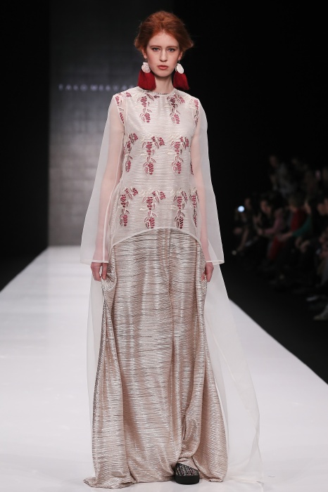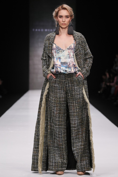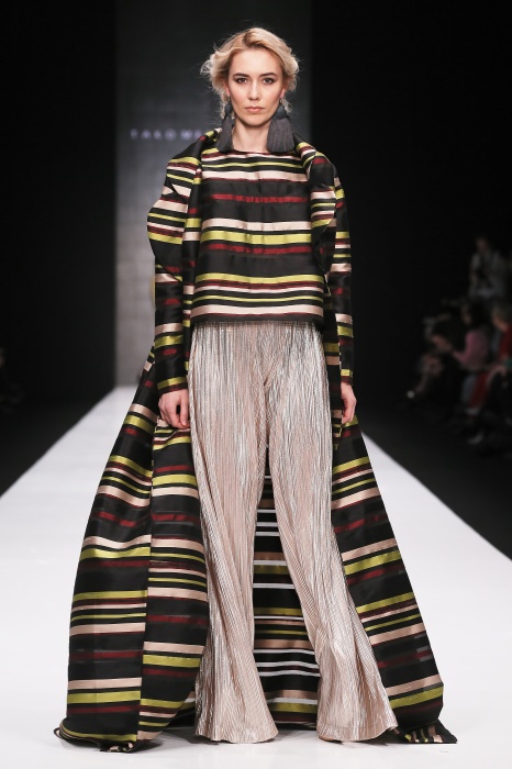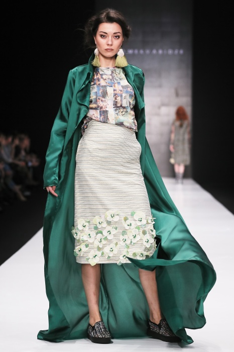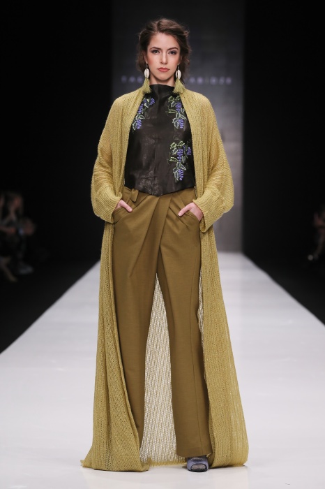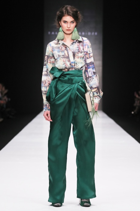 В самобытной коллекции Tako Mekvabidze офисные варианты одежды сочетаются с расслабленными пижамными, летящие ткани – со строгими фактурными, а умеренные цвета – с глубокими. Силуэт модели то подчеркивается, как в комплекте с малахитовыми шелковыми штанами завышенной посадки, то едва угадывается за многослойностью наряда. Полупрозрачные вариан ты одежды одновременно и скрывают, и демонстрируют достоинства, давая простор фантазии.