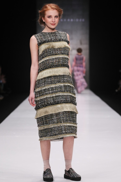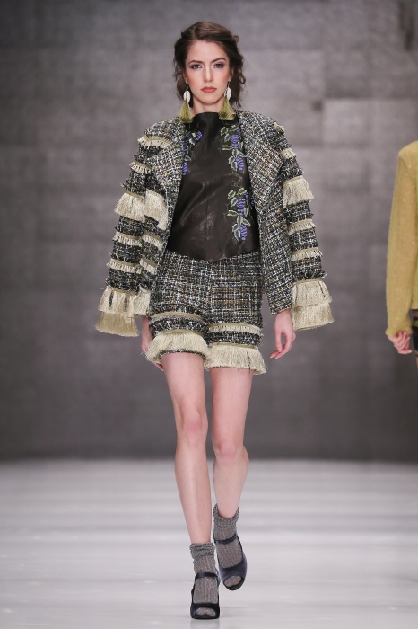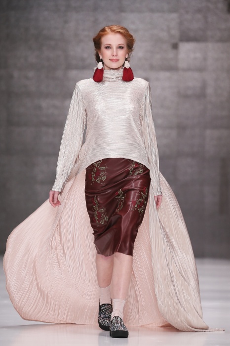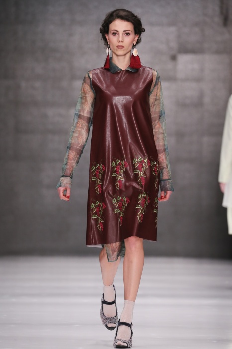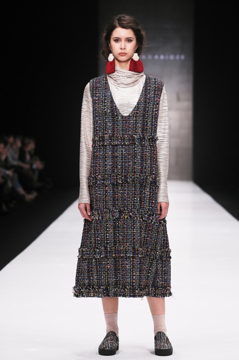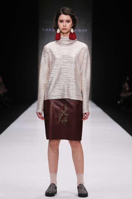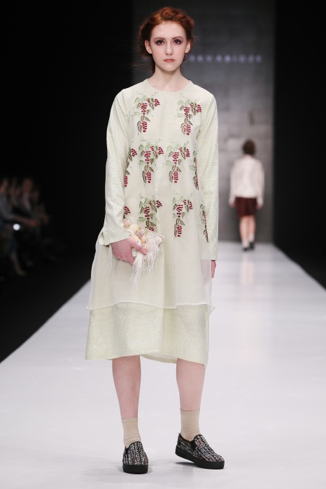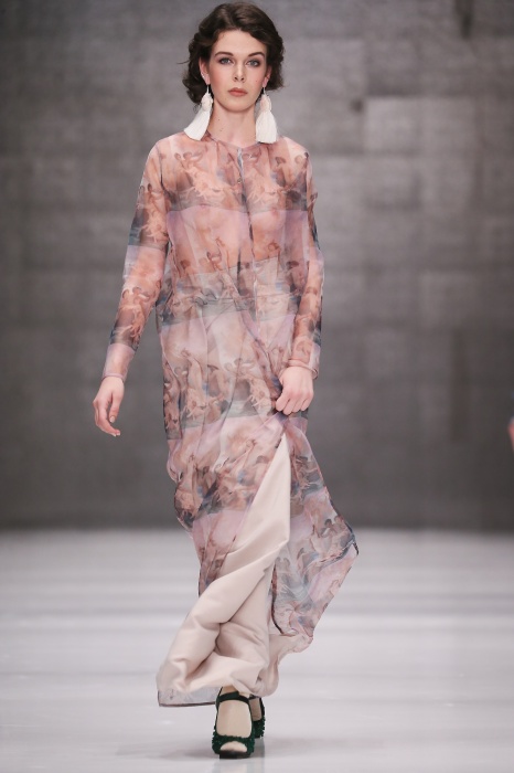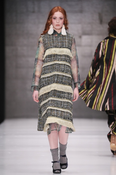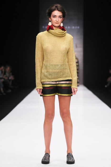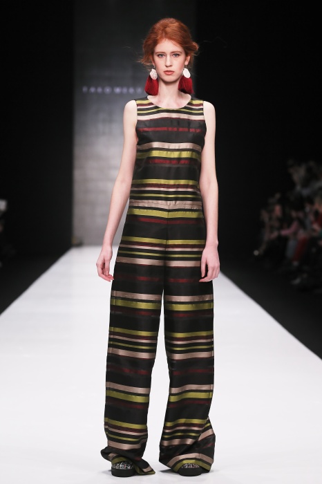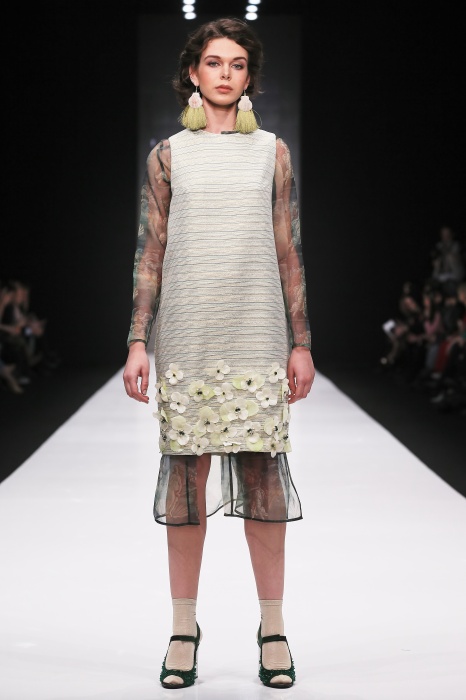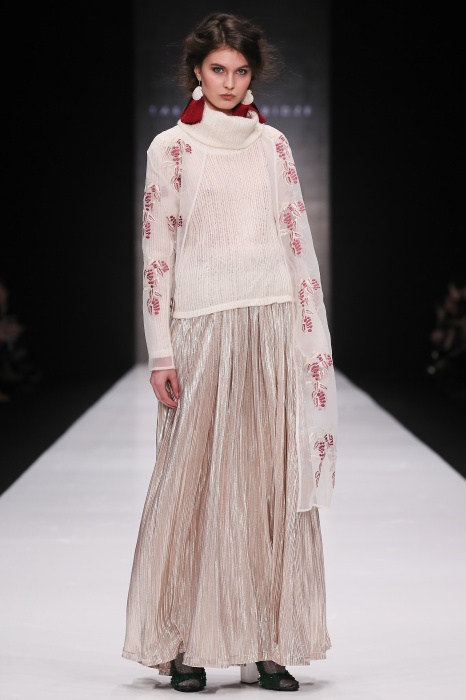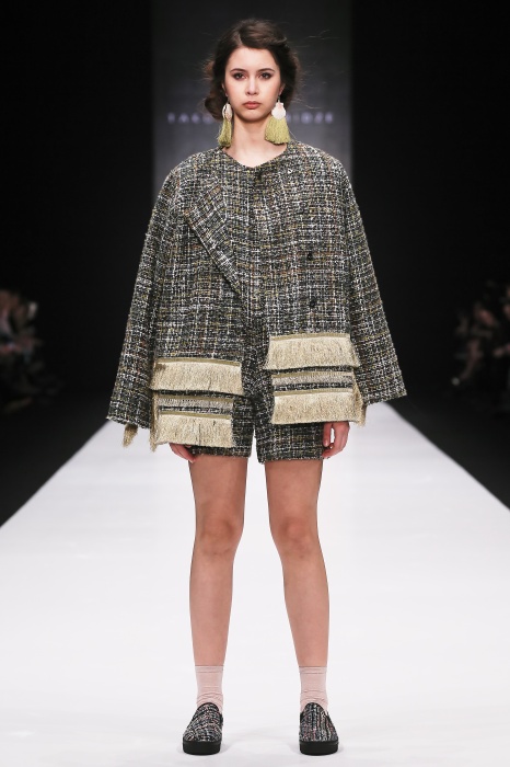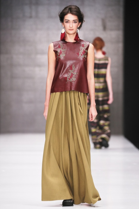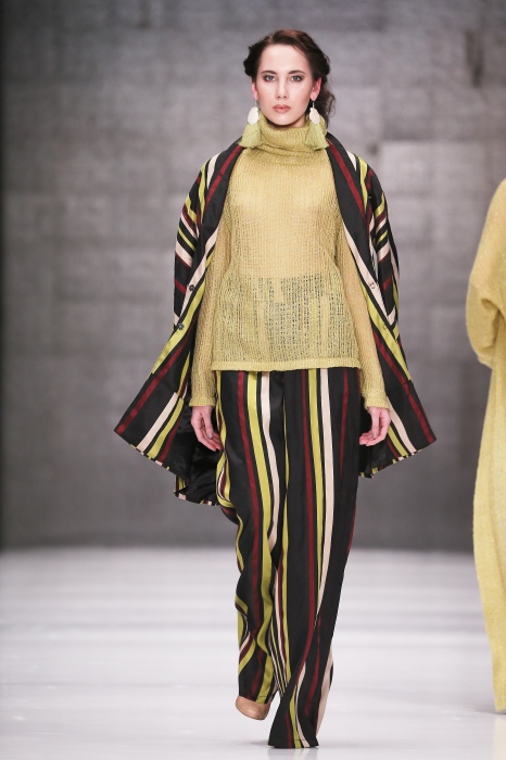 В самобытной коллекции Tako Mekvabidze офисные варианты одежды сочетаются с расслабленными пижамными, летящие ткани – со строгими фактурными, а умеренные цвета – с глубокими. Силуэт модели то подчеркивается, как в комплекте с малахитовыми шелковыми штанами завышенной посадки, то едва угадывается за многослойностью наряда. Полупрозрачные вариан ты одежды одновременно и скрывают, и демонстрируют достоинства, давая простор фантазии.