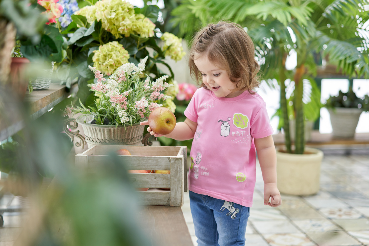 Помимо платьев, конечно, девичья часть коллекции богата и столь любимыми футболками, на которых яркие изображения и образы сменяют друг друга. К ним же идёт целый арсенал брюк разных моделей и фасонов. Девчонки тоже любят бегать, прыгать, кататься на роликах и велосипедах, и здесь юбку или платье лучше не надевать.