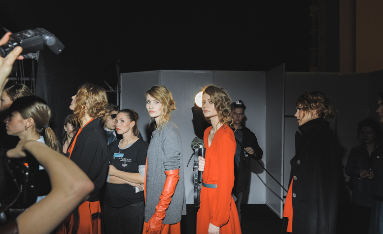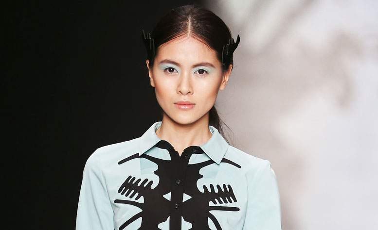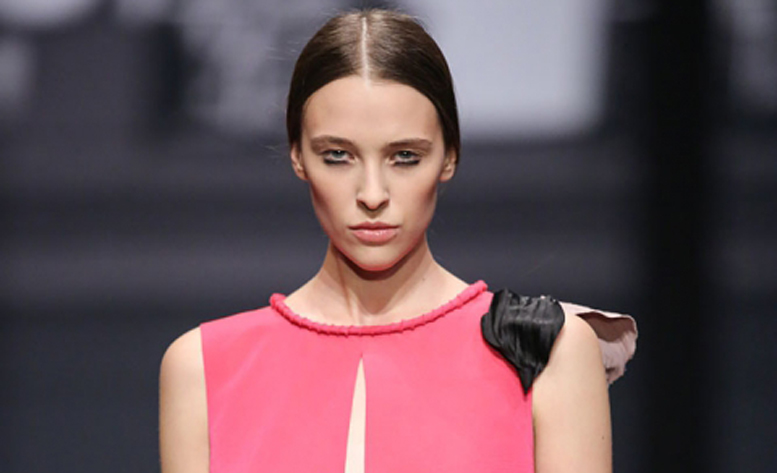 В ньюд-макияже этой весной и летом допустимы яркие штрихи в виде цветных ярких широких стрелок как у Vera Kostyurina, ярко подчеркнутая нижняя линия роста ресниц как у Sergey Sysoev или кукольные ресницы как у Alena Akhmadullina.