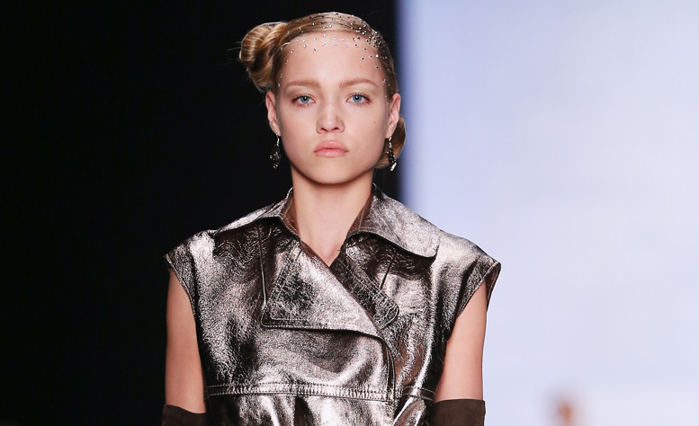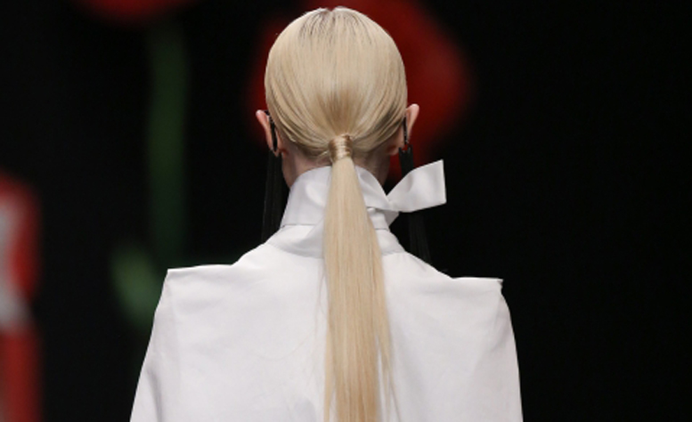 В моде на прически царят гладкие волосы, зачесанные назад, собранные в пучок или в низкий хвост.