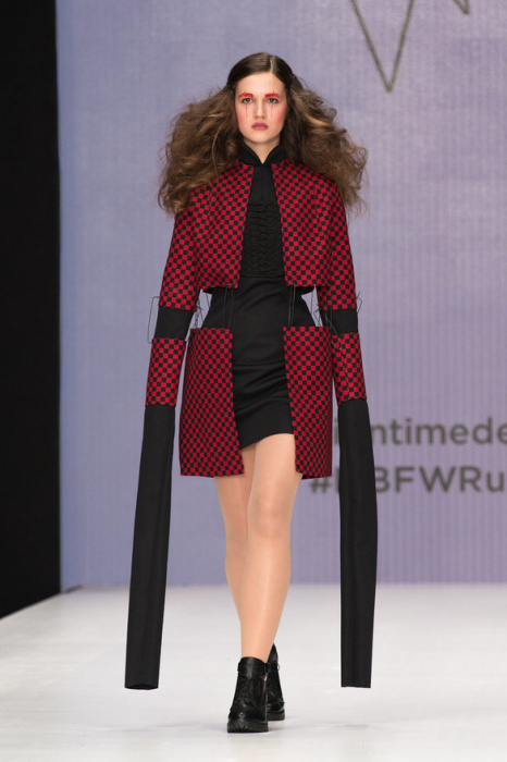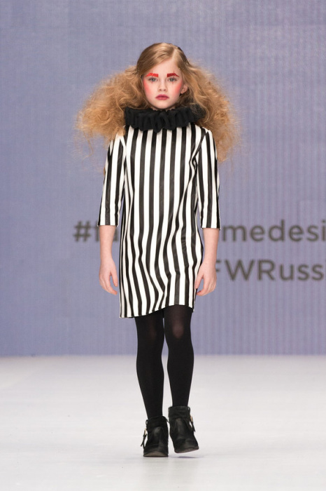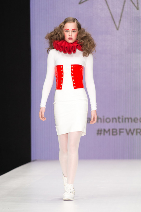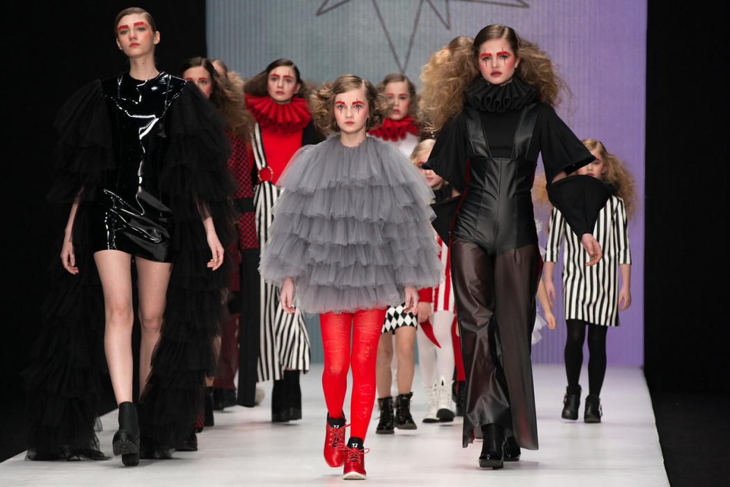 Бренд MILKE представил публике настоящее цирковое шоу с взрослыми и юными моделями, которые вышли на подиум в образах Арлекина. В коллекции модельера Ирины Милке присутствует большое количество рюш, воланов, доминируют шахматный орнамент и вертикальные полоски – последние встречаются как на платьях, так и на брюках. Образы, по большей части выдержанные в белом, красном и черном цветах, декорированы вставкам из винила и пластика, огромными булавками и железными цепями.