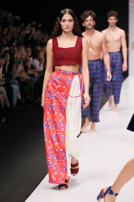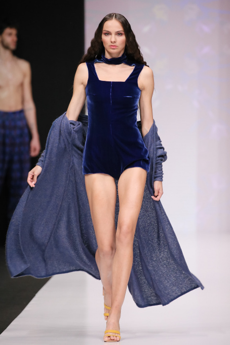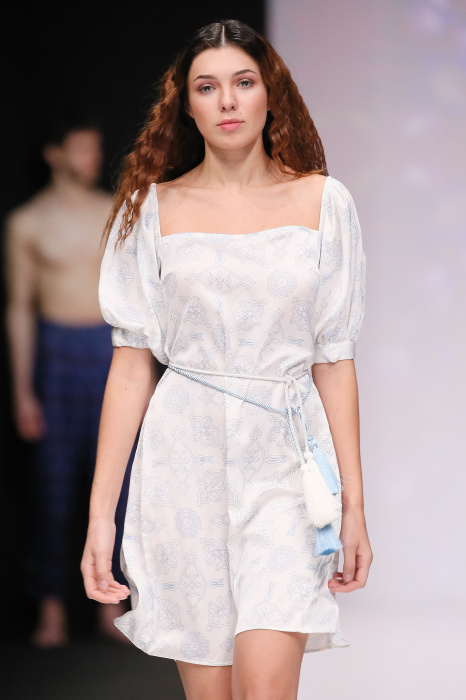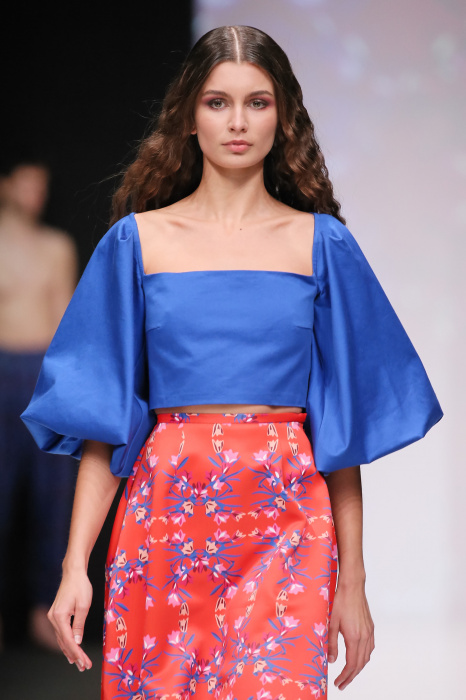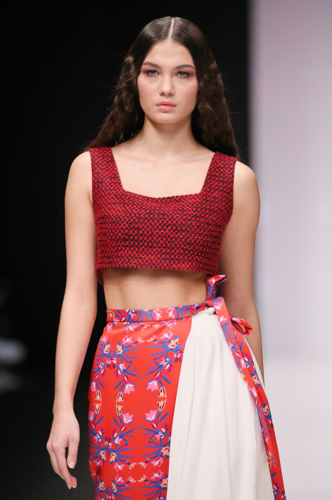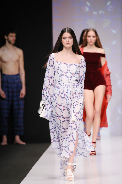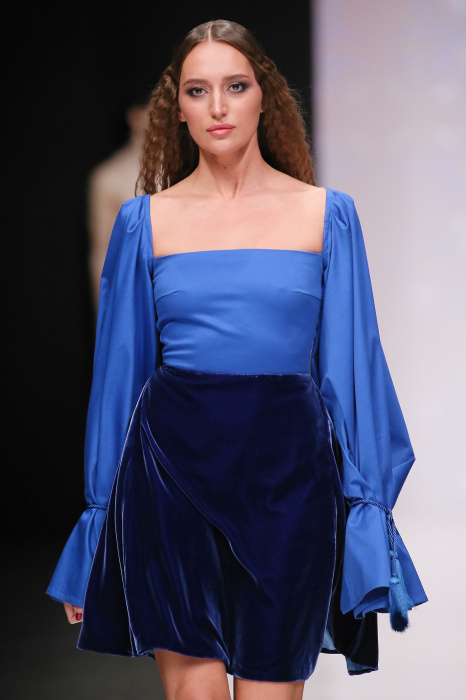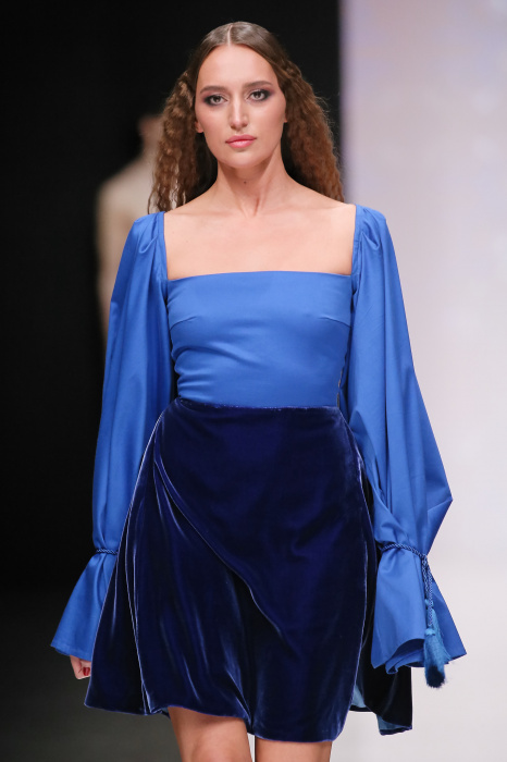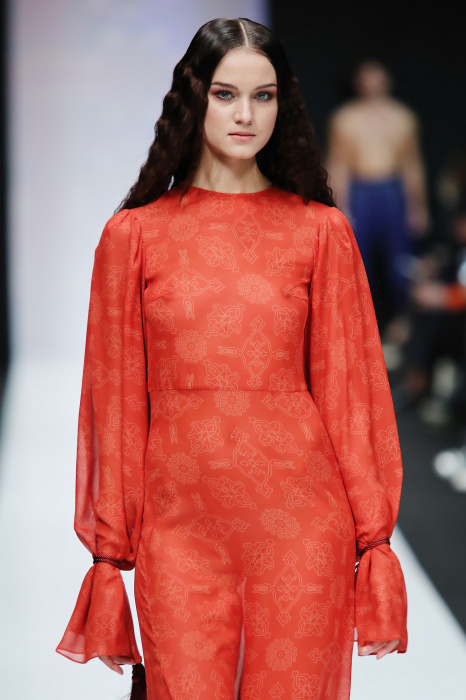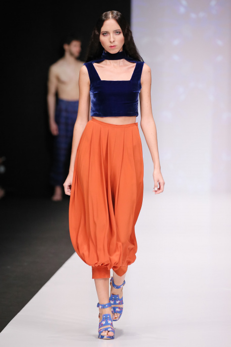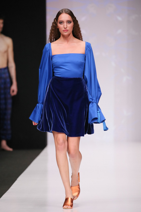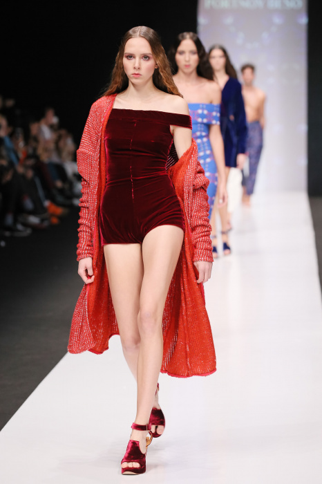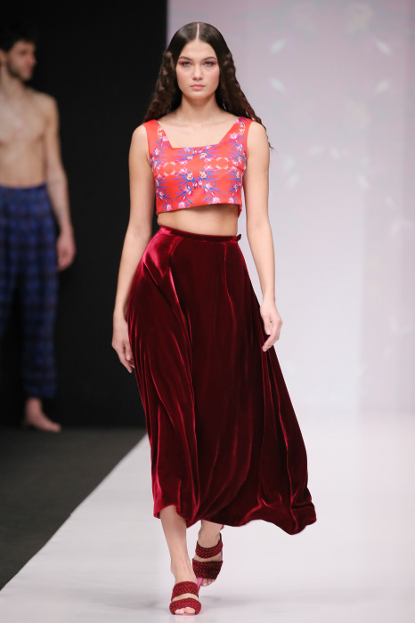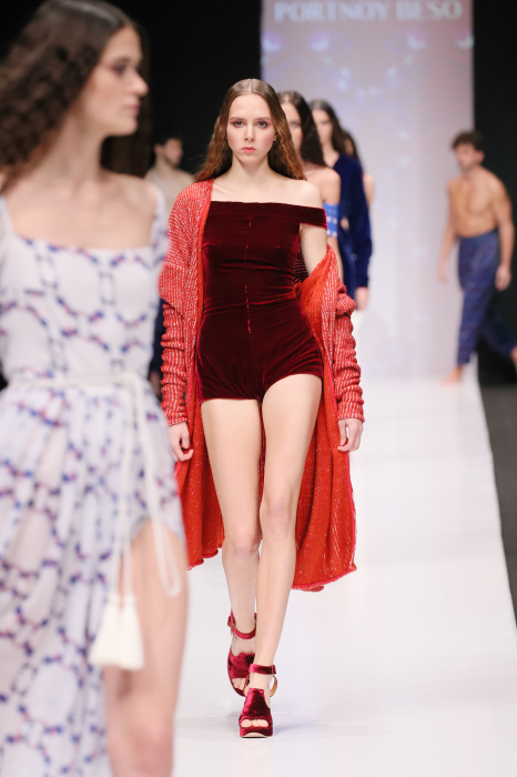 PORTNOY BESO наделил весенние и летние наряды балканским колоритом. Древние орнаменты, щедро рассыпанные по тканям, по-южному насыщенные цвета являются лейтмотивом коллекции. Пронзительный синий, нежная роза, горчица и терракота оттеняют загорелую кожу и создают ощущение праздника. В нарядах от PORTNOY BESO воплотился восточный идеал красоты: тонкая талия, подчеркнутая поясом с кистями, открытые плечи, округлые оверсайз-рукава, тончайшие шаровары и разноцветные шелковые юбки. Среди интересных находок – вельветовые боди и авторская обувь, подобранная по принципу колор блок.