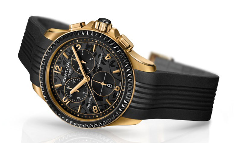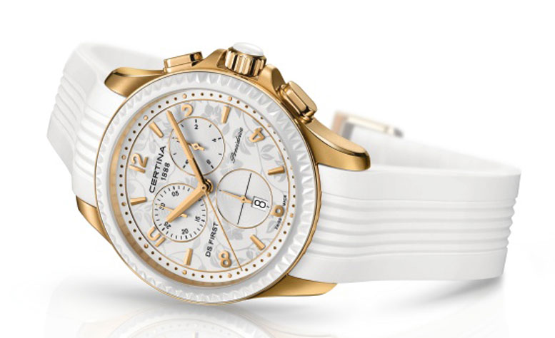 Роскошные и одновременно восхитительно спортивные, новые часы DS First Lady Ceramic неизбежно притягивают взгляды окружающих. Сатинированный 38-мм корпус с полированными ушками украшен безелем с зубчатым окаймлением из белой (или черной) керамики. Эти яркие детали безупречно сочетаются с полированными кнопками и заводной головкой с керамической отделкой на верхушке. На заднюю крышку корпуса часов нанесено изображение исторического логотипа CERTINA в виде панциря черепахи. Под сапфировым стеклом с двусторонним антибликовым покрытием контрастность эффектного белого (или черного) циферблата с тремя счетчиками хронографа и элементов индикации с PVD-покрытием из розового золота подчеркивается тонким цветочным узором, придающим модели женственность и изящество. Каждый из трех счетчиков, используемых, соответственно, для 30-минутного и 1/10-секундного хронометража и указания секунд текущего времени, имеет позолоченную окантовку, гармонируя со стрелками, арабскими цифрами и метками этой очень женственной модели. Центральная секундная стрелка хронографа скользит по шкале с точечными метками с розовым PVD-покрытием, обрамляющей циферблат, при этом саму шкалу опоясывает изящный позолоченный ободок. Окошко даты помещено внутрь малого секундного указателя в положении «6» часов.