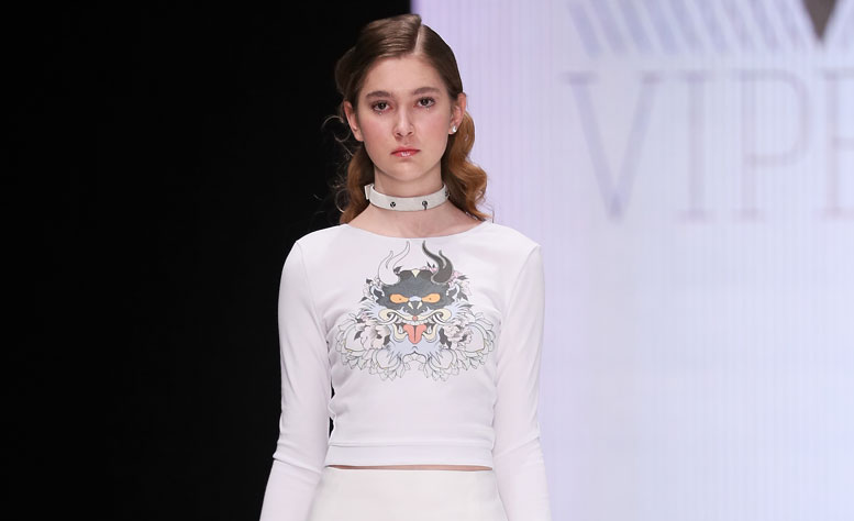 Еще один дебютант на Неделе моды – молодой бренд VIPERS сестер Кати и Веры Вайпер. Грациозные белые платья из шифона и тафты, юбки с низким клешем, пальто цвета дымки с декоративными молниями построены по принципу асимметрии. Дизайнеры творчески подошли к оформлению подолов, разнообразив их широкими оборками и воланами, а рукава пальто расшили полосами цветного меха. Для коллекции разработан специальный принт, концептуально связанный с названием бренда – голова змея на фоне лотоса. Он использован не только в качестве рисунка тканей, но и в виде текстильных аппликаций. В целом линия очень разнообразная и чувственная за счет обилия волн, тканей с мягким сиянием, глубоких декольте и разрезов.