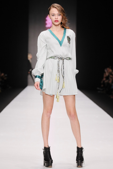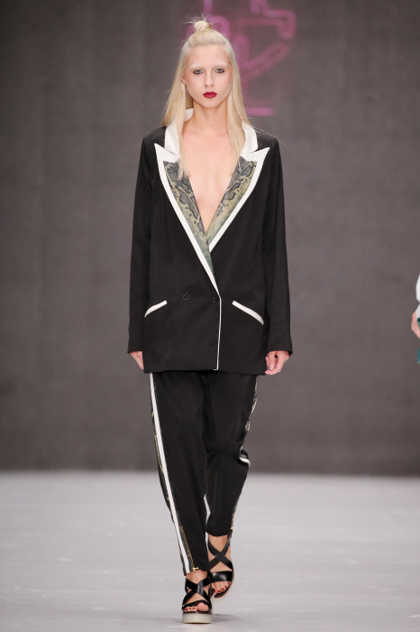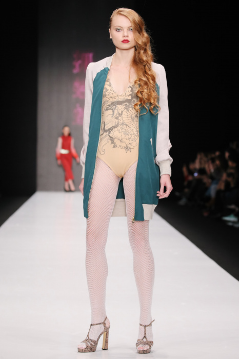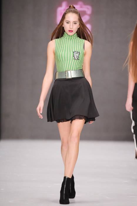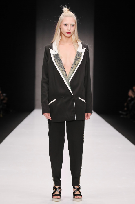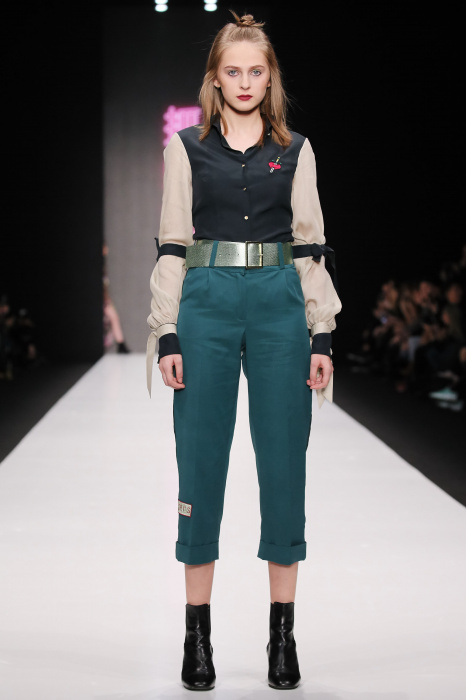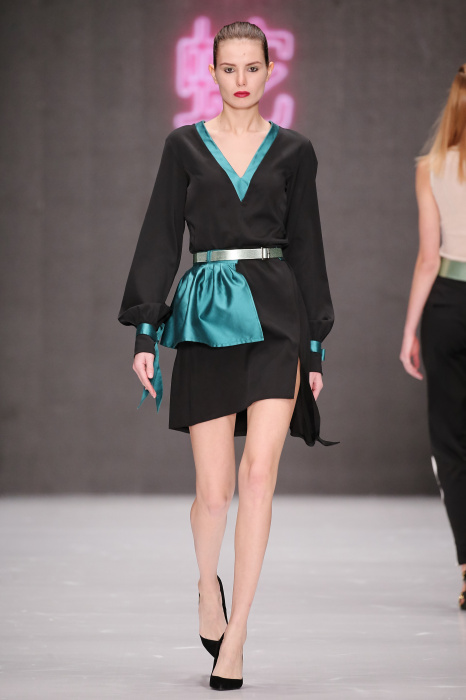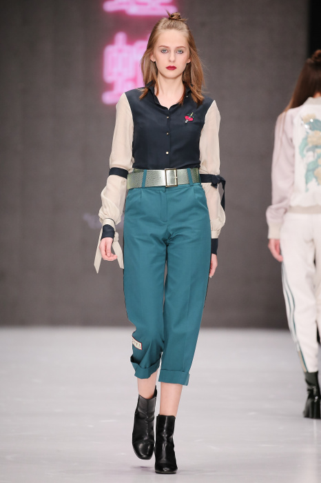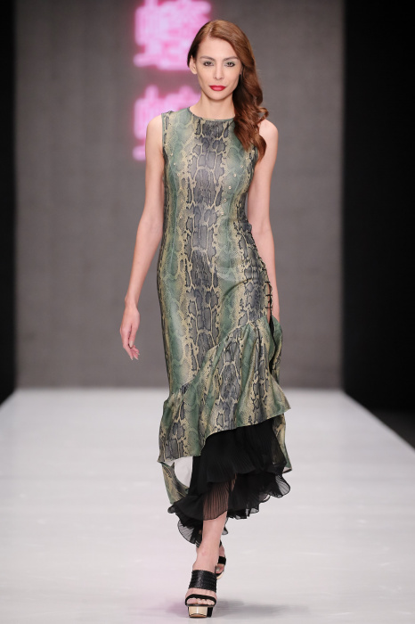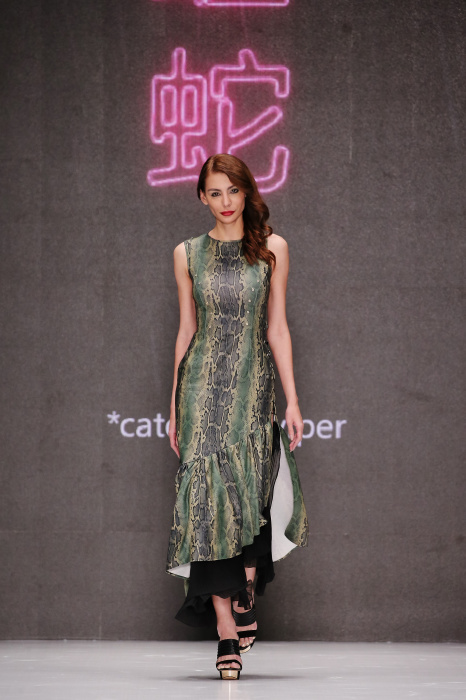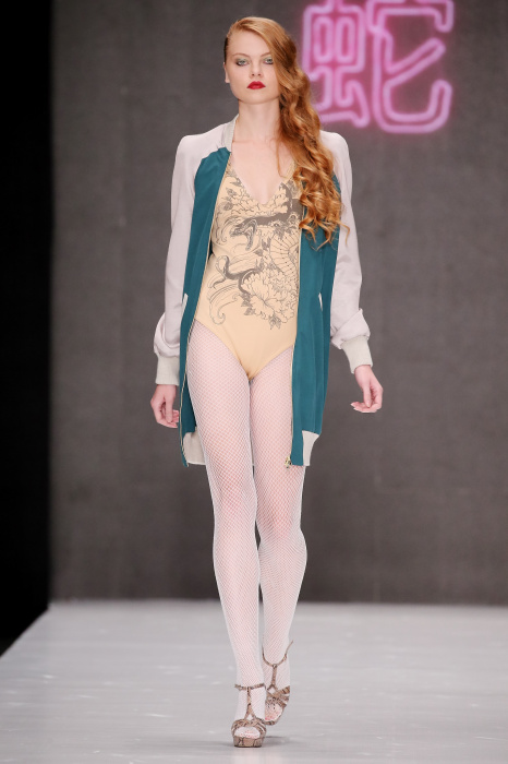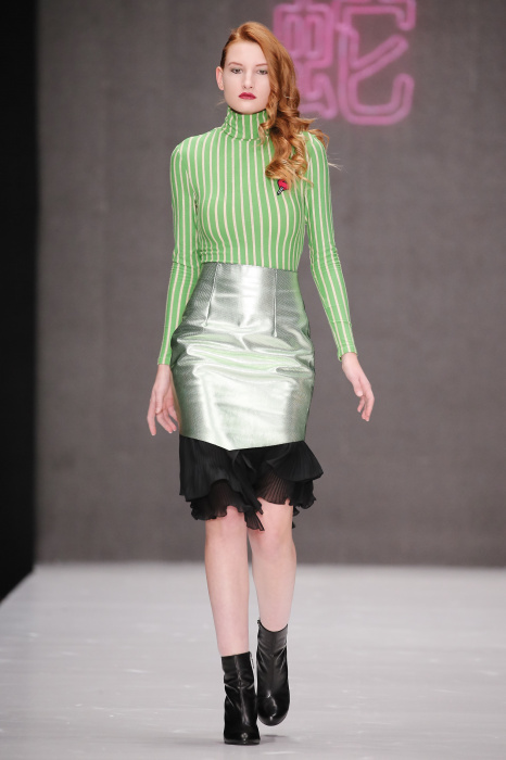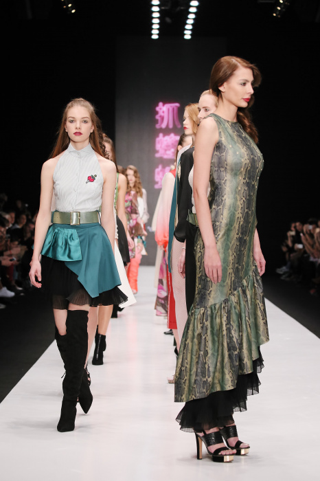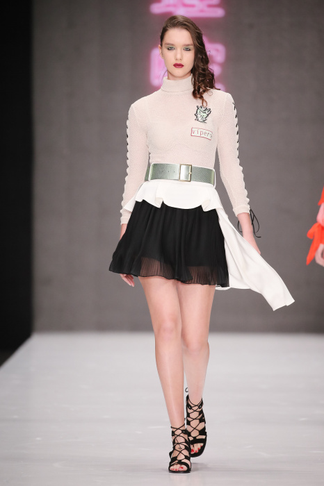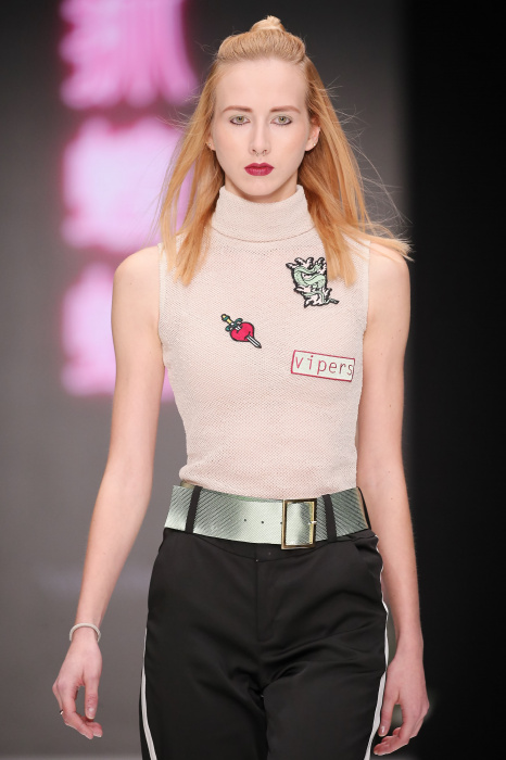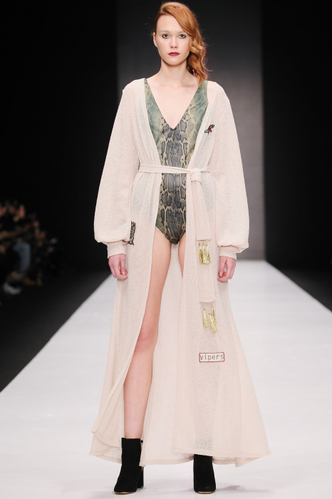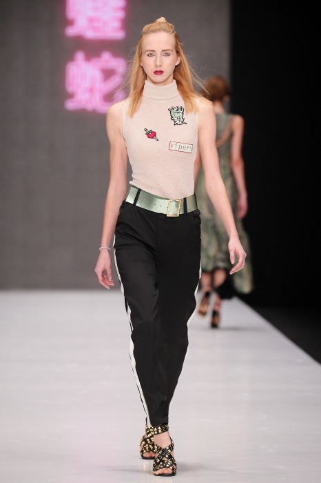 «Catch the viper» от VIPERS – история родом из Азии. Предваряли показ иллюстрации в восточном стиле и китайские иероглифы. Модели скользили по подиуму, неуловимые как змеи в траве, как рыбы в озере или ветер в саду. Эти образы рождаются из цветовой палитры: зеленый металлик, зеленые полосы, градиент, подобный окраске карпов кои, небесный голубой, характерное для азиатского стиля сочетание красного и черного. Сестры Вайпер стилизуют баски под самурайский костюм, одевают моделей в бомберы, брюки с лампасами и гетры на манер азиатских школьниц. В коллекции есть строгие силуэты с американской проймой и брюками с высокой талией и более романтичные с епископскими рукавами, глубокими V-образными вырезами, многоуровневыми юбками. Большинство моделей были украшены символичными поясами с зеленым сиянием.