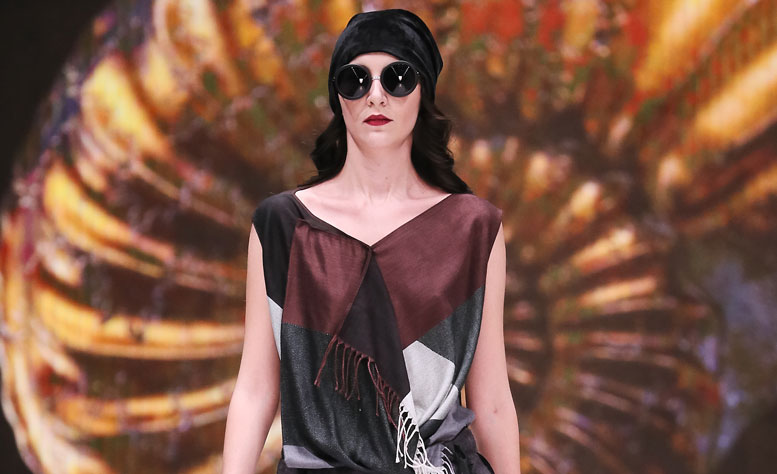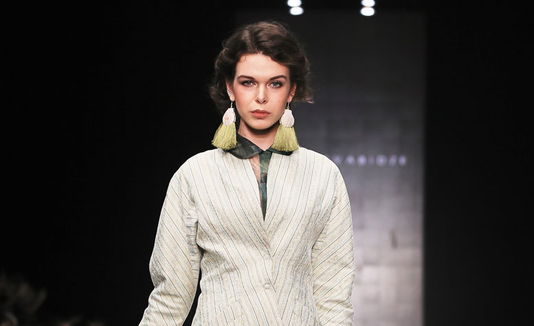 В самобытной коллекции Tako Mekvabidze офисные варианты одежды сочетаются с расслабленными пижамными, летящие ткани – со строгими фактурными, а умеренные цвета – с глубокими. Силуэт модели то подчеркивается, как в комплекте с малахитовыми шелковыми штанами завышенной посадки, то едва угадывается за многослойностью наряда. Полупрозрачные варианты одежды одновременно и скрывают, и демонстрируют достоинства, давая простор фантазии.