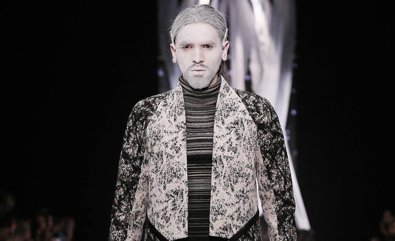 В своей новой коллекции Gaudeamus DIMANEU воспел холодную и прекрасную природу родной Сибири, столкнув ее хаотичность и непримиримость со строгостью готики. Границы тепла и холода находят свое отражение в цветовой гамме: одежда цвета замерзшей земли, ночного неба, контрастного светло-розового и лица моделей цвета снежных просторов. Дизайнер верен своему стилю – продолжает трансформировать и вытягивать силуэты, использовать асимметрию, фирменный принт, строгие линии и заключать в корсеты верх знаковых платьев. В этой коллекции Дима использует ожерелья, каффы и диадемы в виде острых кристаллов от художника Алека Раоса. Традиционно показ прошел в форме перформанса.