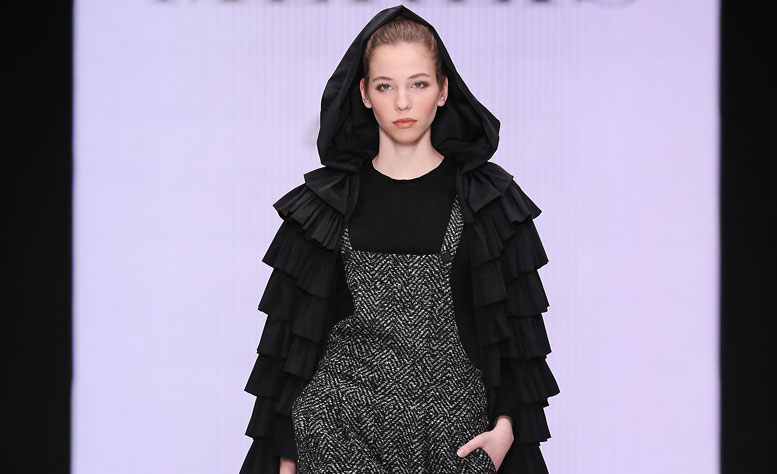 Следом свою коллекцию SOFT BUT SURE продемонстрировала Julia Dalakian. Классический силуэт, строгие черные костюмы, разбавленные сдержанным бордовым акцентом, легкая дымка и серебристый металлик – городской шик вступает в свои владения и приобретает интеллектуальную оправу. Свободные брюки соседствуют с юбками, украшенными длинными кисточками из бахромы, кожей цвета шоколада и аккуратными ажурными узорами. Мягко, но уверено, все в точности соответствует названию.