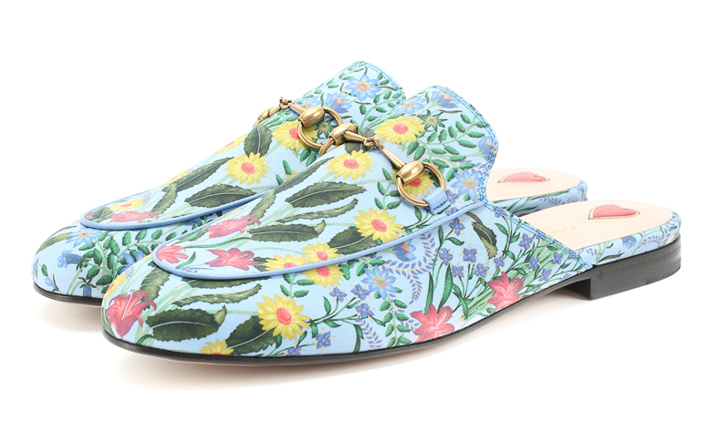 Голубые сабо Princetown сшиты из гладкого текстиля с обновленным принтом Flora. Его классическая версия была создана иллюстратором Витторио Аккорнеро специально для принцессы Монако Грейс Келли.