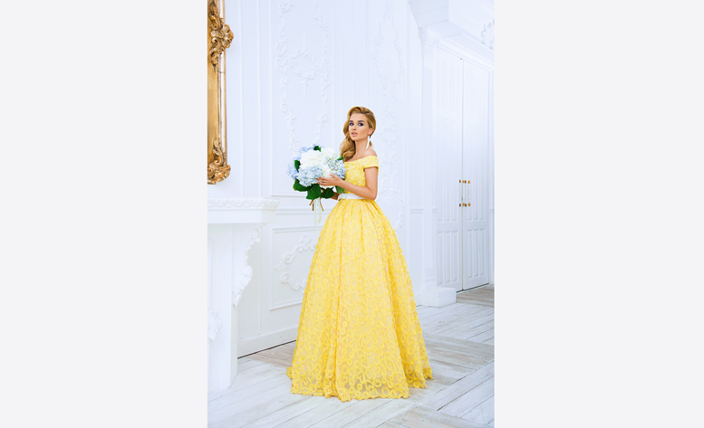 Удачным выбором на любое торжество станет роскош- ное платье нежно-лимон- ного оттенка из эксклю- зивной ткани с ажурной вышивкой. Платье идеально садится по фигуре и создает жен- ственный силуэт. Ре- комендуем дополнить образ аксессуарами ручной работы от Bella Potemkina