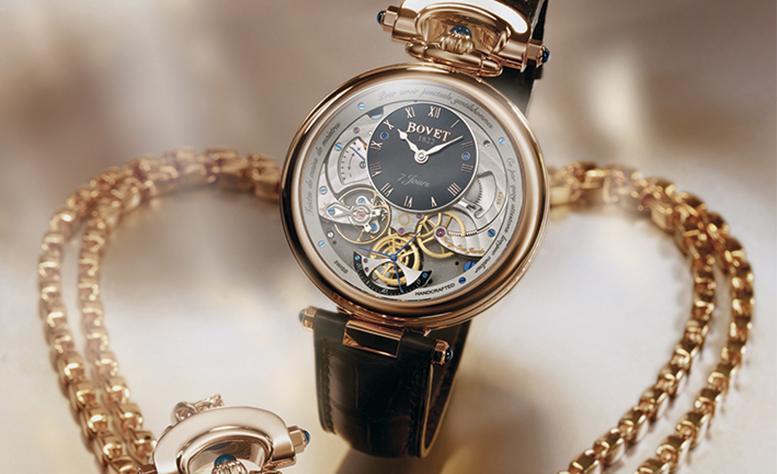 Новинка Bovet покоряет своей многофункциональностью: благодаря корпусу со специальной системой Amadeo она может стать часами как наручными, так и настольными, а также способна превращаться в колье – основа, к которой крепятся часы, идет в комплекте. Под корпусом из розового золота скрывается циферблат из перламутра и эмали гильоше, а также мануфактурный калибр Bovet с ручным заводом и семидневным запасом хода.