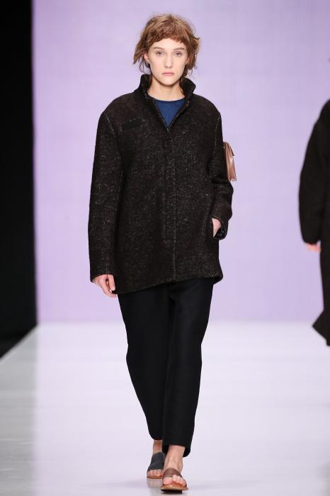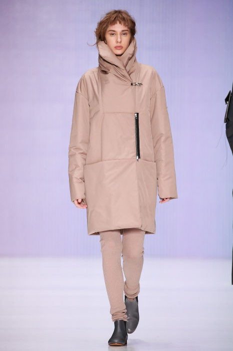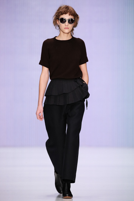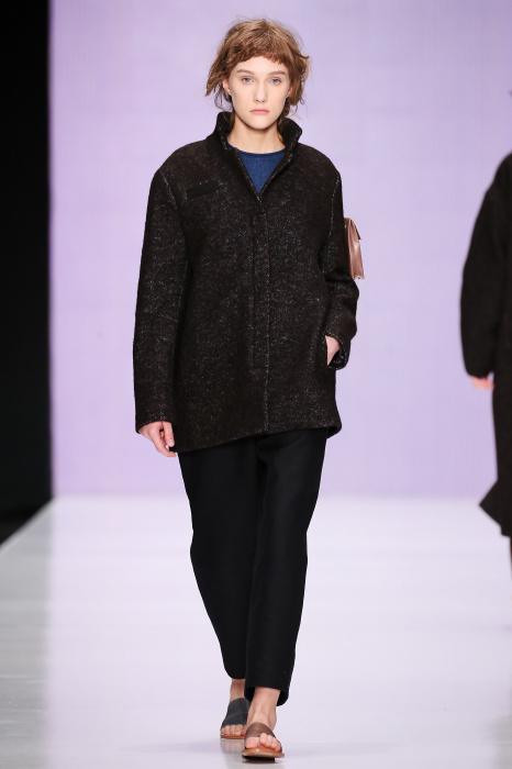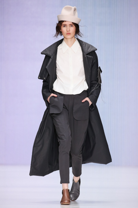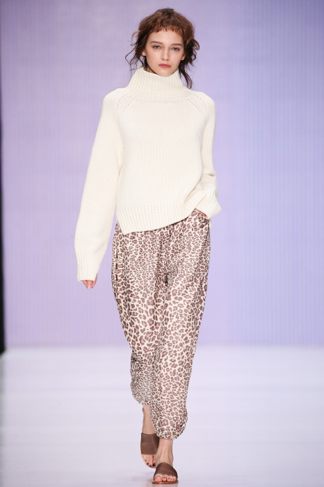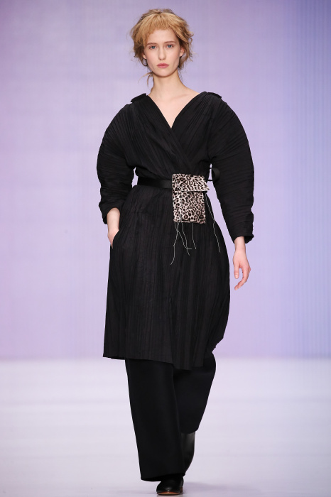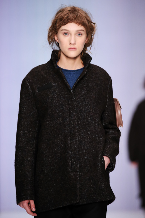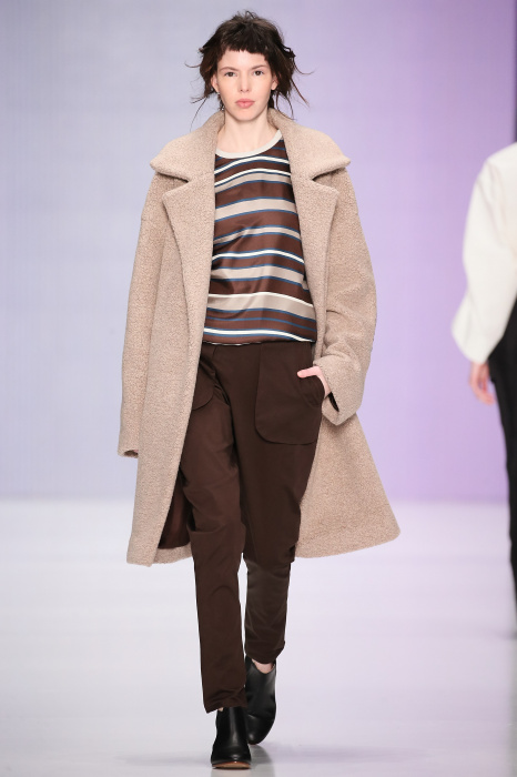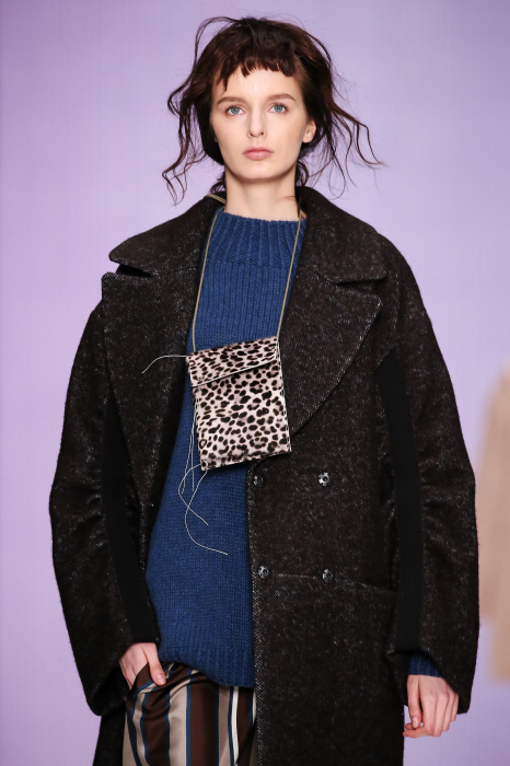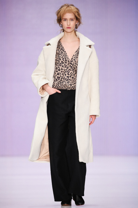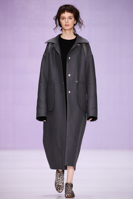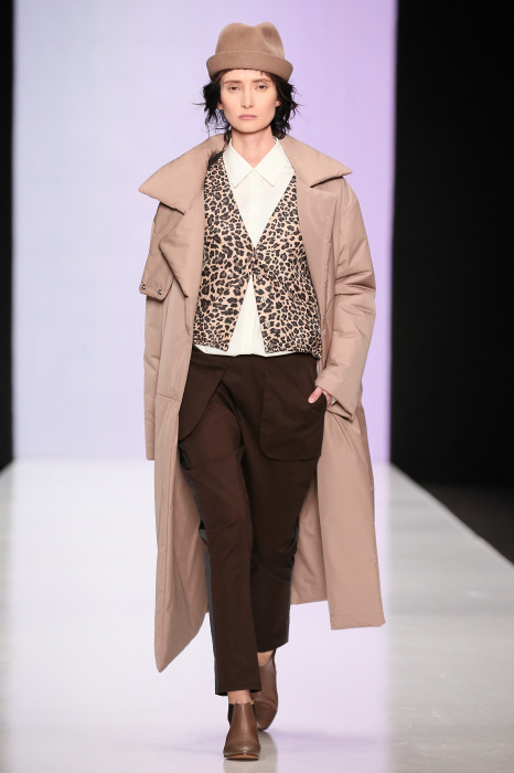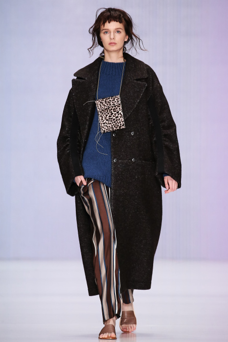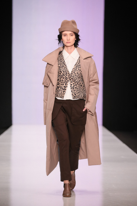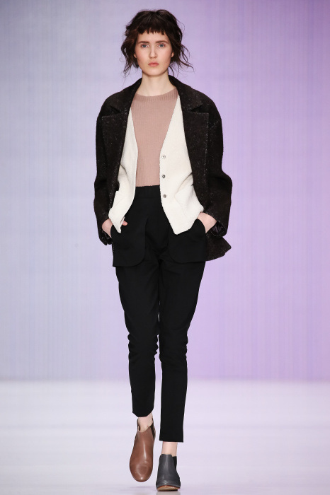 Ю Л И Я НИКОЛАЕВА создает интеллектуальную оболочку для городской жительницы. Прямой крой, трапеции, один или два основных тона – из кажущейся простоты рождаются многослойные образы. Дополняют иллюзию лаконичные аксессуары – поясные сумки, рюкзаки и клатчи. По-зимнему темные, но теплые и густые оттенки коричневого оттеняют цвет ледяного кофе с молоком. В декоре тканей использованы композиции из полос и животные принты. Шерстяные пальто с объемными плечами и шляпы напоминают одежды горцев. Несмотря на эту нотку, все черты фирменного стиля налицо: правая и левая половина немного различаются по тону, брюки и платья усыпаны карманами, а девушки одеты в рубашки мужского кроя.