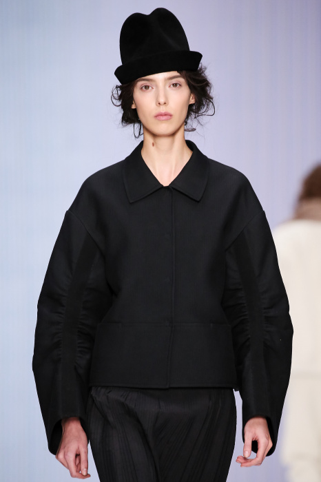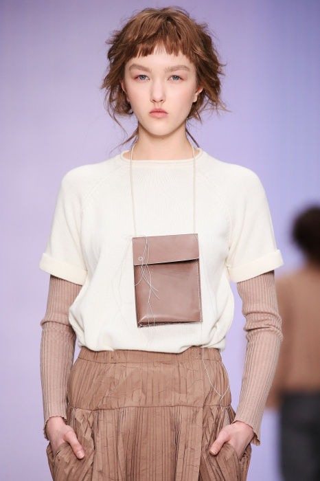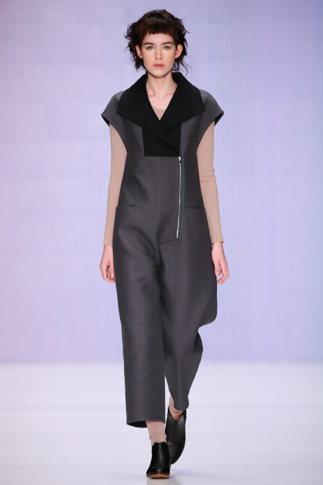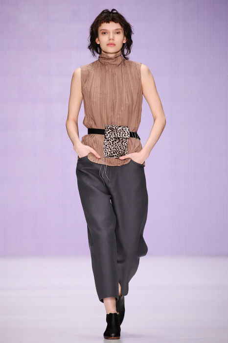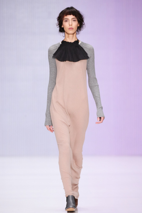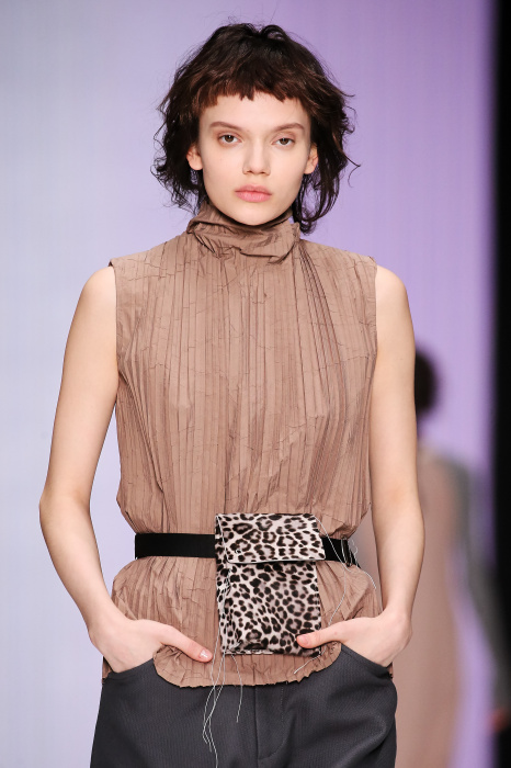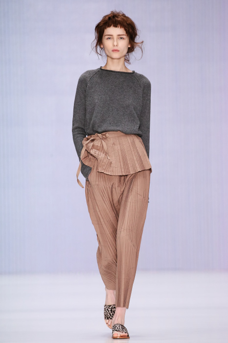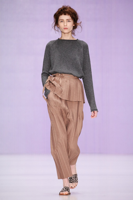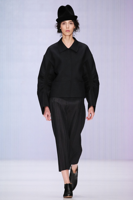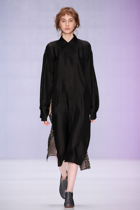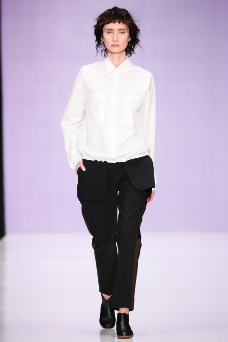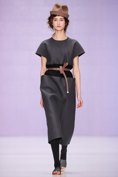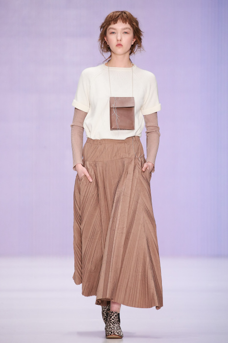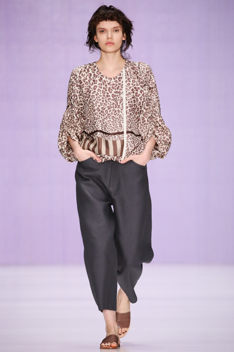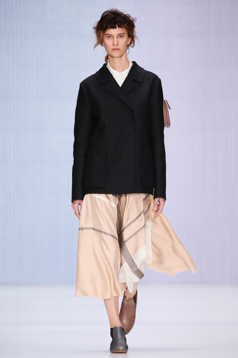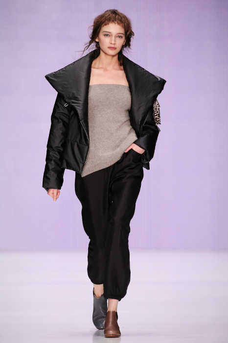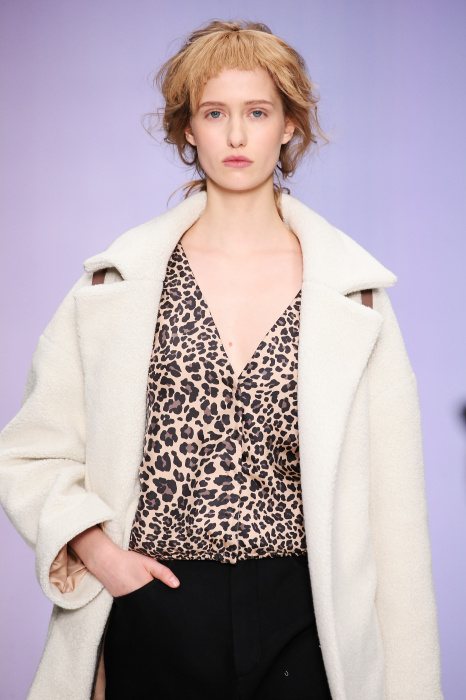 Ю Л И Я НИКОЛАЕВА создает интеллектуальную оболочку для городской жительницы. Прямой крой, трапеции, один или два основных тона – из кажущейся простоты рождаются многослойные образы. Дополняют иллюзию лаконичные аксессуары – поясные сумки, рюкзаки и клатчи. По-зимнему темные, но теплые и густые оттенки коричневого оттеняют цвет ледяного кофе с молоком. В декоре тканей использованы композиции из полос и животные принты. Шерстяные пальто с объемными плечами и шляпы напоминают одежды горцев. Несмотря на эту нотку, все черты фирменного стиля налицо: правая и левая половина немного различаются по тону, брюки и платья усыпаны карманами, а девушки одеты в рубашки мужского кроя.