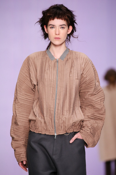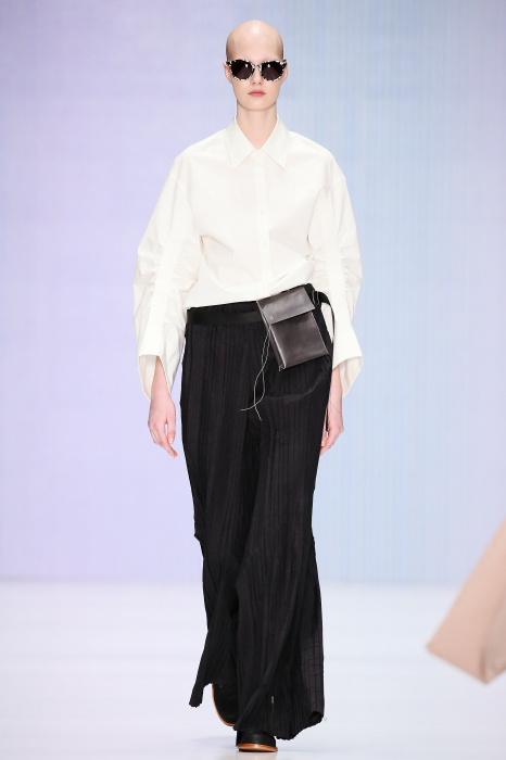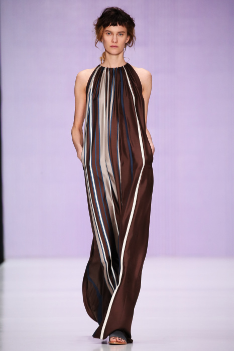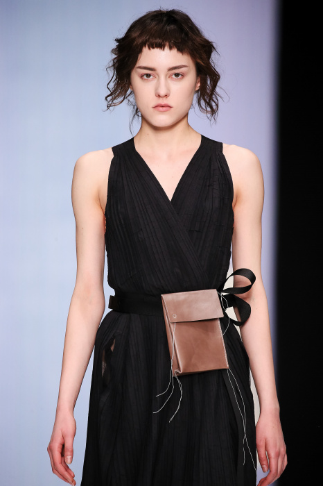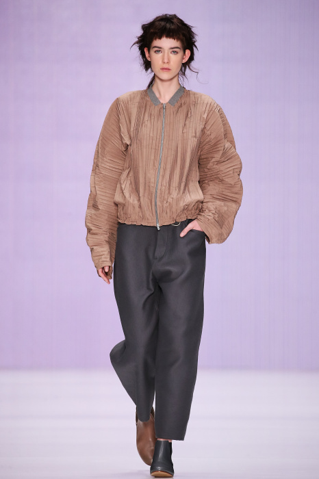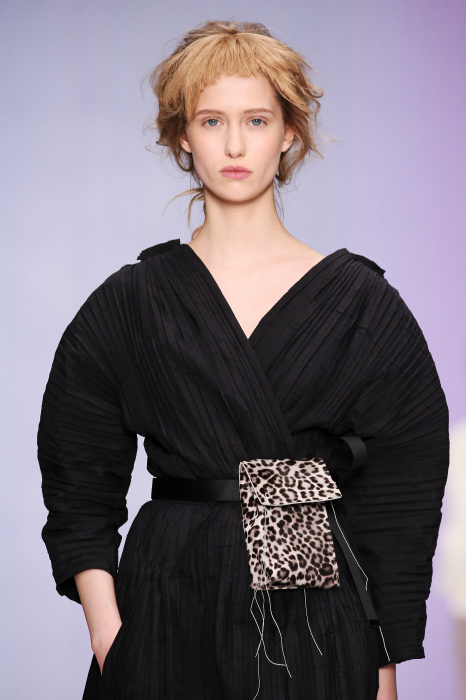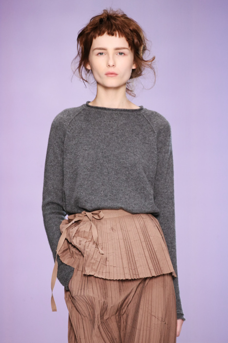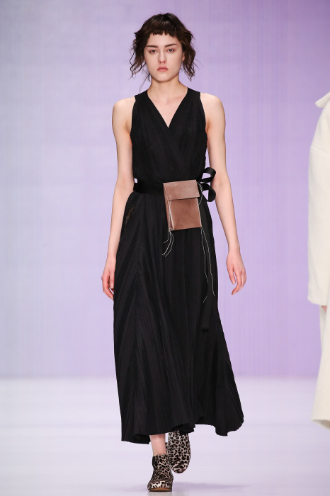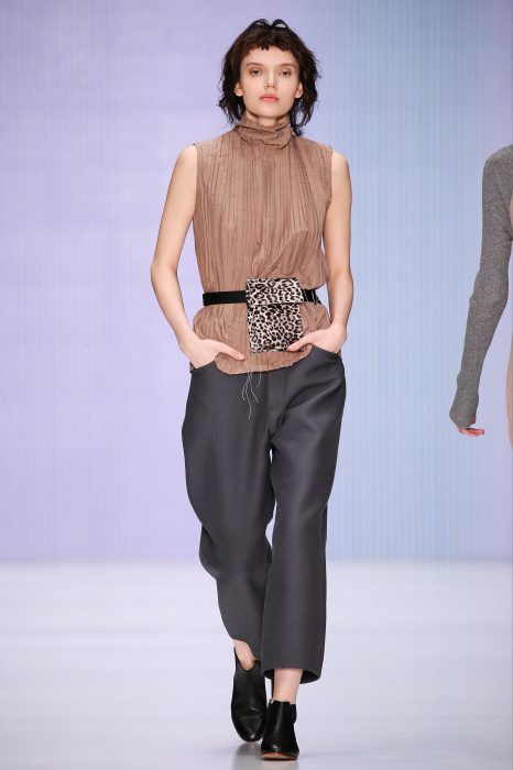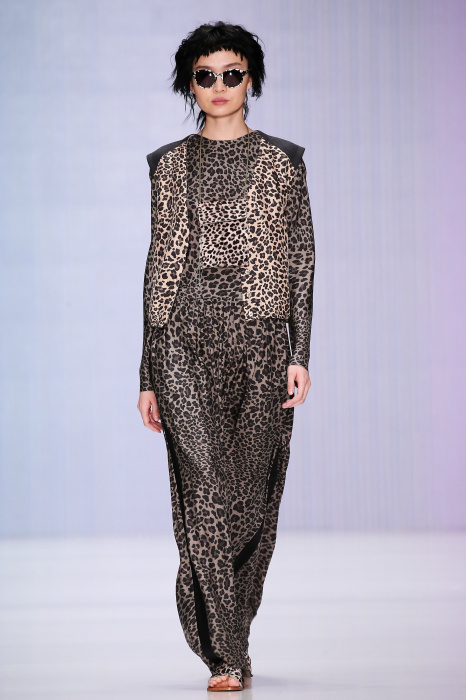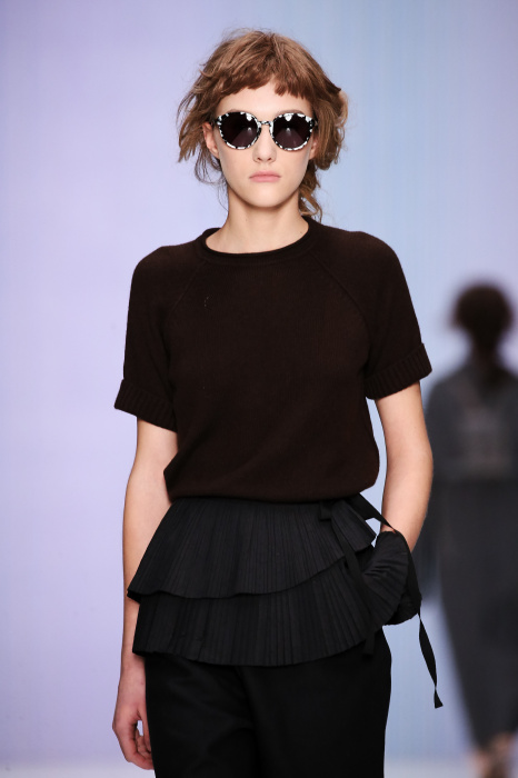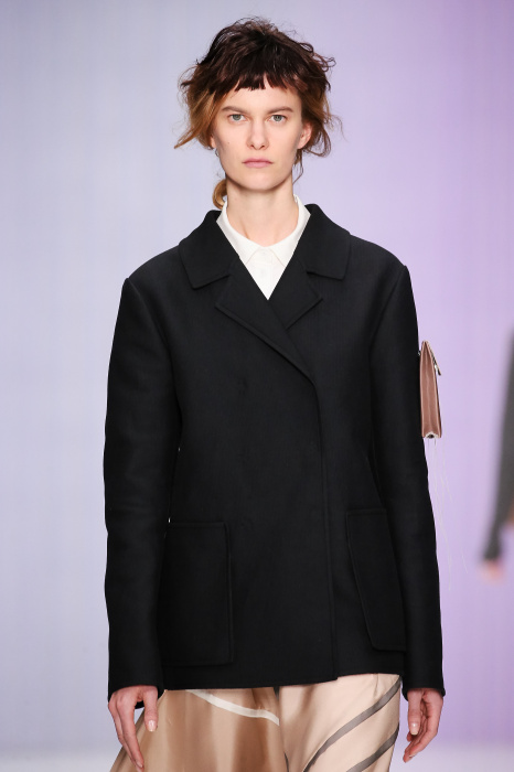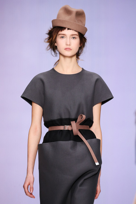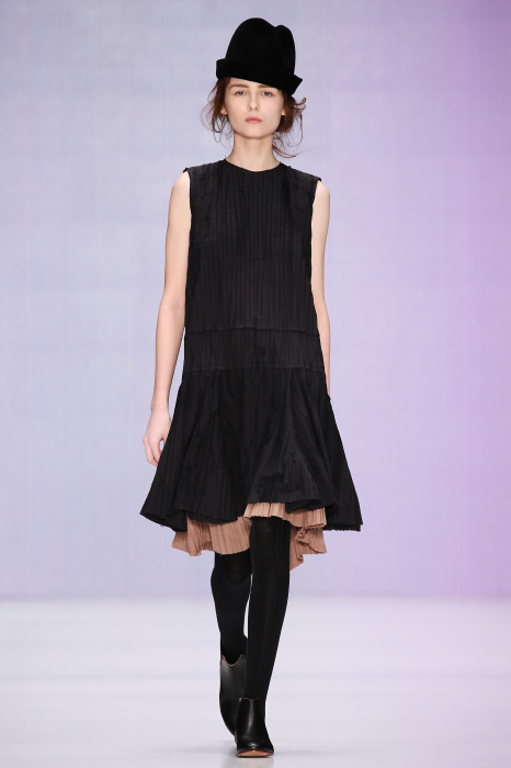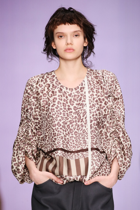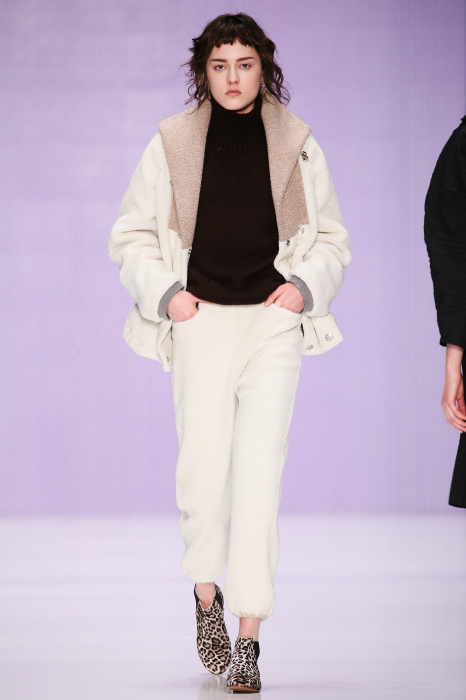 Ю Л И Я НИКОЛАЕВА создает интеллектуальную оболочку для городской жительницы. Прямой крой, трапеции, один или два основных тона – из кажущейся простоты рождаются многослойные образы. Дополняют иллюзию лаконичные аксессуары – поясные сумки, рюкзаки и клатчи. По-зимнему темные, но теплые и густые оттенки коричневого оттеняют цвет ледяного кофе с молоком. В декоре тканей использованы композиции из полос и животные принты. Шерстяные пальто с объемными плечами и шляпы напоминают одежды горцев. Несмотря на эту нотку, все черты фирменного стиля налицо: правая и левая половина немного различаются по тону, брюки и платья усыпаны карманами, а девушки одеты в рубашки мужского кроя.